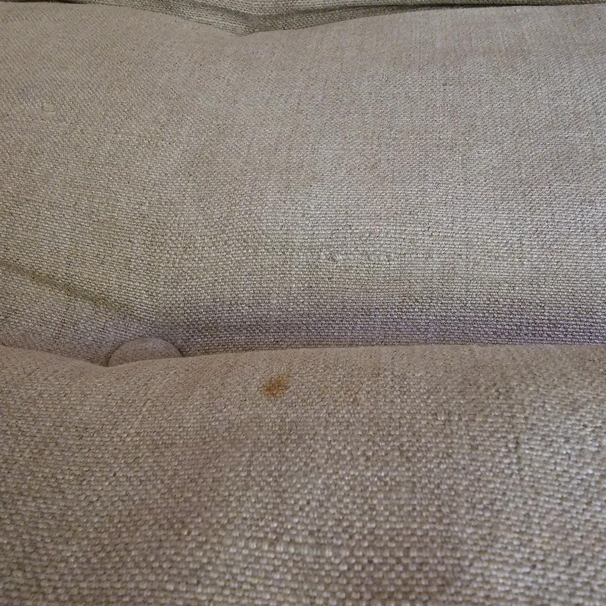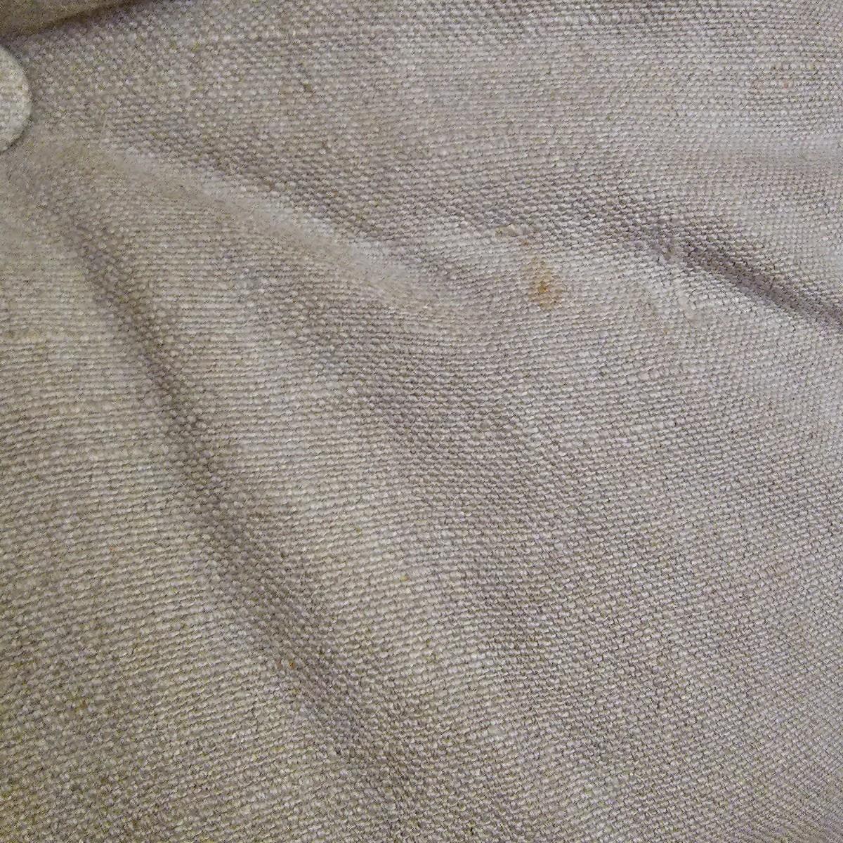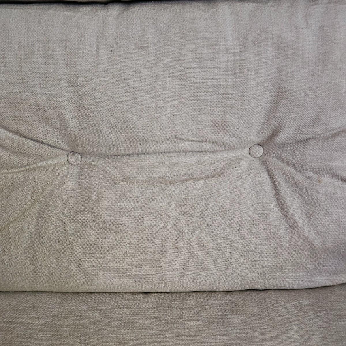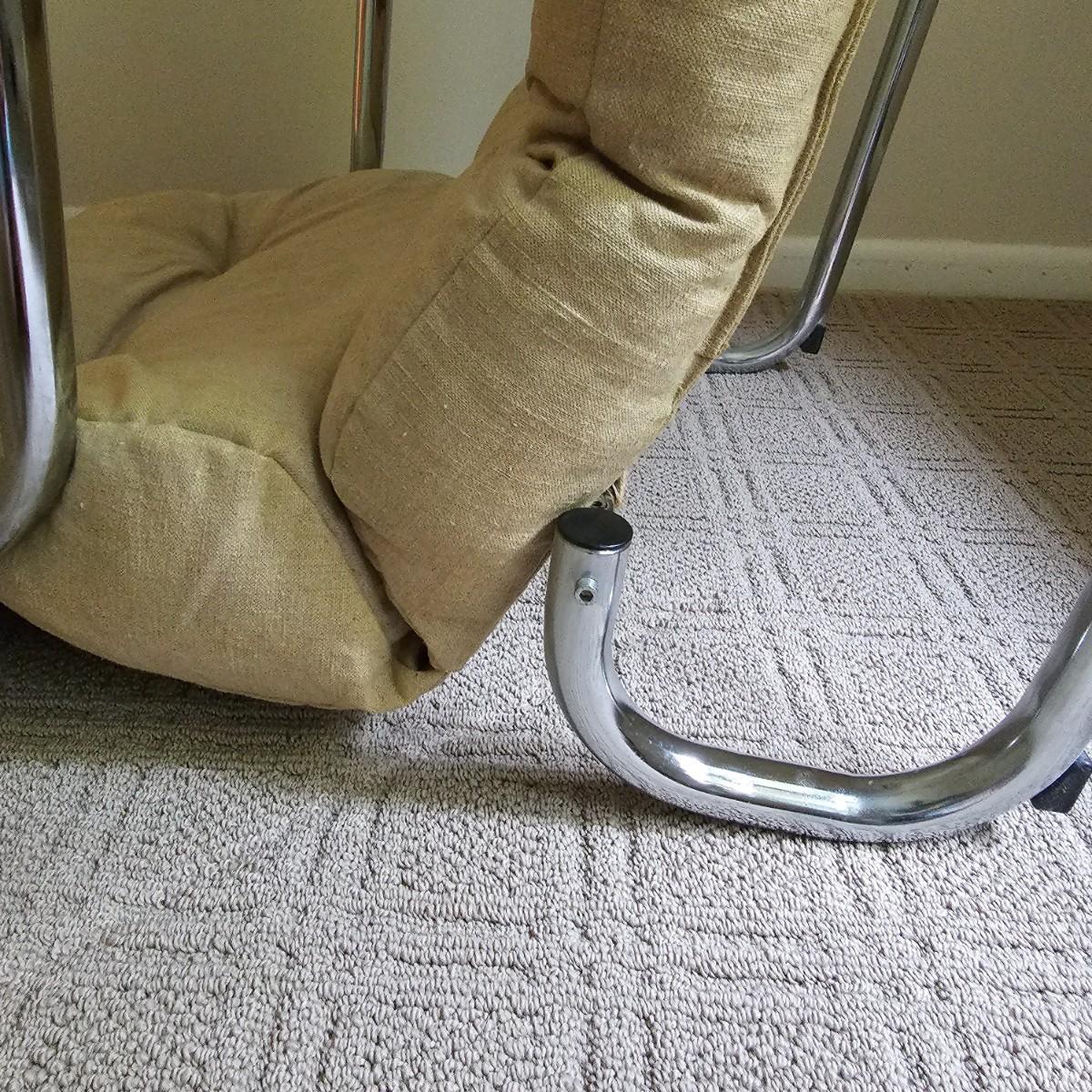 One tan canvas sling style chair with silver metal frame. Button tufting and cushioned this chair measures 26" x 31" x 34"H, has a seat height of 14". Some small spots on chair cover, see photos for details. Local pickup only.