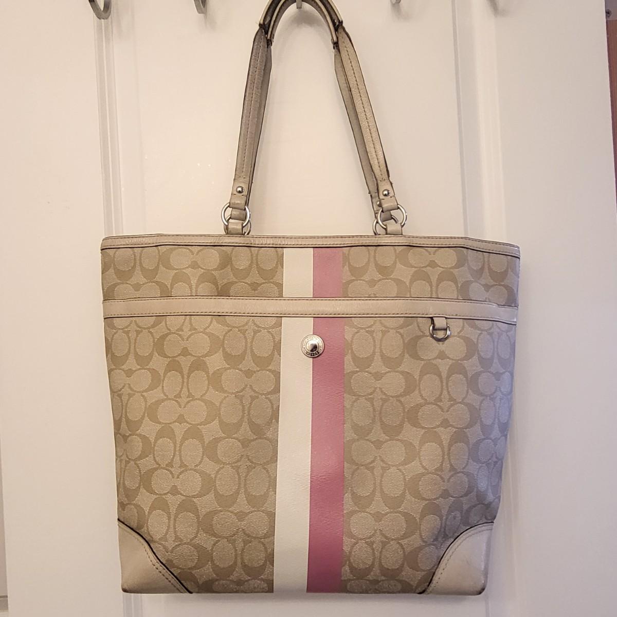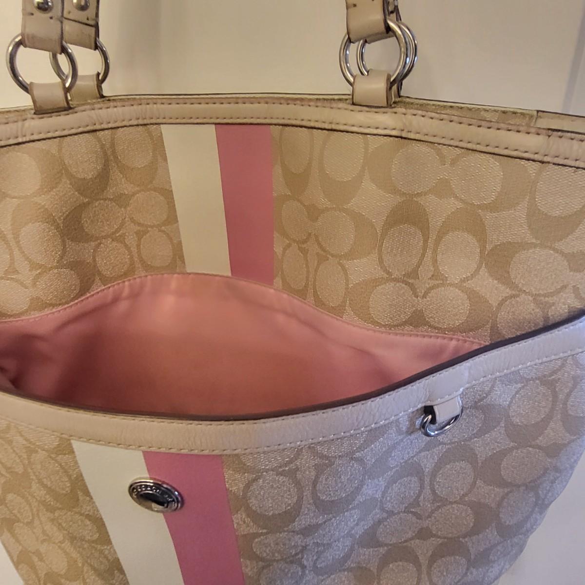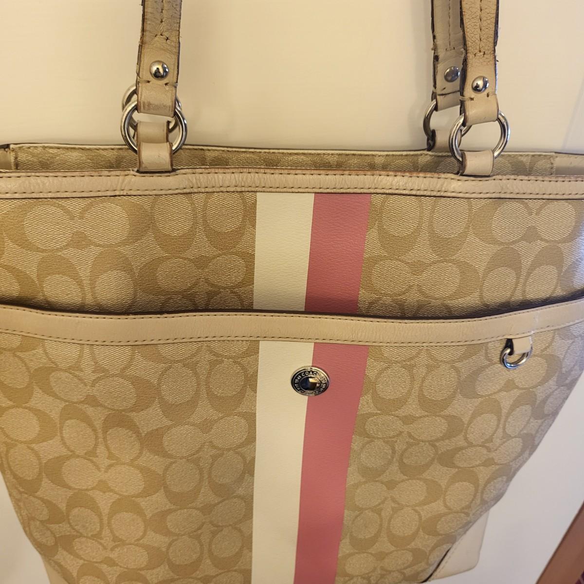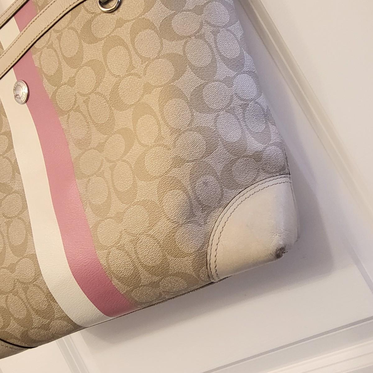 Pre-loved tan signature & pink stripe Coach tote bag. Visible wear to bottom corners and straps (See photos) but overall fair condition. Good size, roomy tote measures 17" wide x 13" tall x 3" deep.