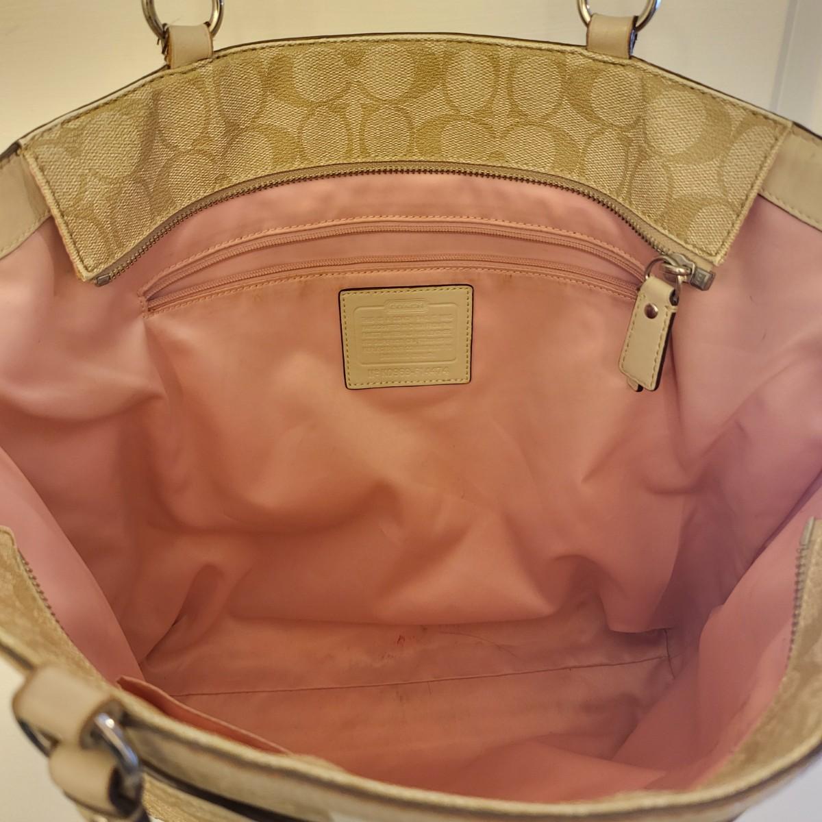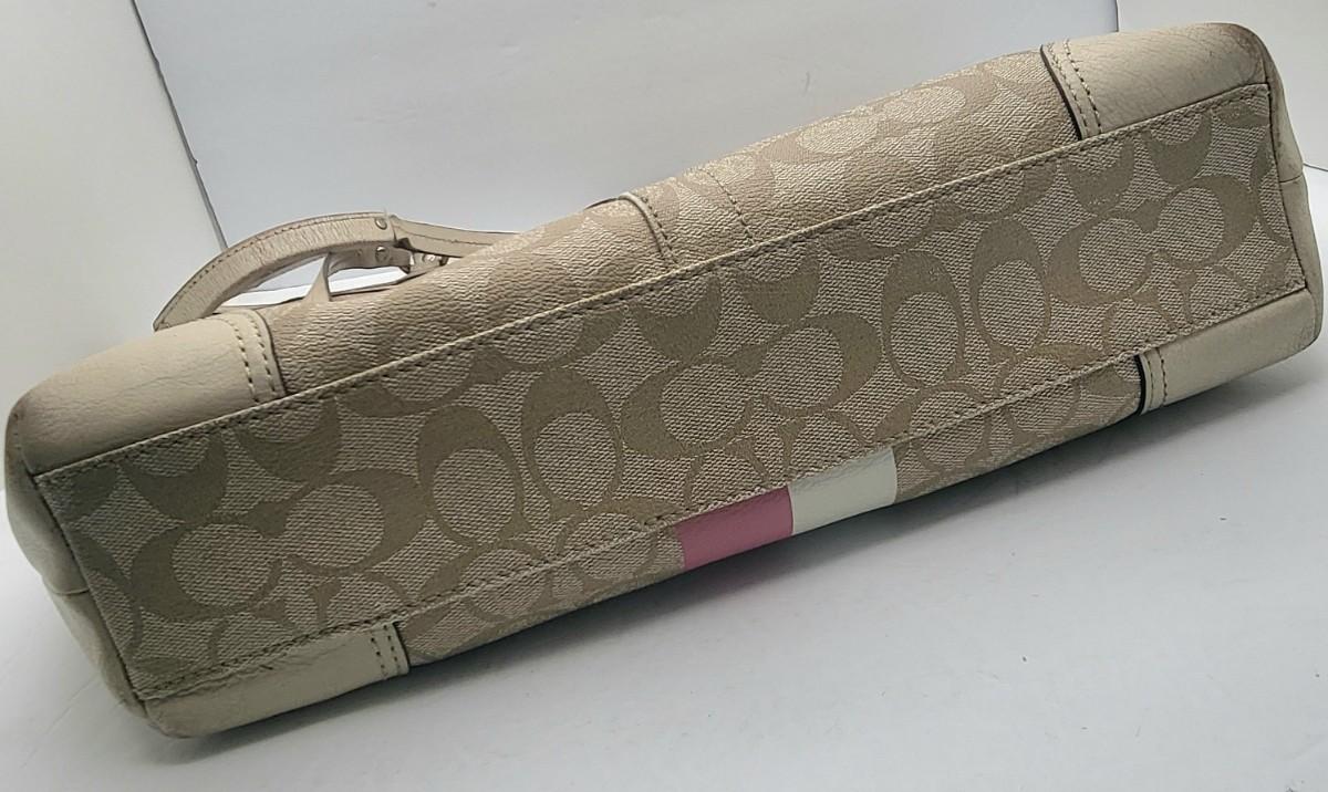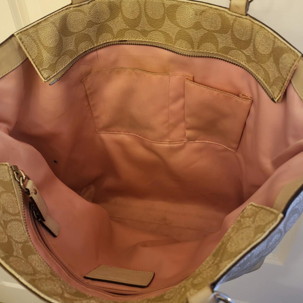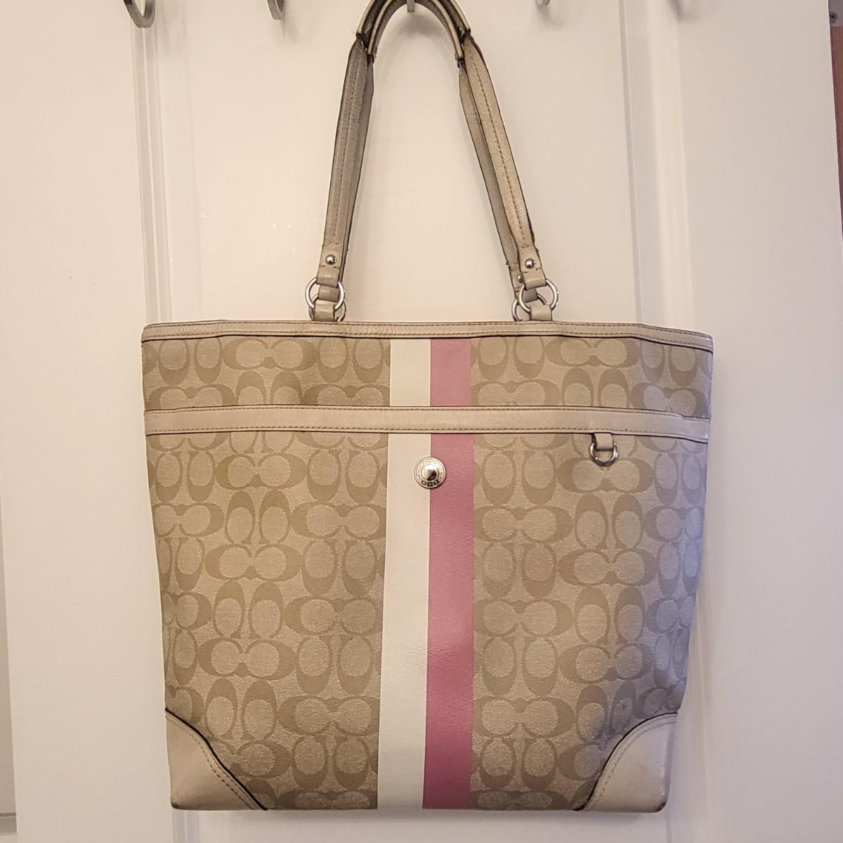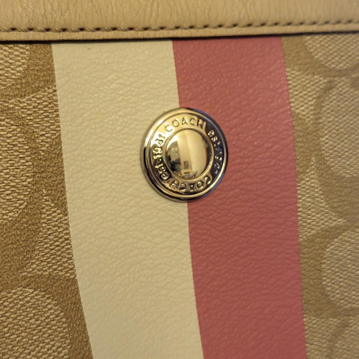 Pre-loved tan signature & pink stripe Coach tote bag. Visible wear to bottom corners and straps (See photos) but overall fair condition. Good size, roomy tote measures 17" wide x 13" tall x 3" deep.