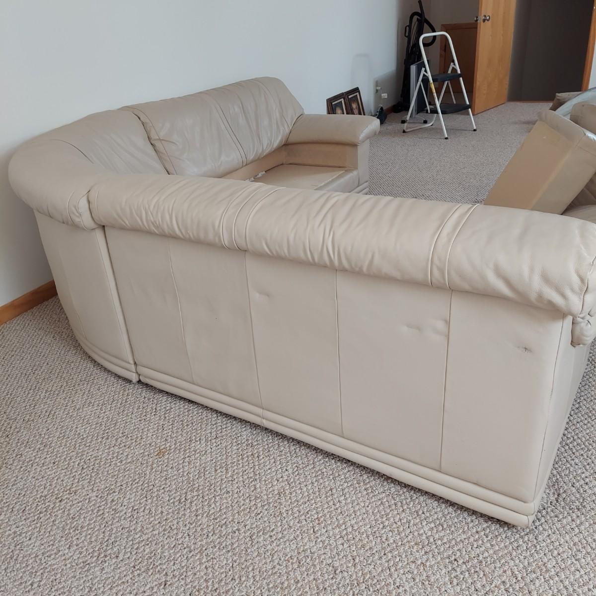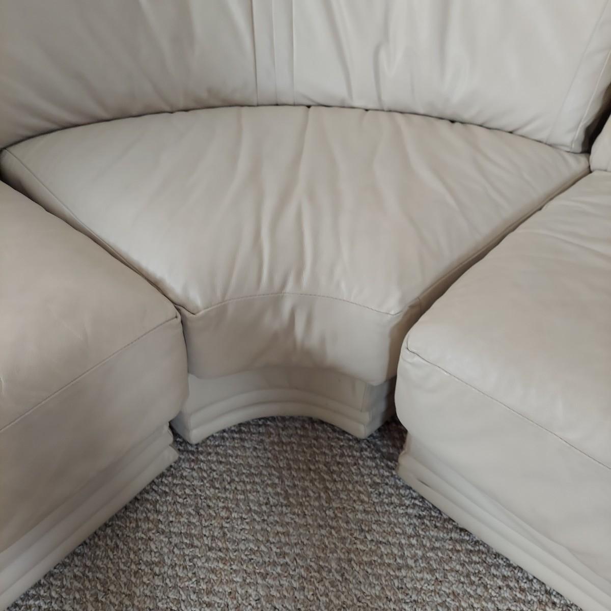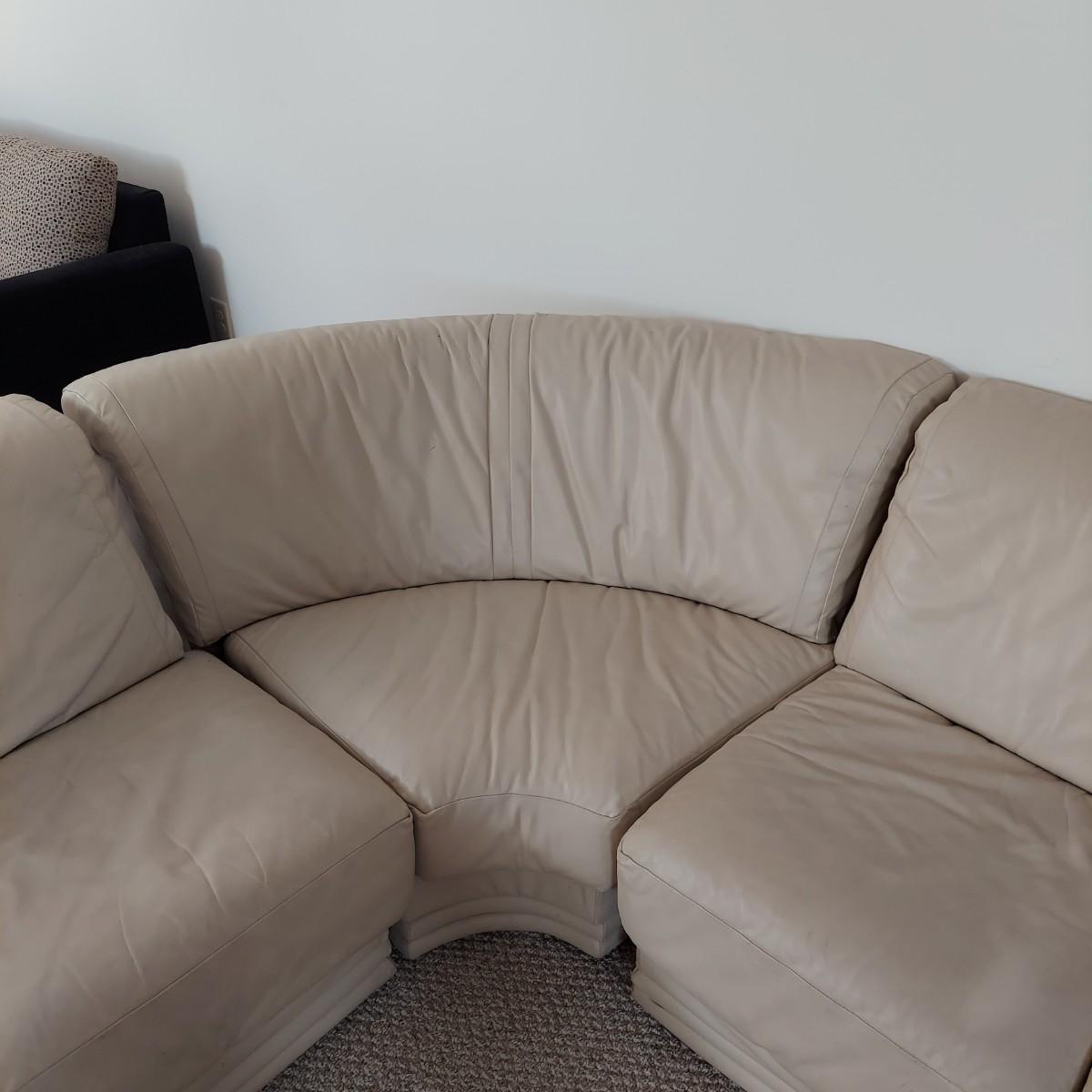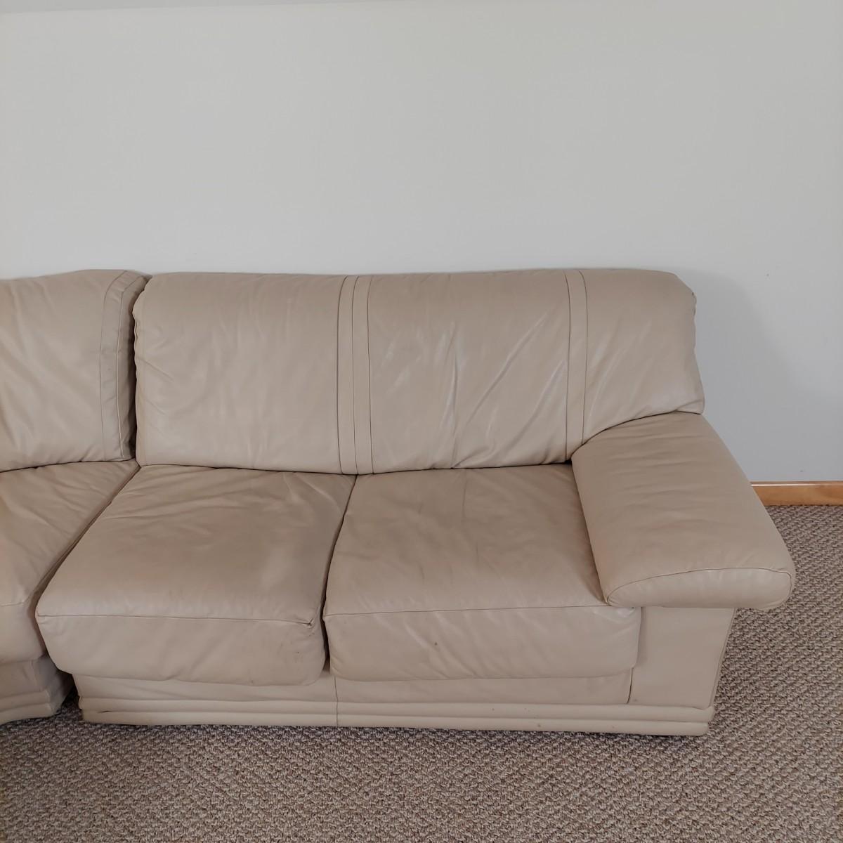 Three piece tan sectional sofa. Made in Italy by Salotti Natuzzi. Appears to be leather. There are some stains. Needs wiped clean. Some stains may not wipe off. Measures approximately 89" x 35" x 30"H. Seat height is 17"H.