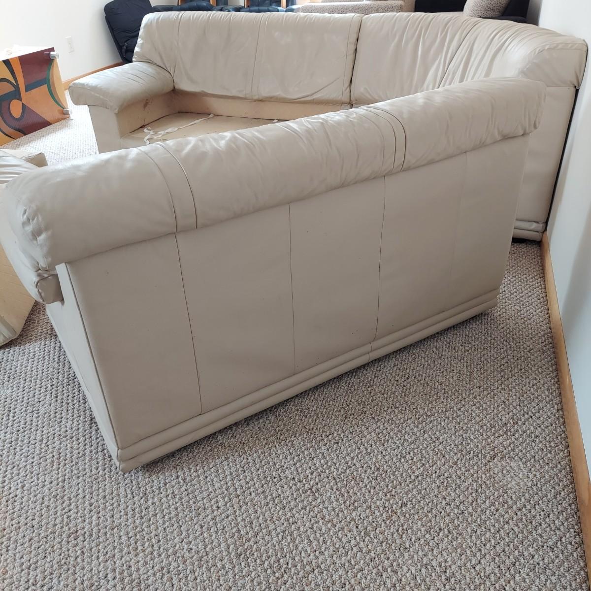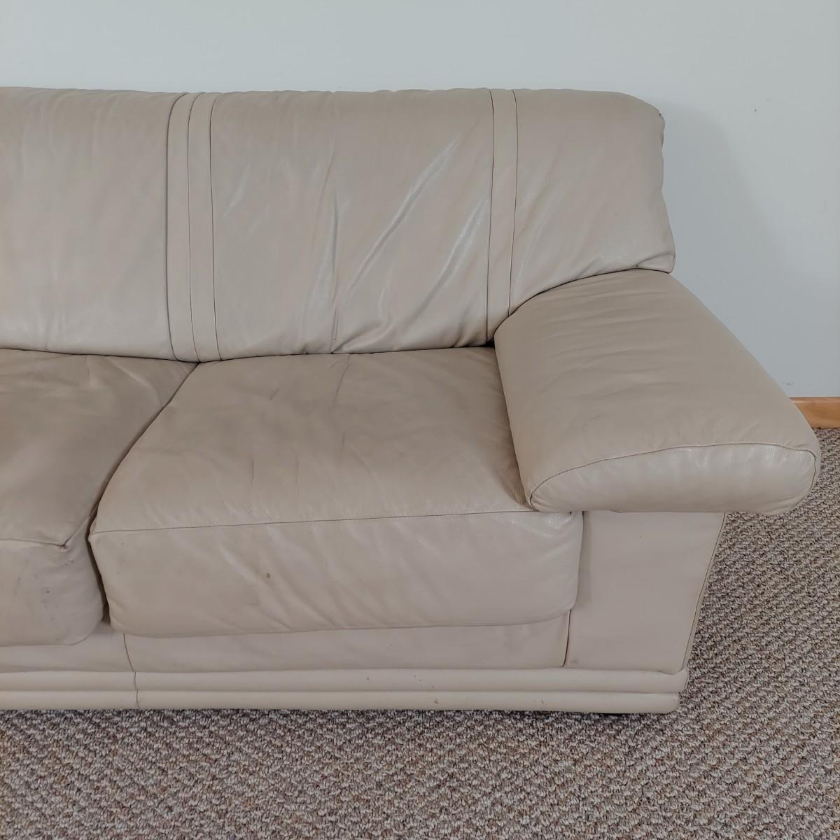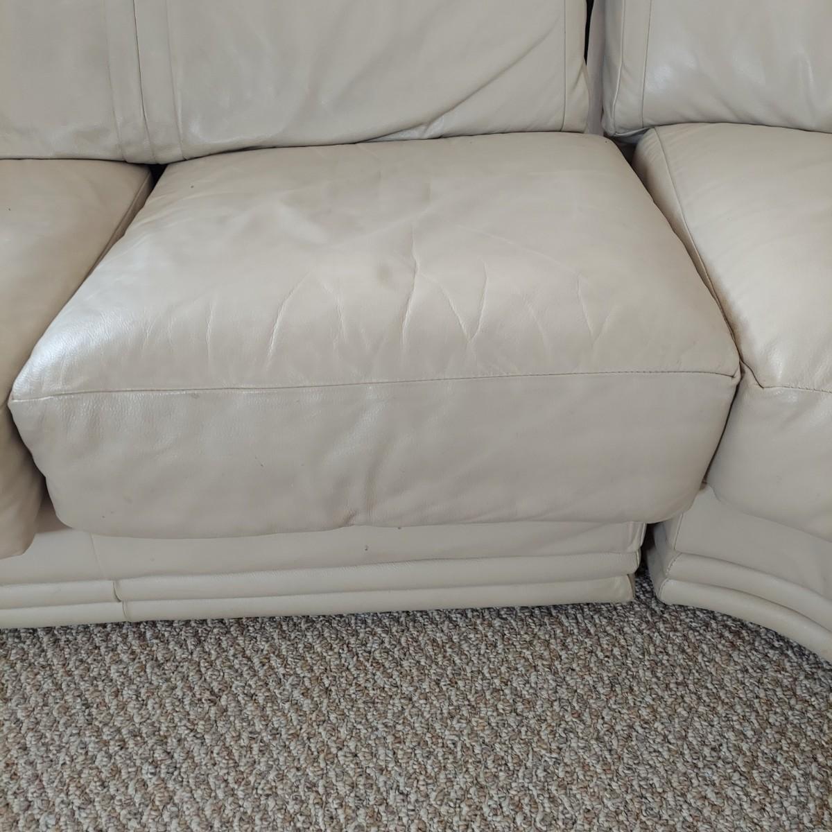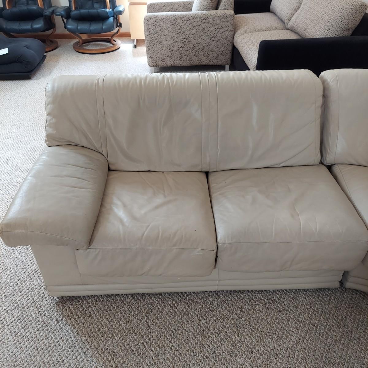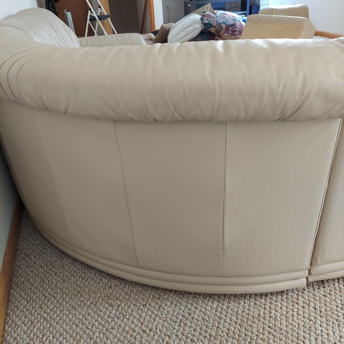Three piece tan sectional sofa. Made in Italy by Salotti Natuzzi. Appears to be leather. There are some stains. Needs wiped clean. Some stains may not wipe off. Measures approximately 89" x 35" x 30"H. Seat height is 17"H.