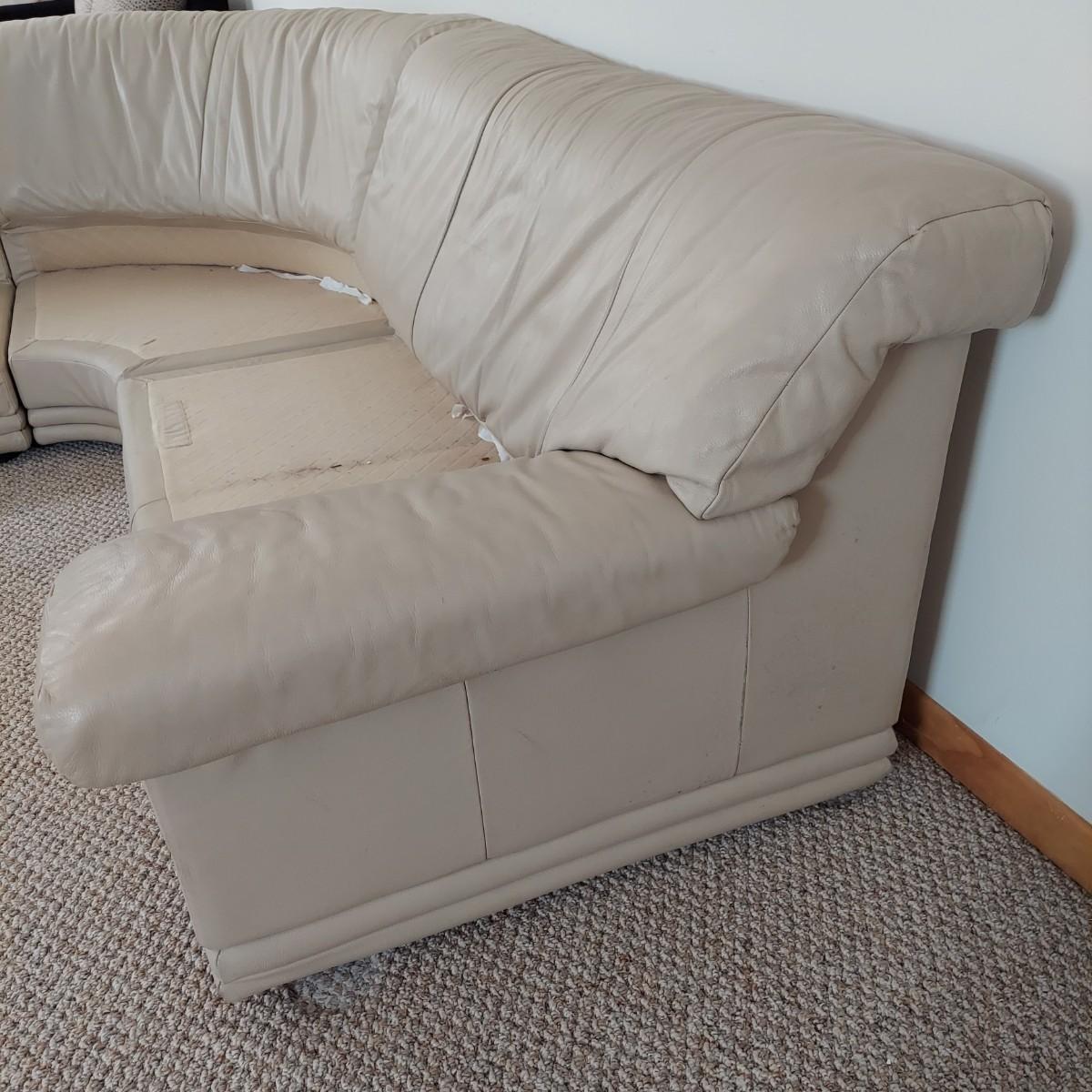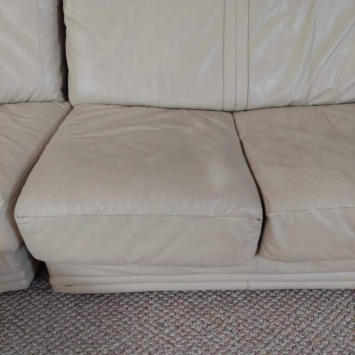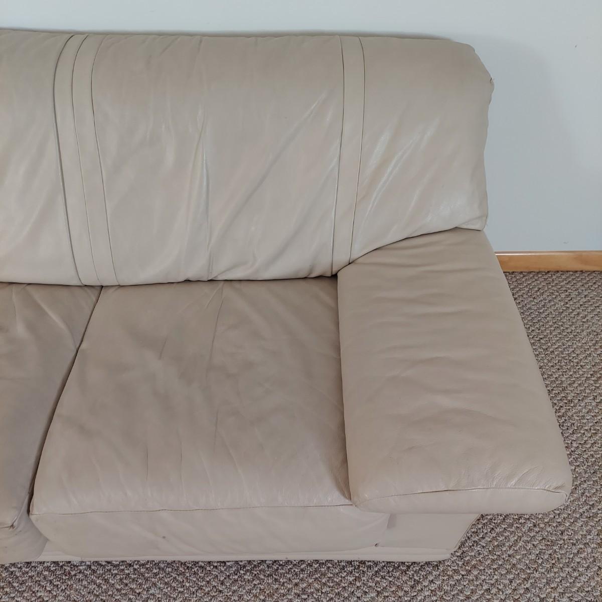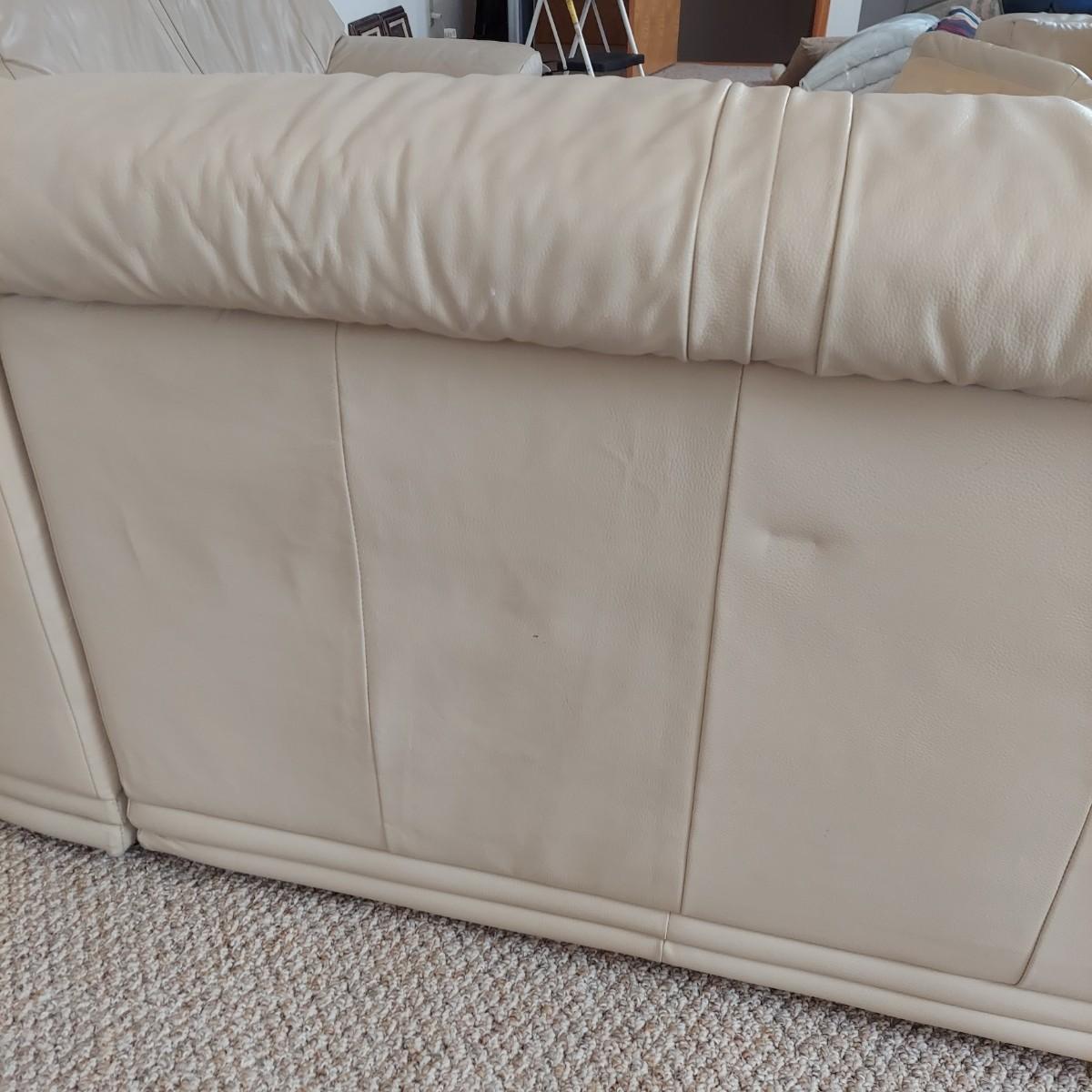 Three piece tan sectional sofa. Made in Italy by Salotti Natuzzi. Appears to be leather. There are some stains. Needs wiped clean. Some stains may not wipe off. Measures approximately 89" x 35" x 30"H. Seat height is 17"H.