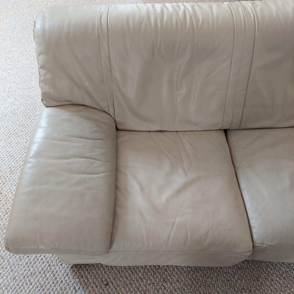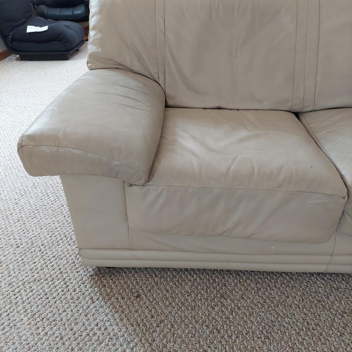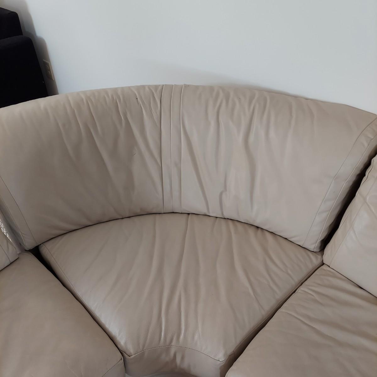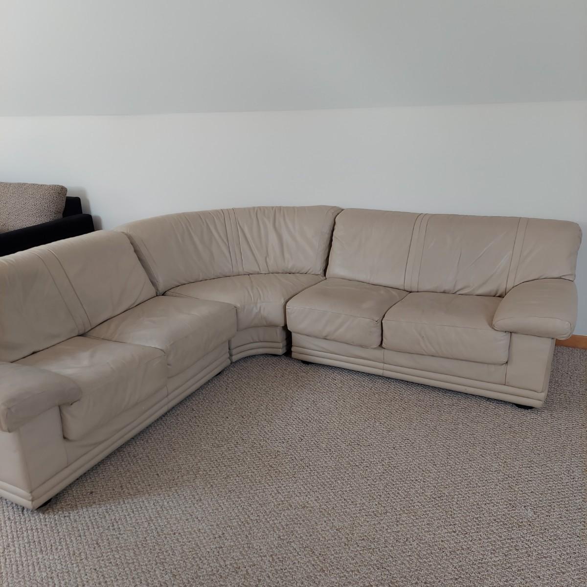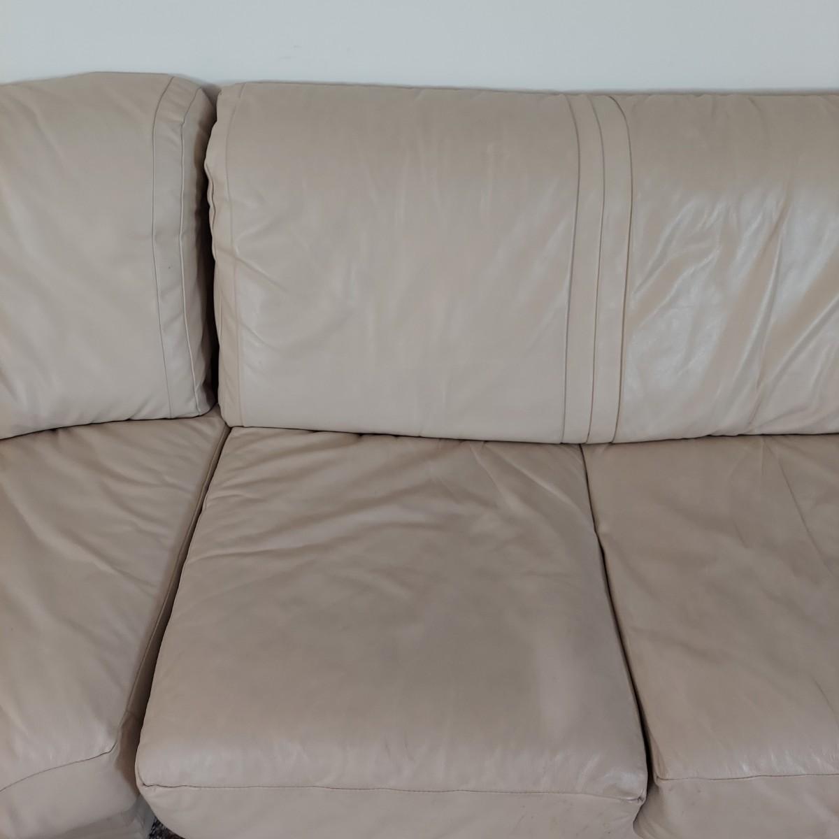Three piece tan sectional sofa. Made in Italy by Salotti Natuzzi. Appears to be leather. There are some stains. Needs wiped clean. Some stains may not wipe off. Measures approximately 89" x 35" x 30"H. Seat height is 17"H.