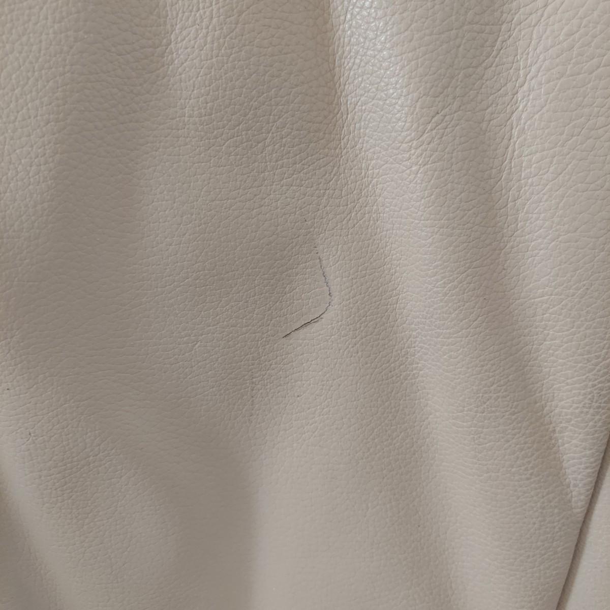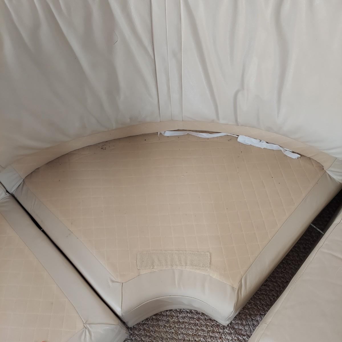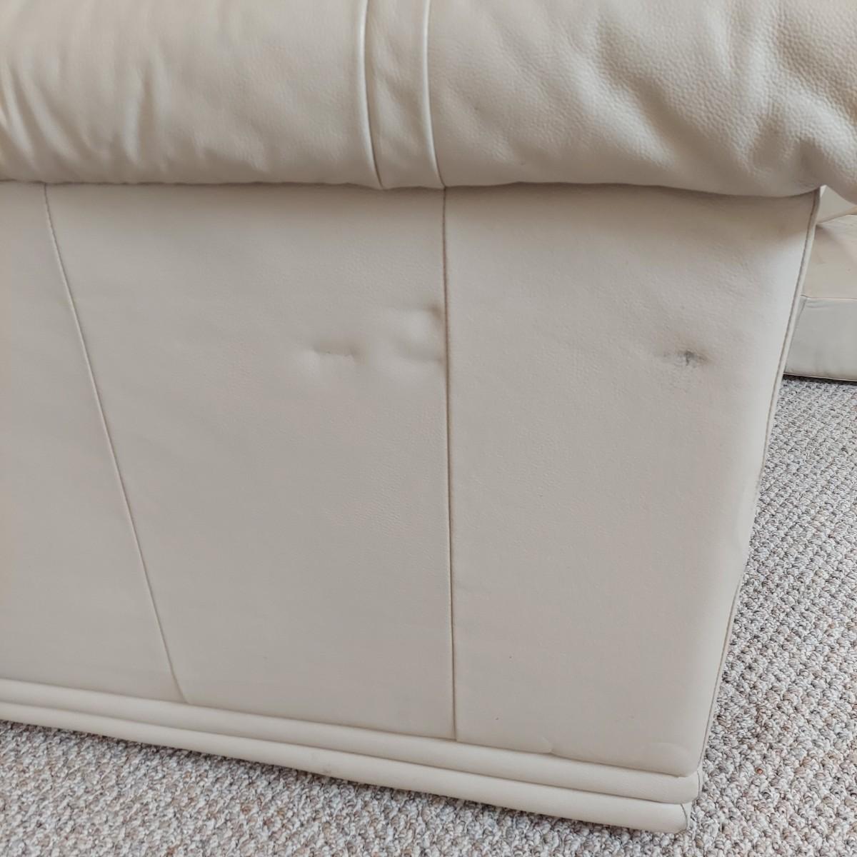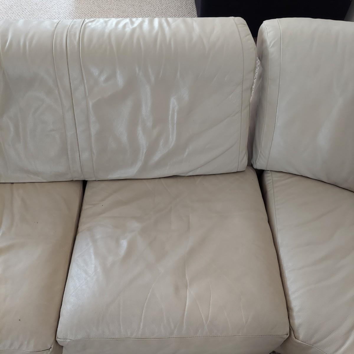 Three piece tan sectional sofa. Made in Italy by Salotti Natuzzi. Appears to be leather. There are some stains. Needs wiped clean. Some stains may not wipe off. Measures approximately 89" x 35" x 30"H. Seat height is 17"H.