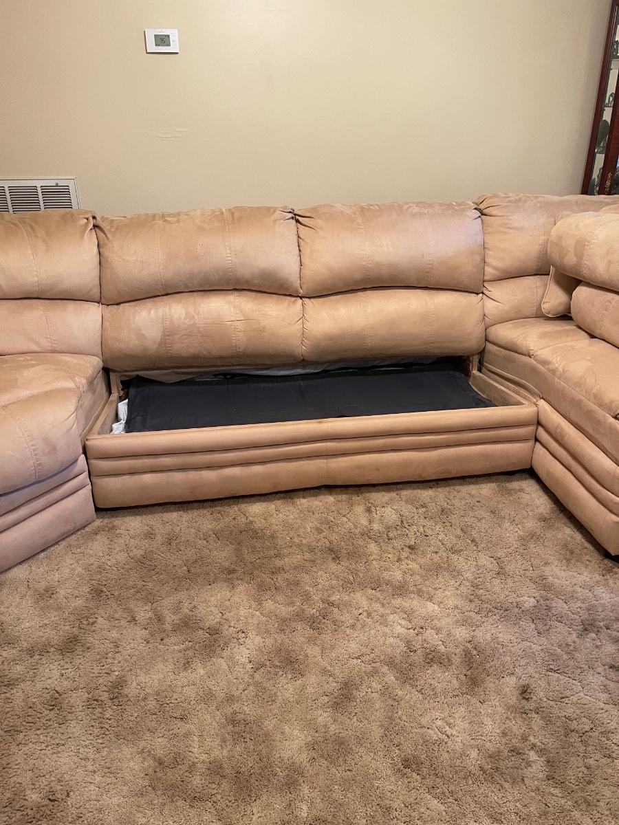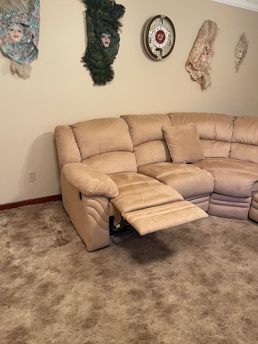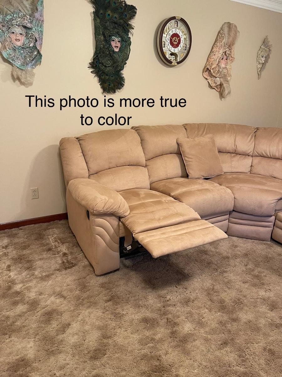 It has a recliner, sofa bed & chaise. See photos for measurements. No smoking, no pets. Has been deodorized, sanitized, and disinfected. Great condition ~ Mild use. Color is tan. Lighting changes and effects color in some photos.