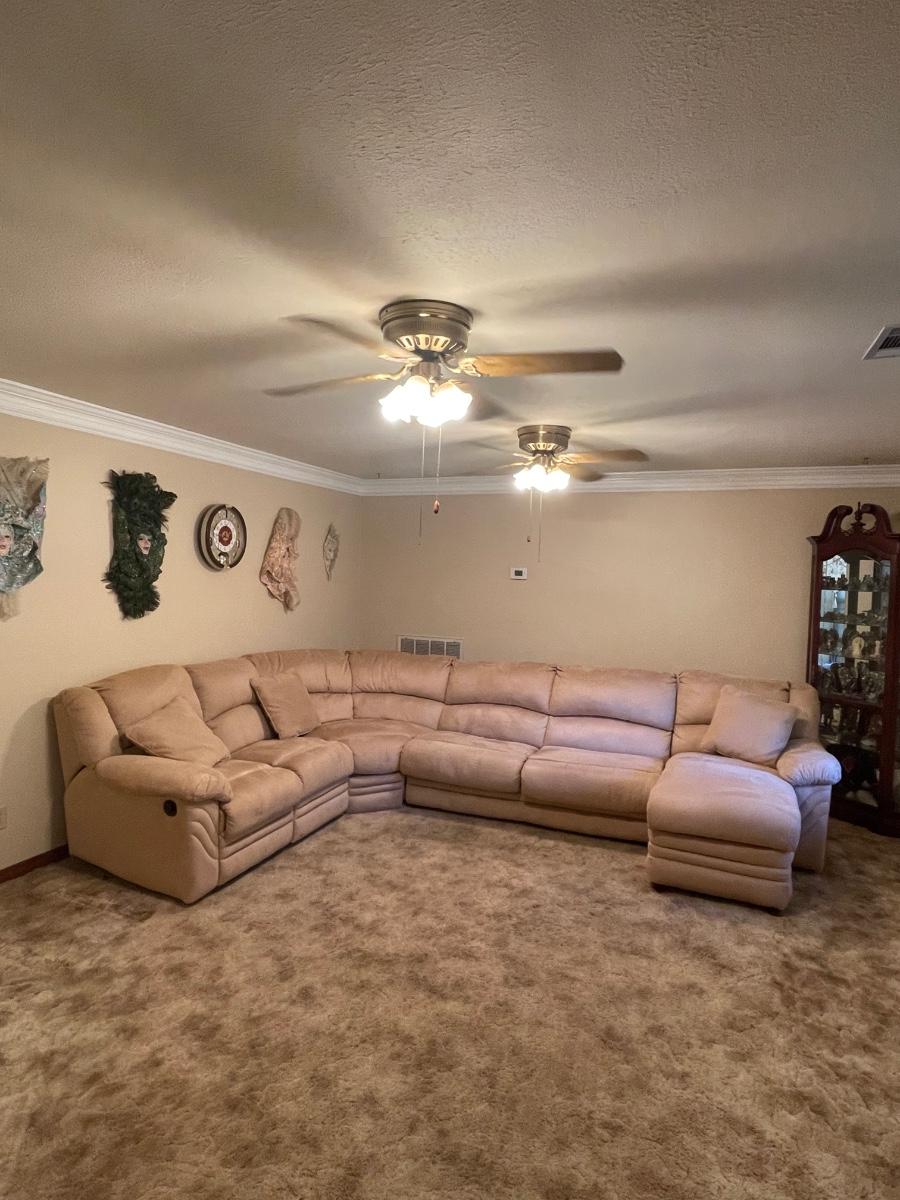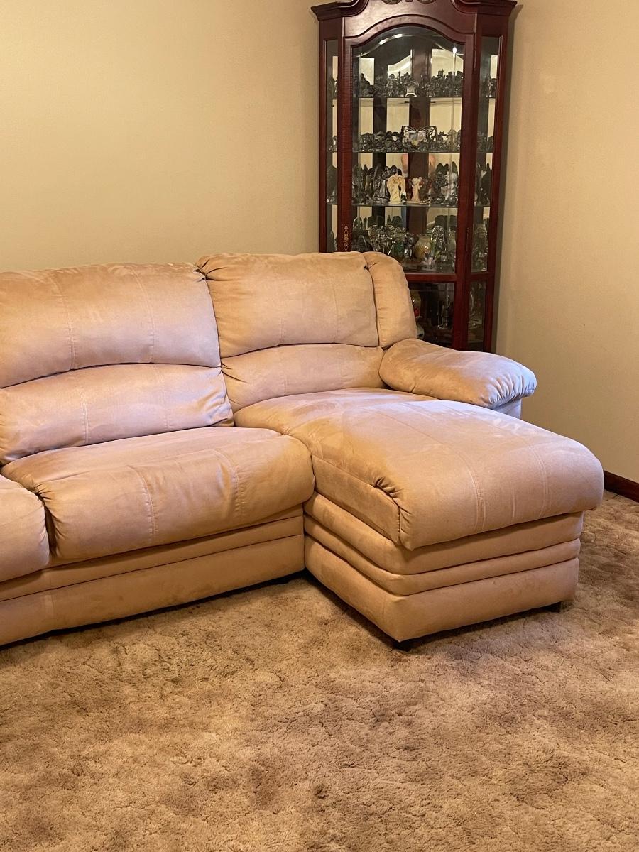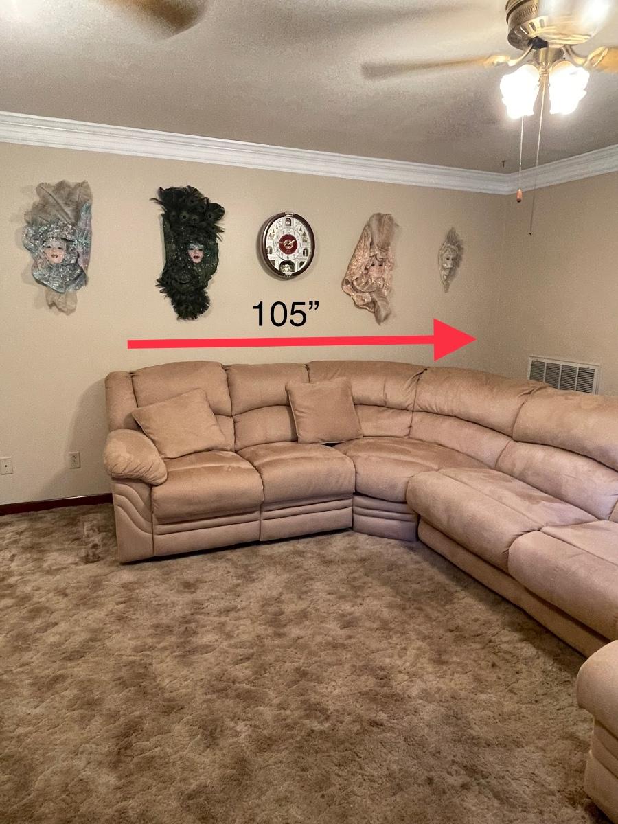 It has a recliner, sofa bed & chaise. See photos for measurements. No smoking, no pets. Has been deodorized, sanitized, and disinfected. Great condition ~ Mild use. Color is tan. Lighting changes and effects color in some photos.