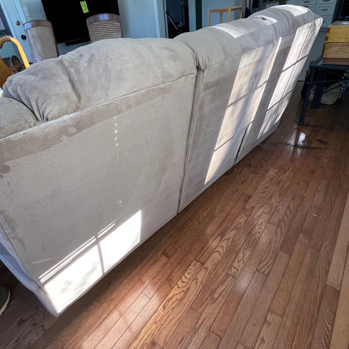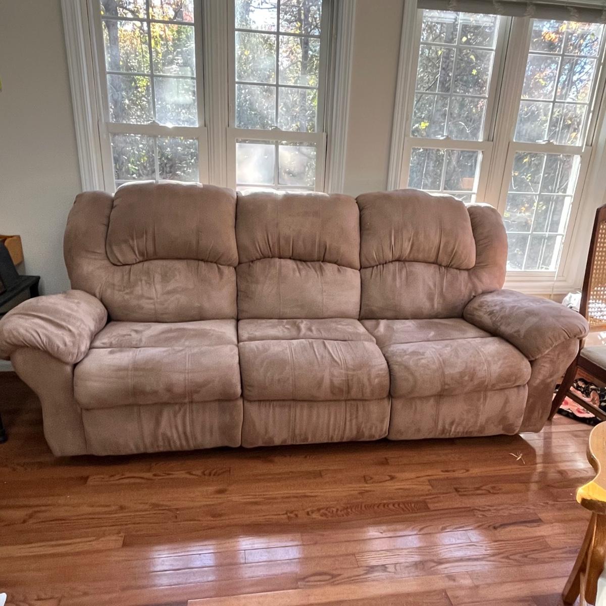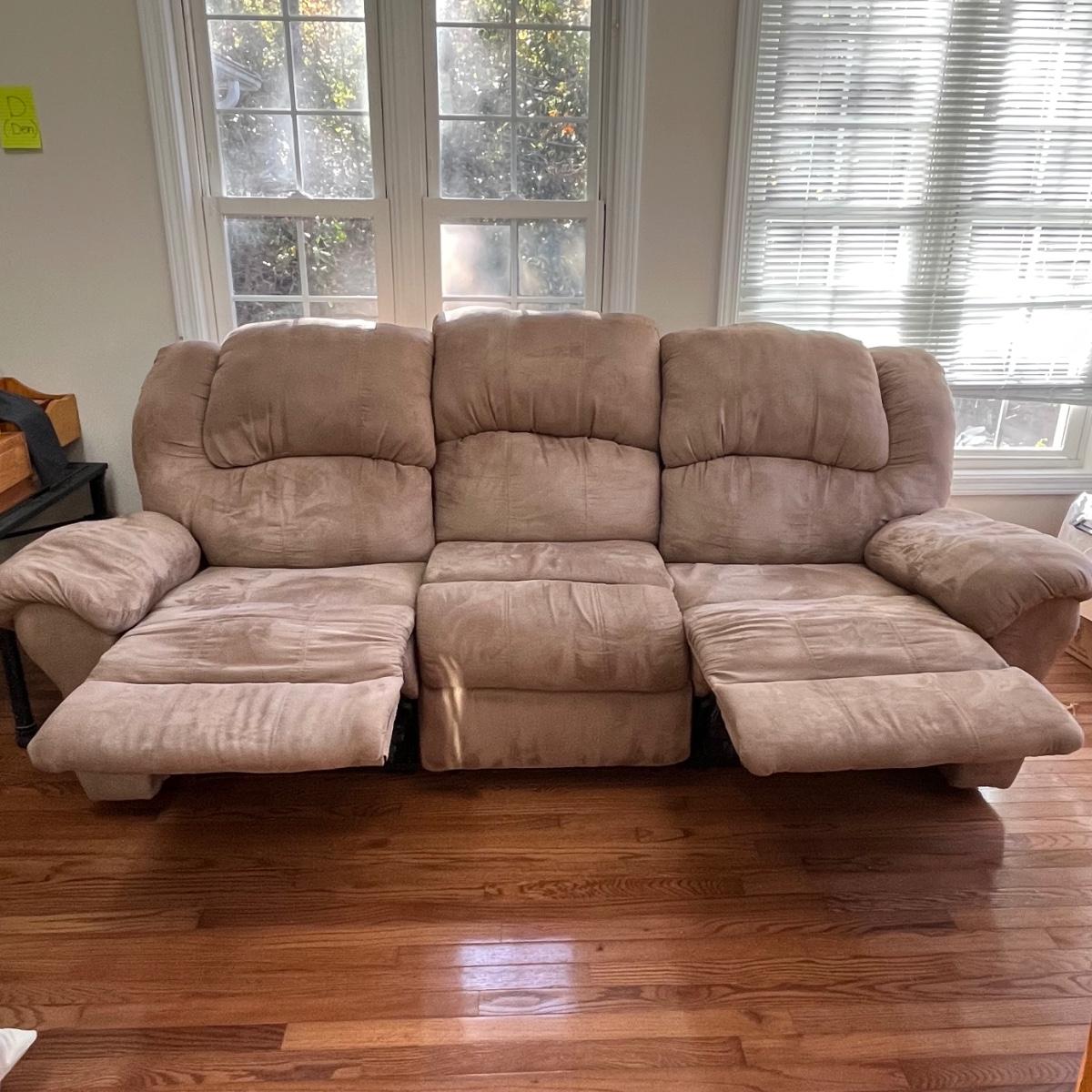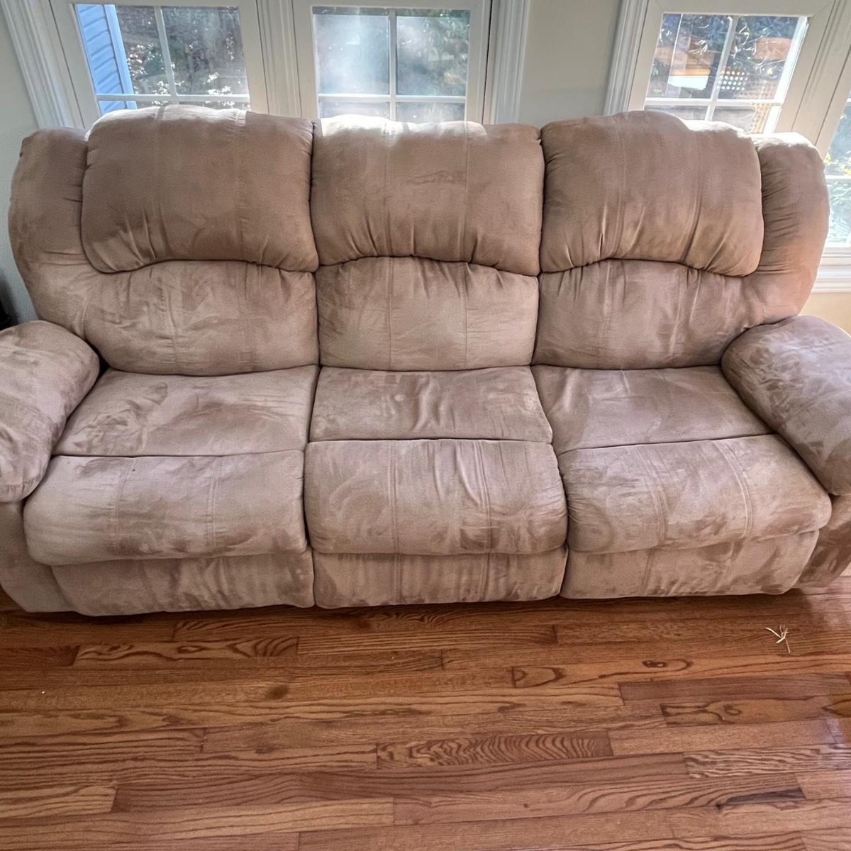 Sofa by Affordable Furniture. Tan fabric is a soft microfiber and measures 96” x 40” x 40”H with a seat height of 18". It has three seats with each end seat capable of reclining. Recliner activated by a hand lever. Please note this home had pets, so some pet hair may be present.