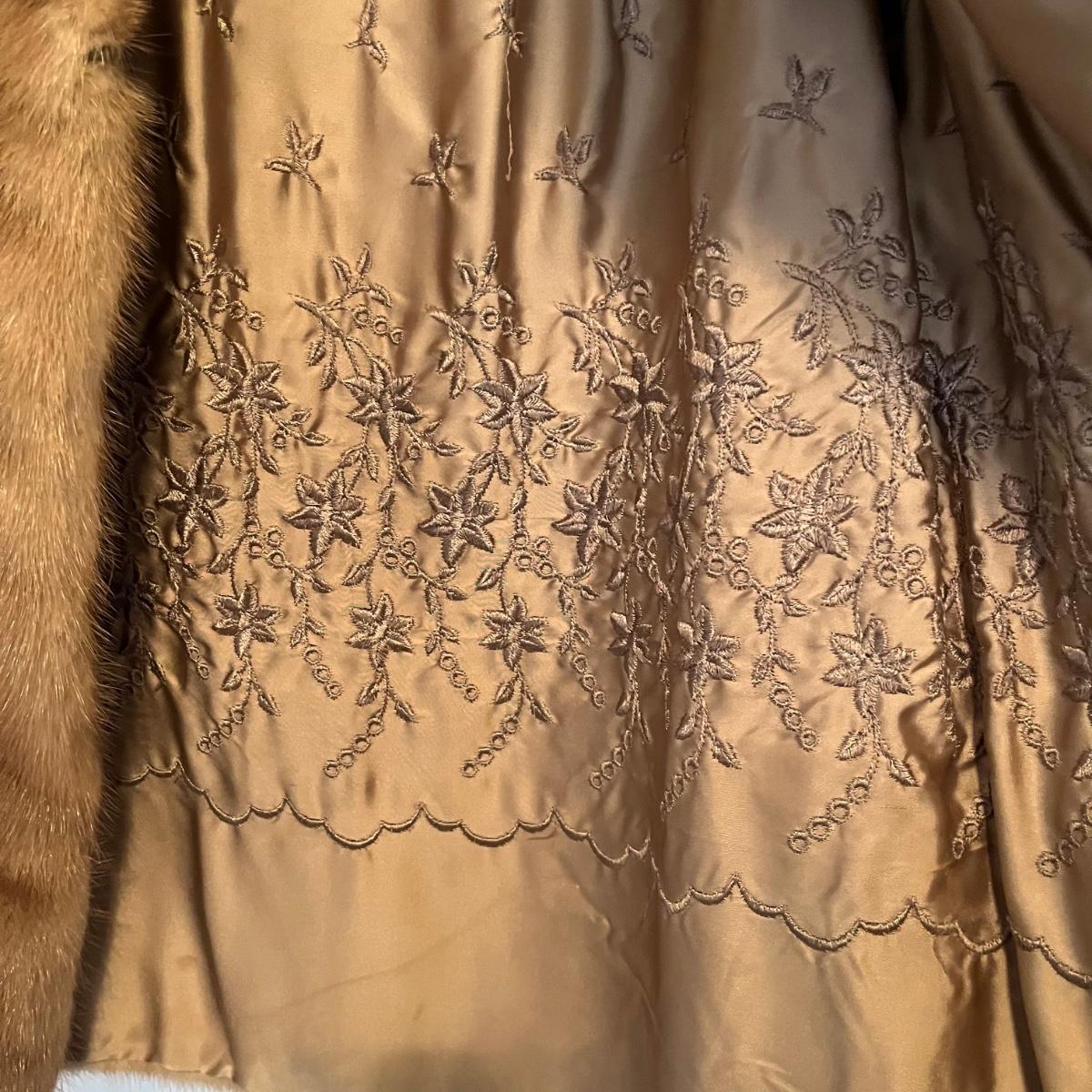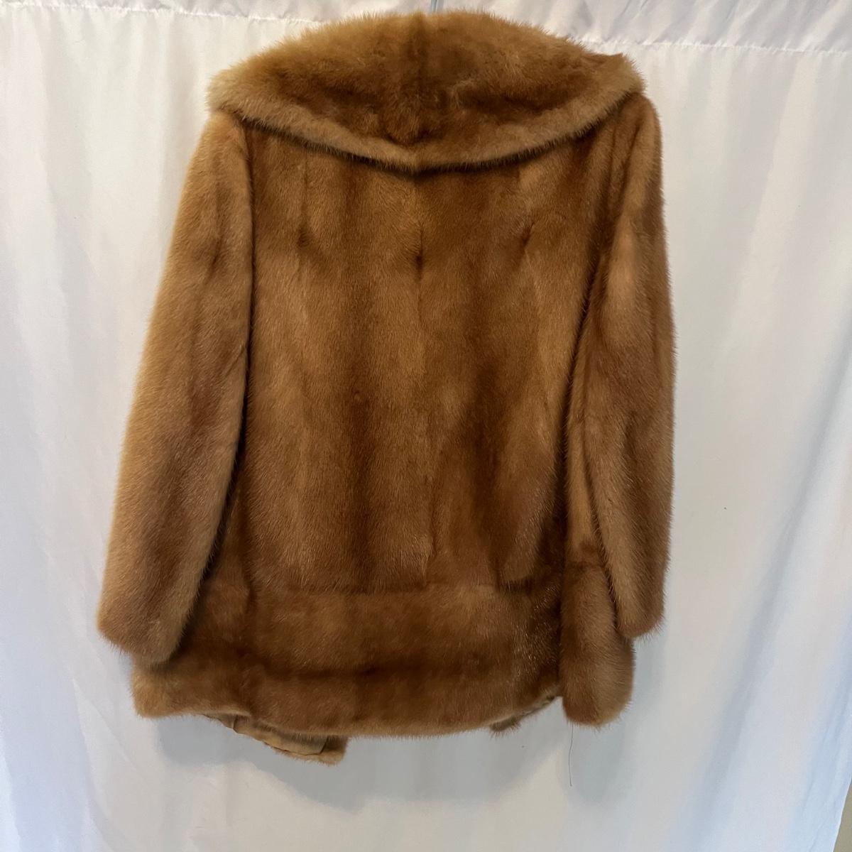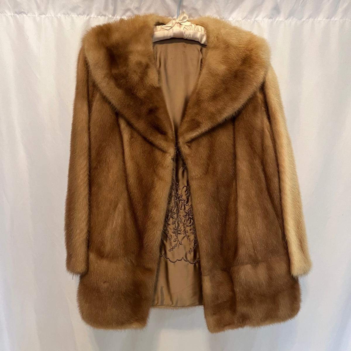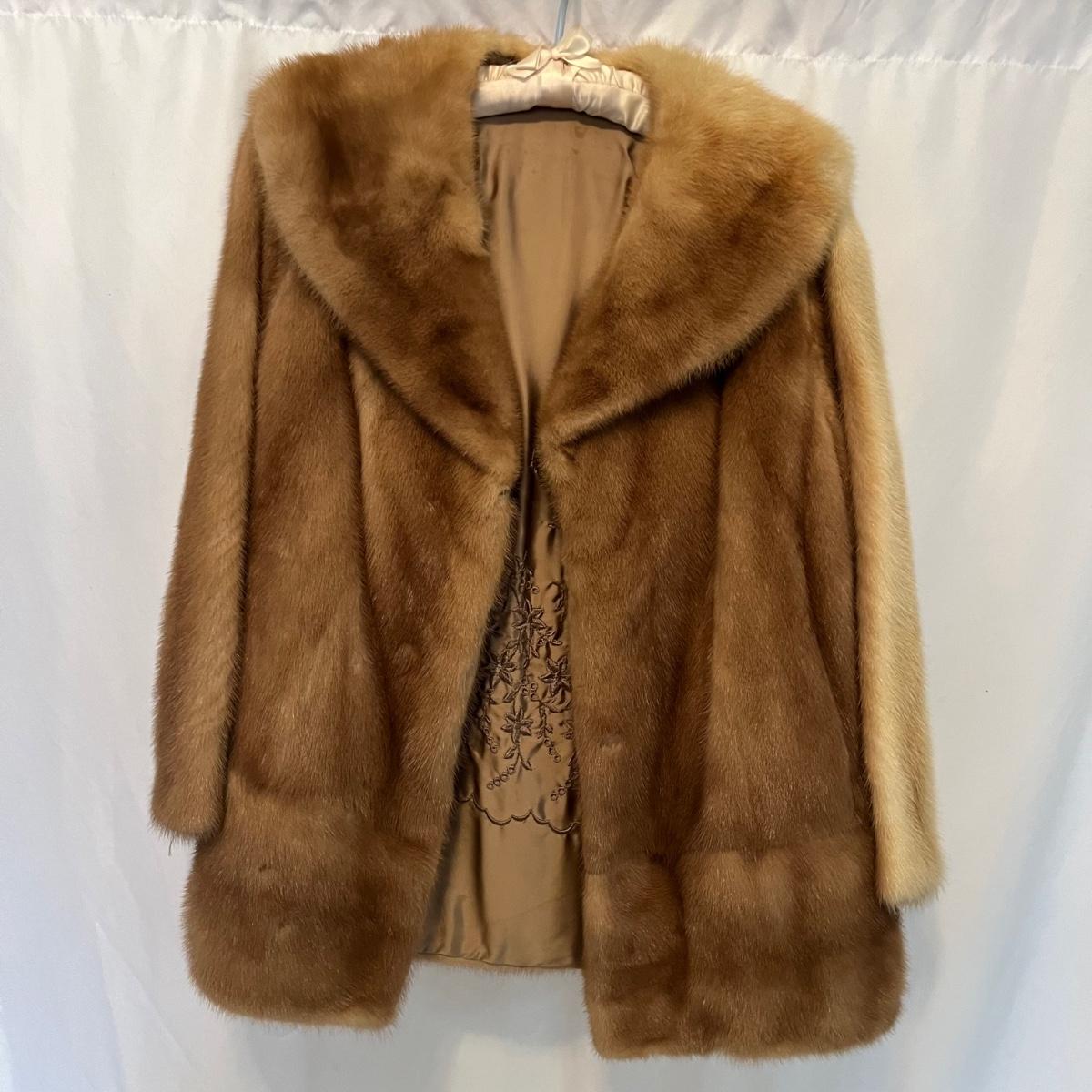 Lot includes a Tan mink coat that is marked Josephine on the liner. Note the fancy stitching on the liner. Coat appears to be a size 14-though there is not a tag stating size. The sleeves are not full-length; instead the coat sports 3/4 length sleeves. There are two outside pockets. Note the lining has come apart from the coat.