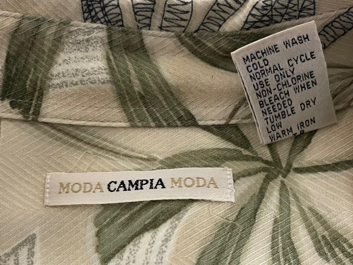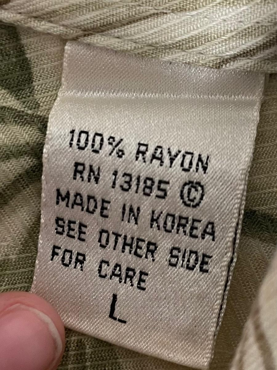 This shirt is in great condition and doesn’t have any noticeable damages to it. All buttons are on the shirt, there are some extras on the bottom. The shirt is made up of 100% Rayon and was made in Korea. It is a size large in men’s.