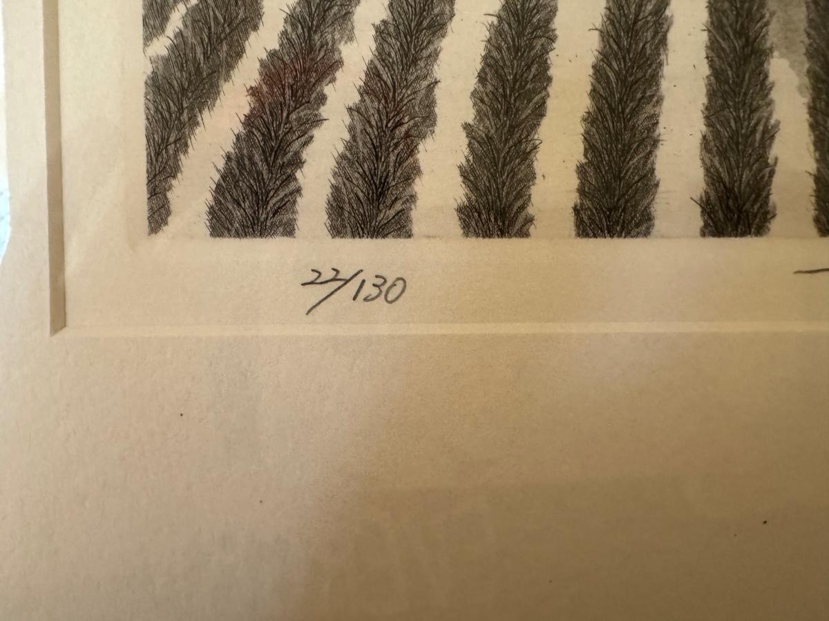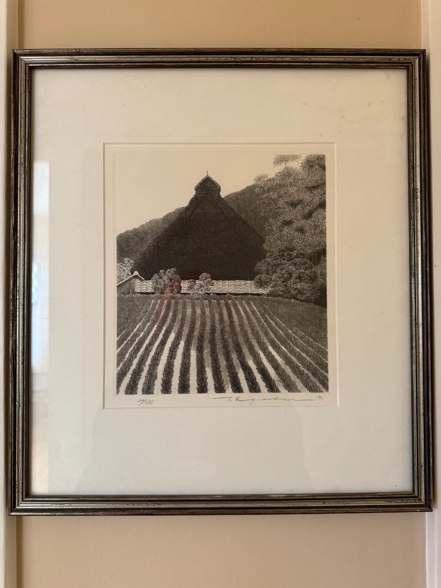 Tanaka Ryohei, Framed Etching, Japanese Barn fields, 22/130, 1981, 18” T x 16” W