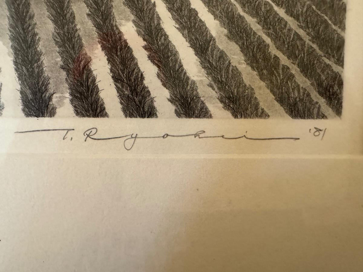Tanaka Ryohei, Framed Etching, Japanese barn fields, 1981
