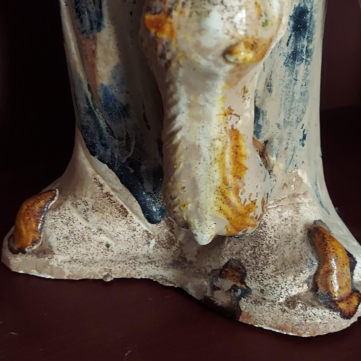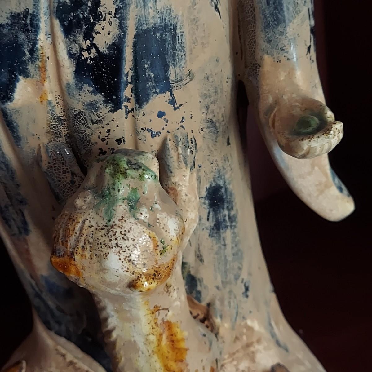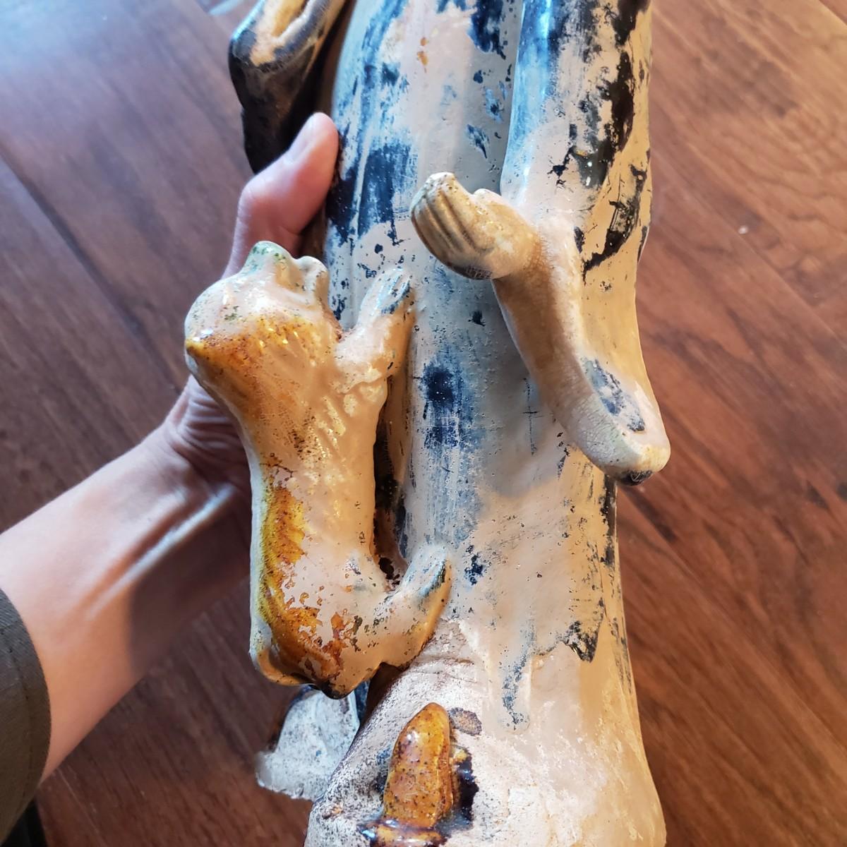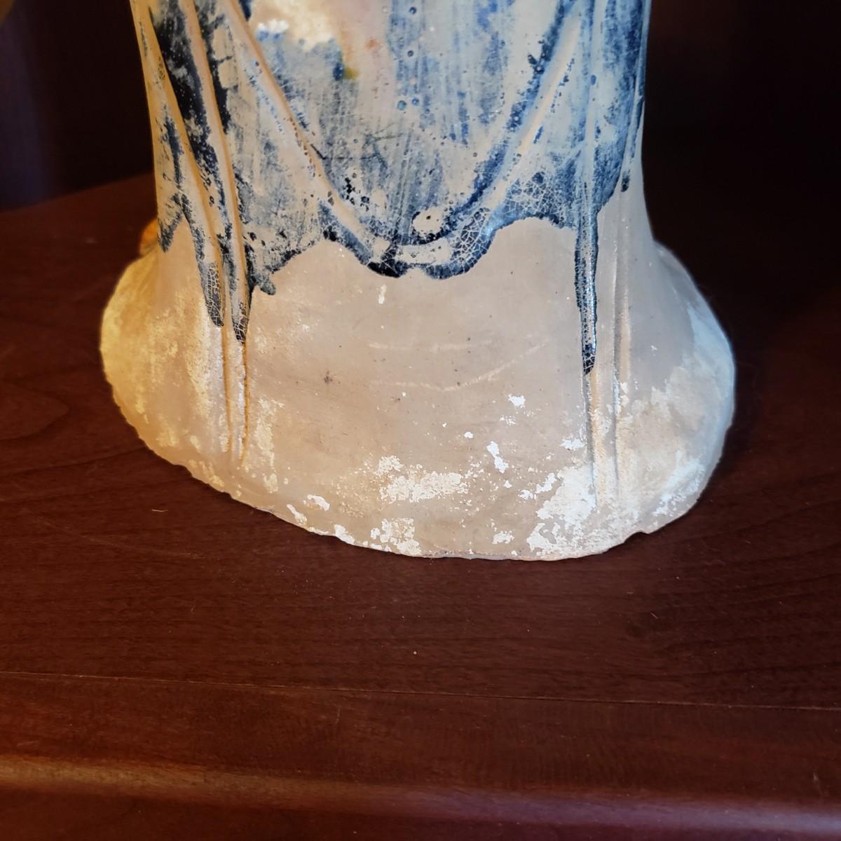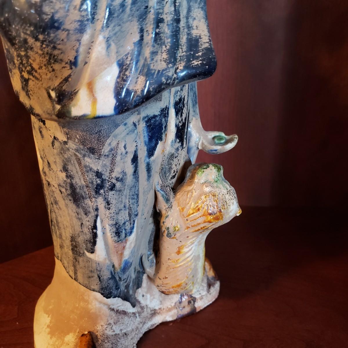 This painted figure of a woman feeding her dog measures 6" x 4" x 17"H. It appears to be clay with a blue glaze for her dress, while her dog has two colors. Some chipping, see pictures.