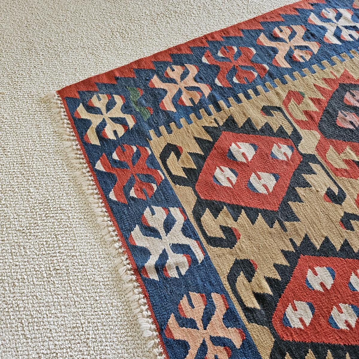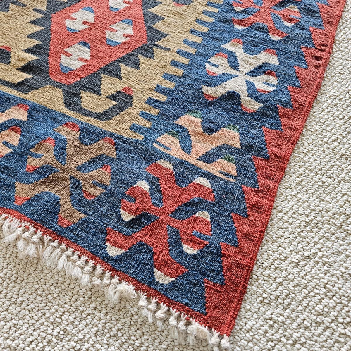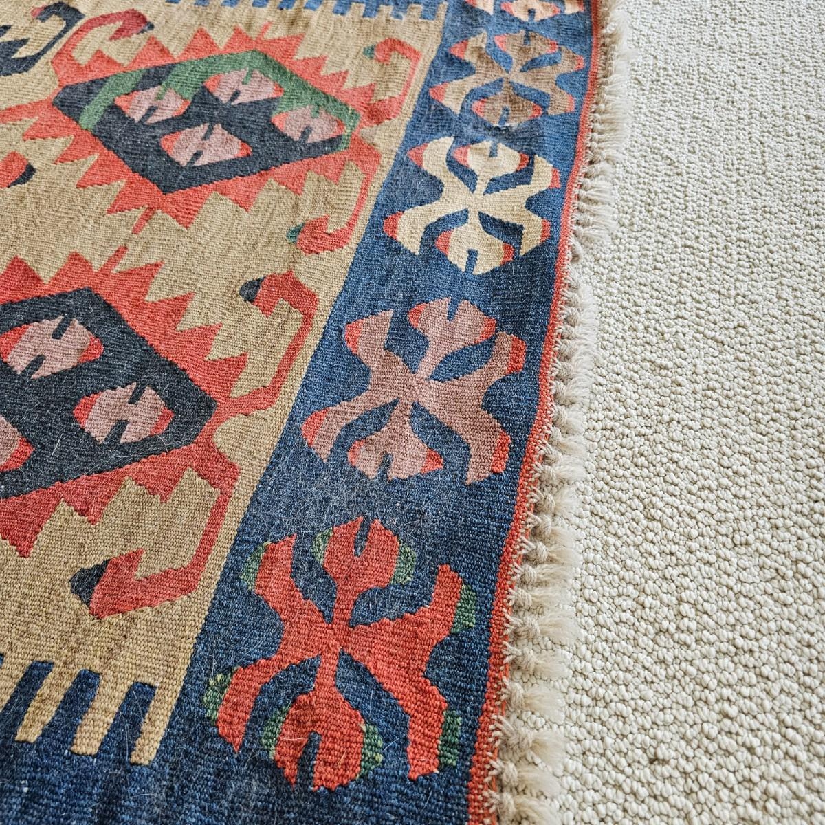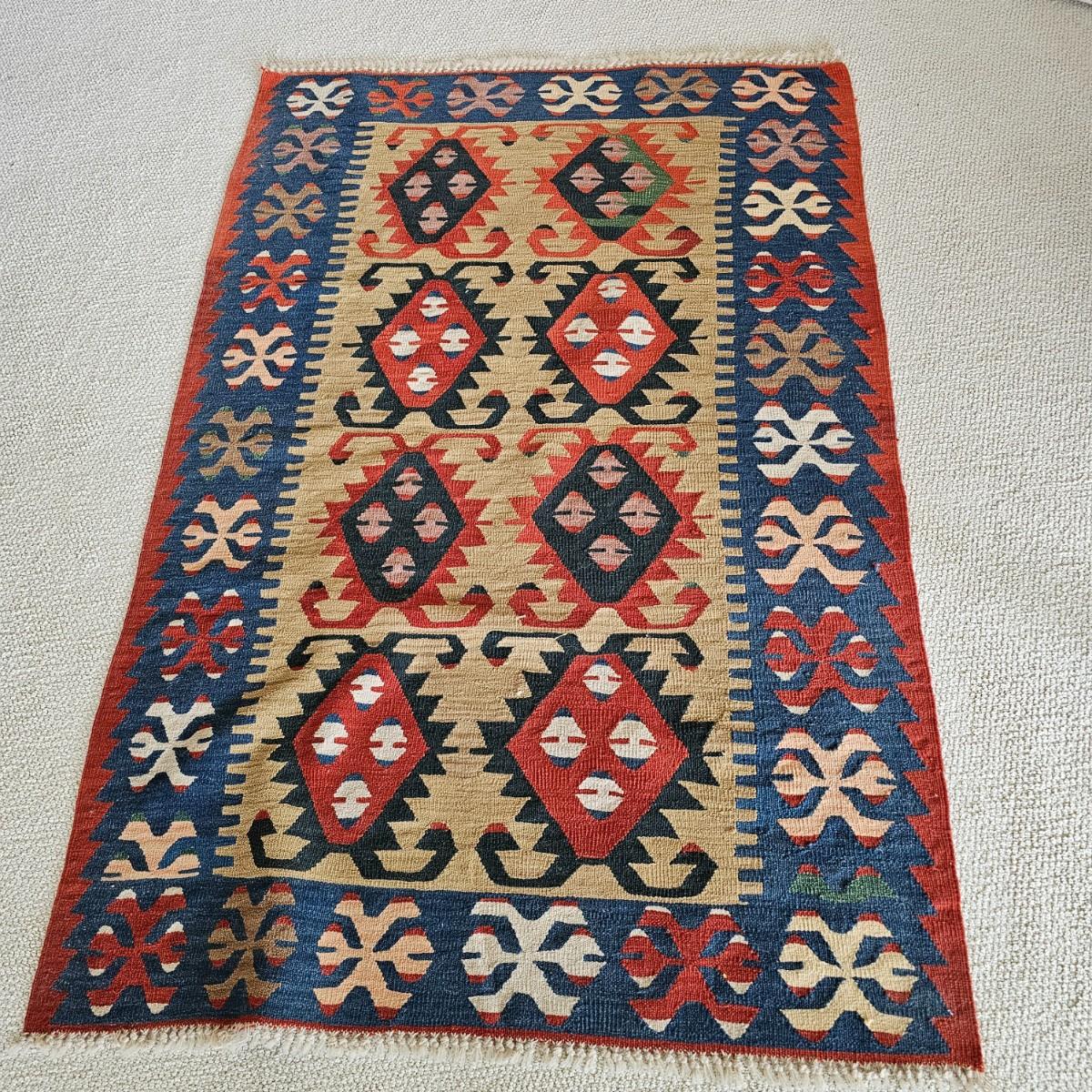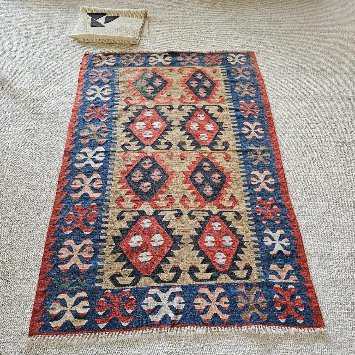 Dancing patterns move around the periphery of this area rug. Tan and brown, red and blue intermix throughout. Rug measures 4’ x 6’2”, comes with under pad. See photos for details. Local pickup only.