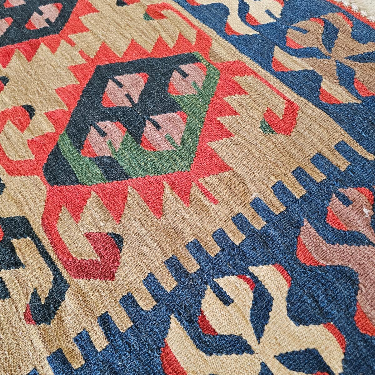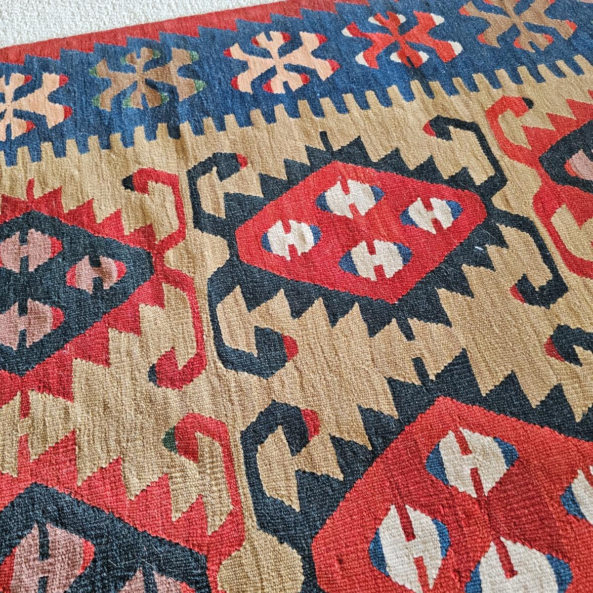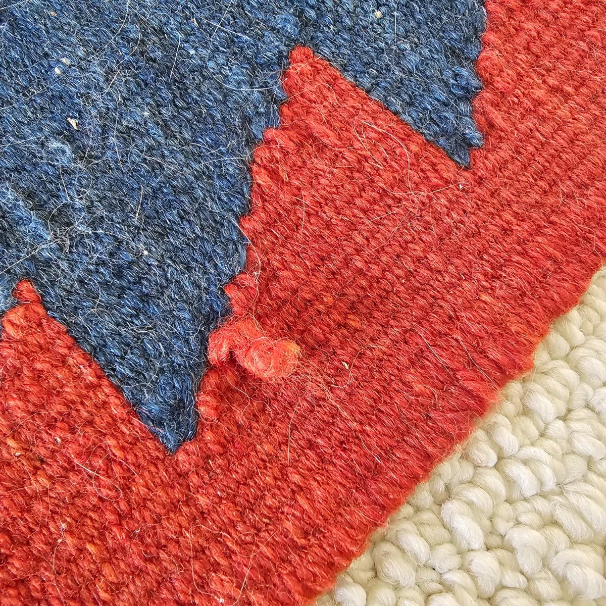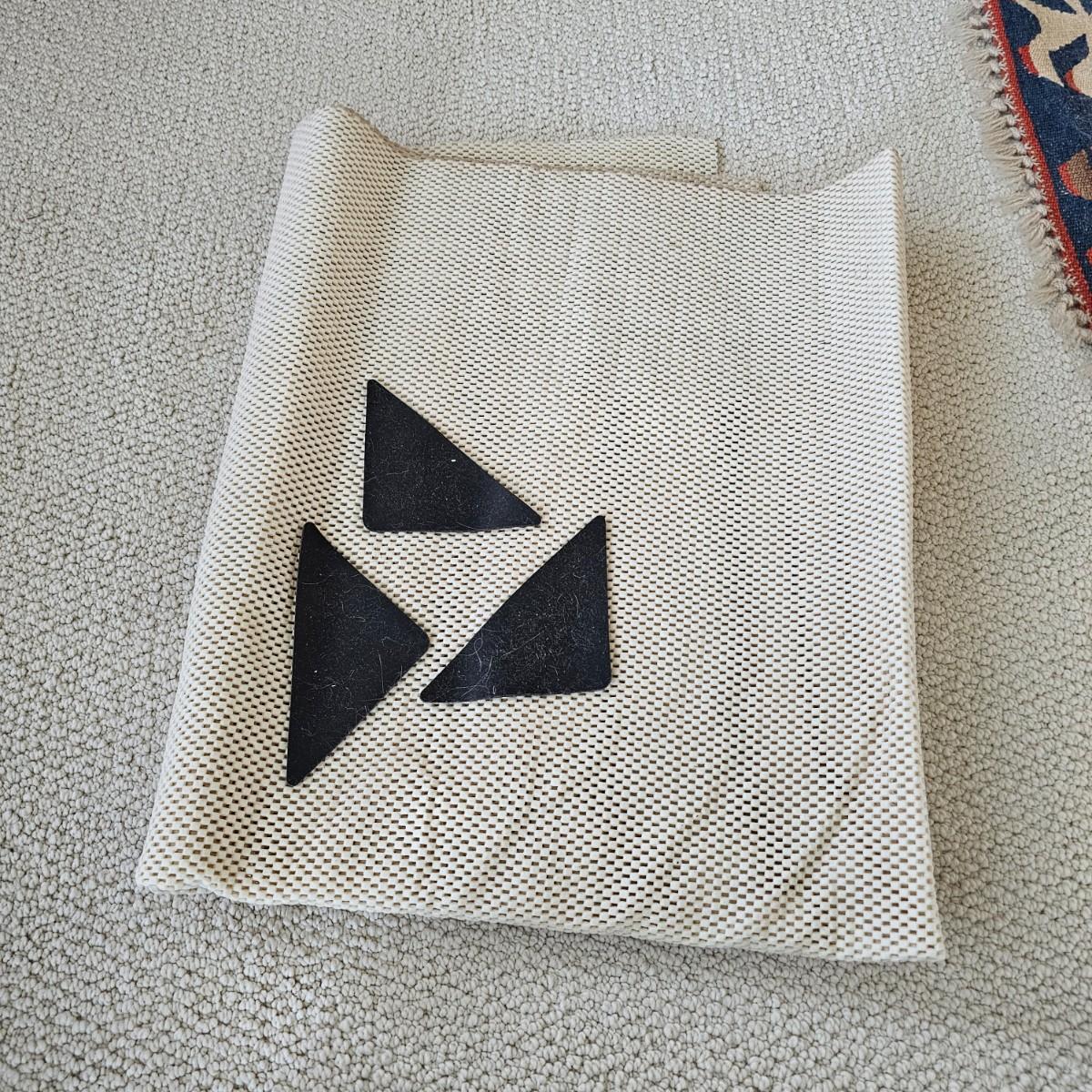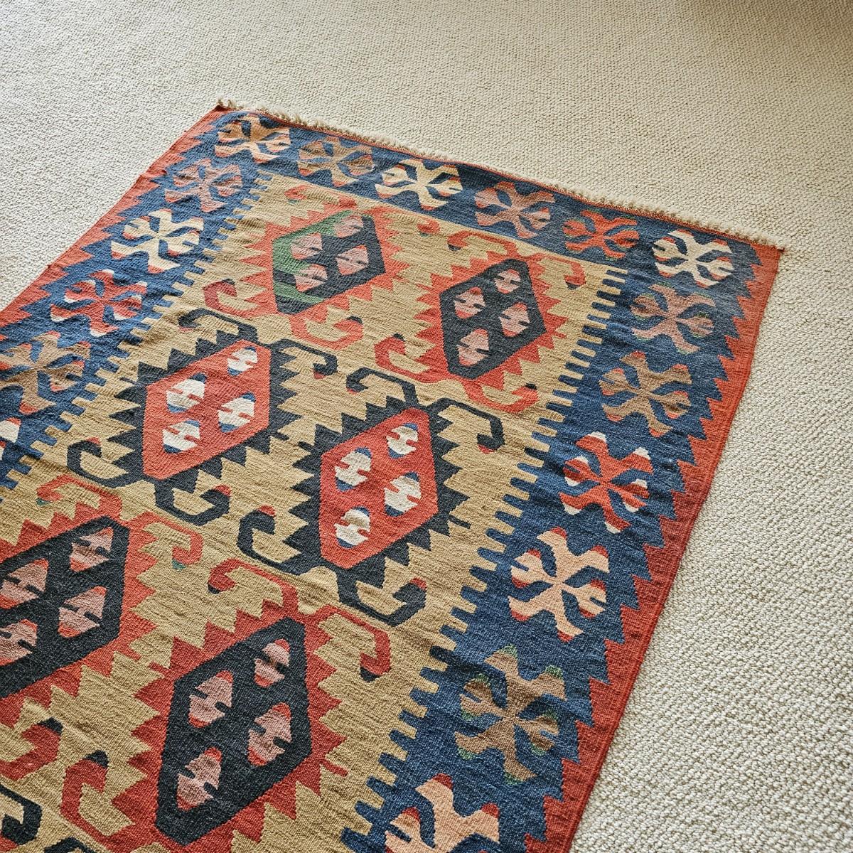 Dancing patterns move around the periphery of this area rug. Tan and brown, red and blue intermix throughout. Rug measures 4’ x 6’2”, comes with under pad. See photos for details. Local pickup only.