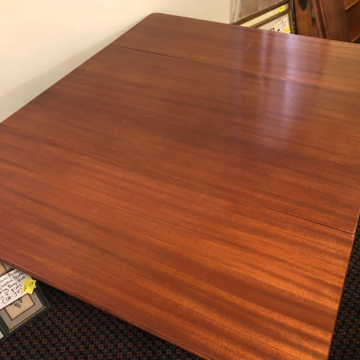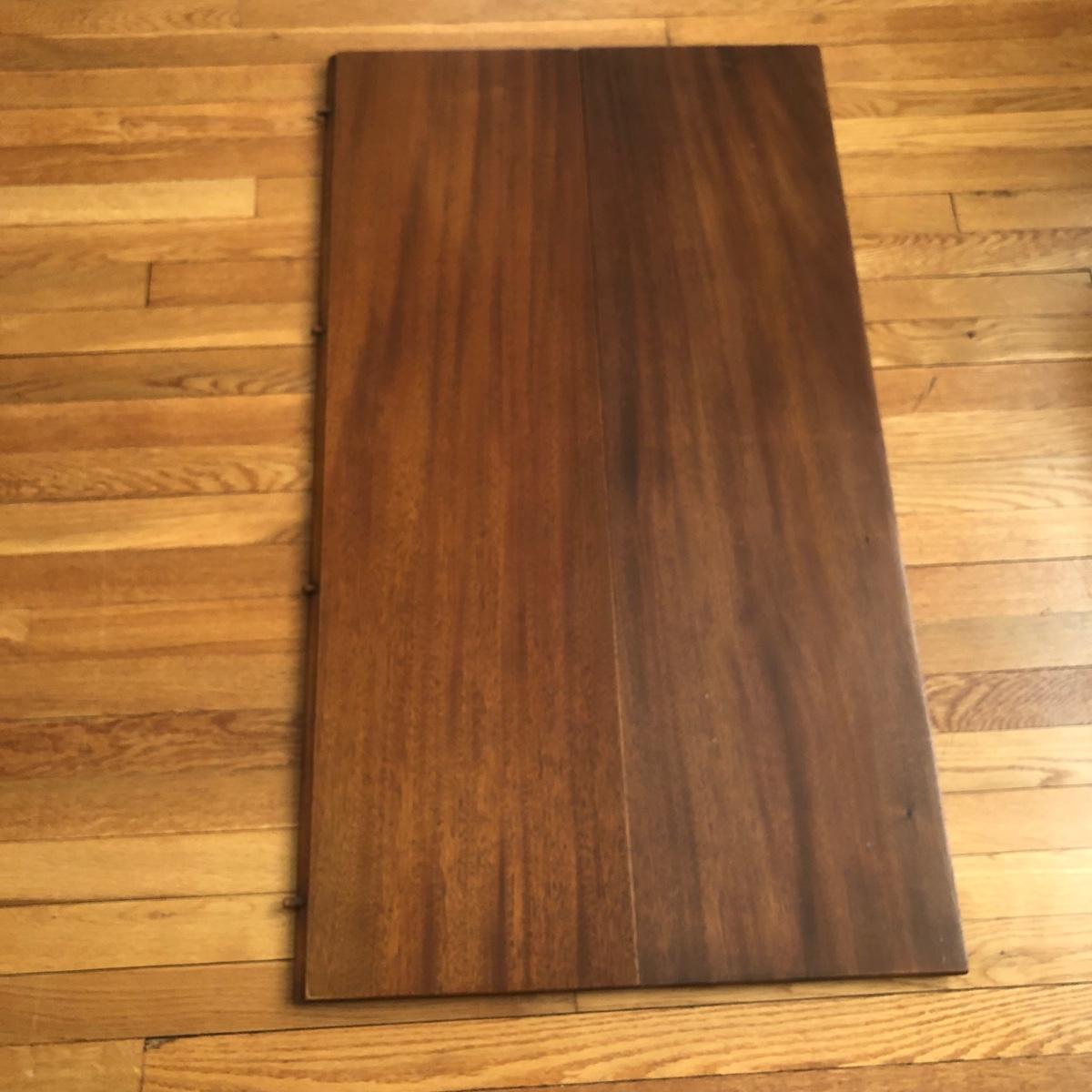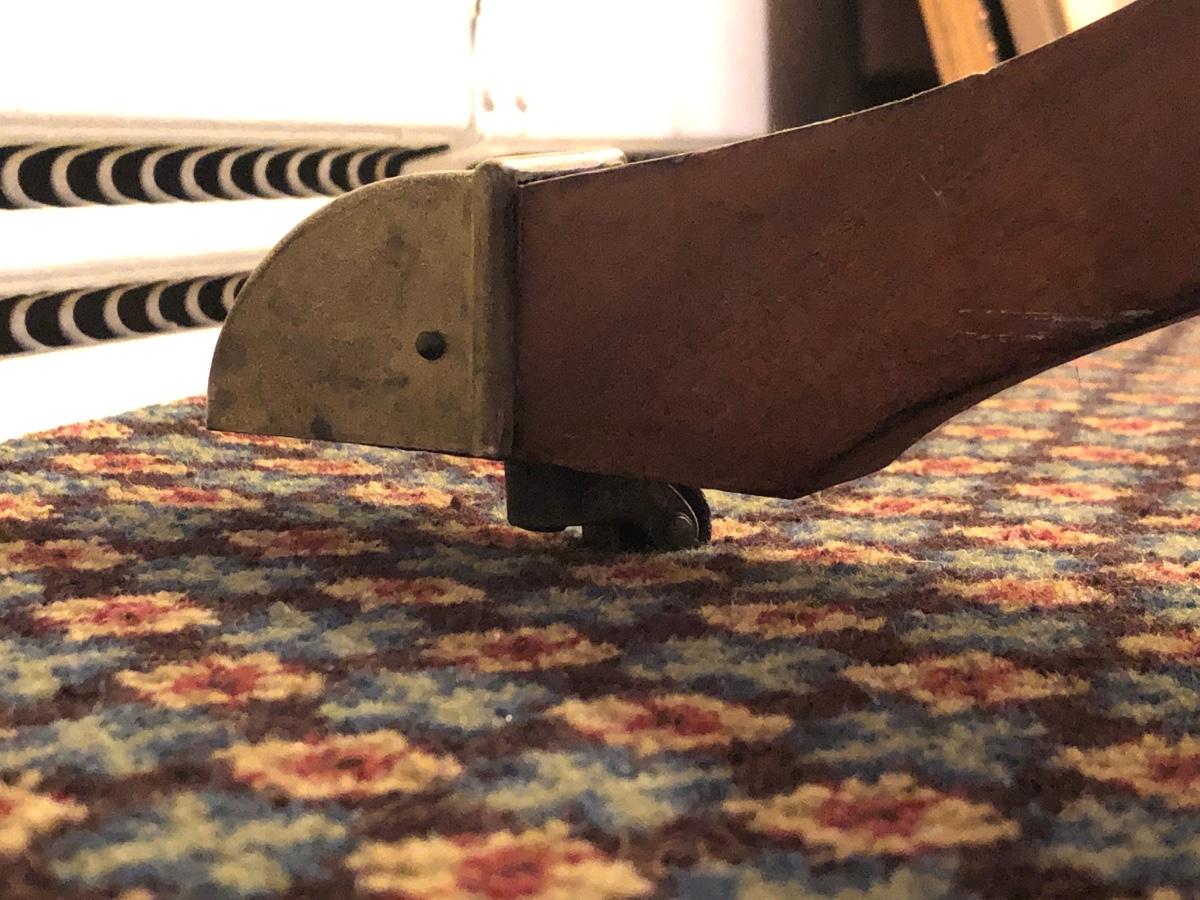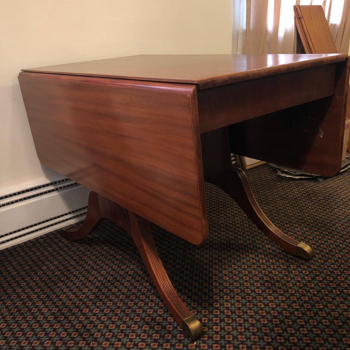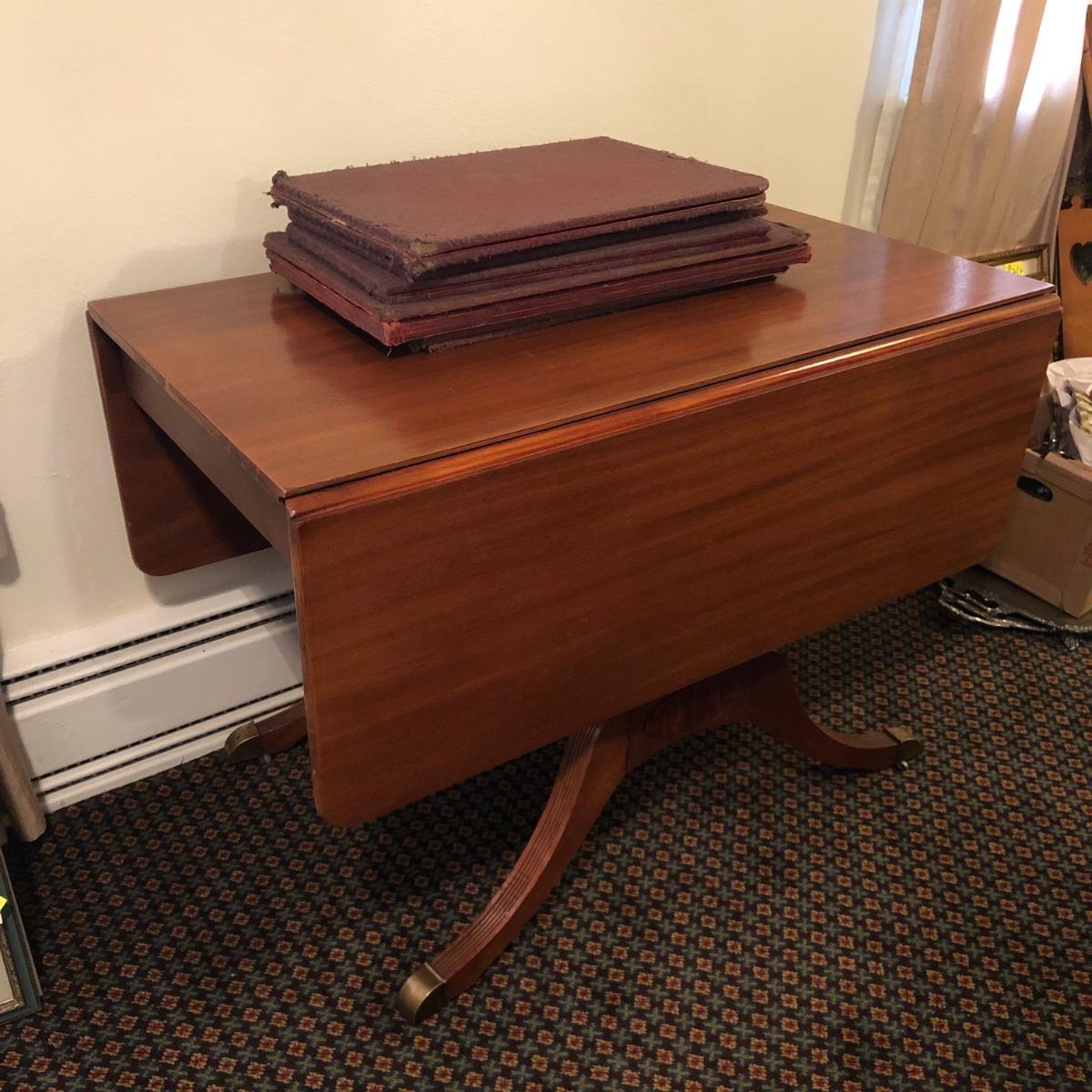 This solid wood dining room table is 6’ 5” long with both leaves extended, 5’ 5” with one leaf extended, 4’ 6” with leaves folded down. The table slid apart easily when adding and removing leaves. There are two leaves with this table. With the tabletop folded down it measures 26” and it’s height is 29.5 with a width of 42”. The table has brass-colored feet with rolling wheels. A full set of table pads or tabletop protector is included. There are 5 individual sections of table pads that are topped in red leather with felt bases. The table pads show sign of use with tabbed areas and areas where the leather has worn away. These pads can be placed on top of the table as a layer of protection for the table underneath a tablecloth when serving a meal. Some small indentations and discolorations are visible on the tabletop as pictured. Local pickup only.