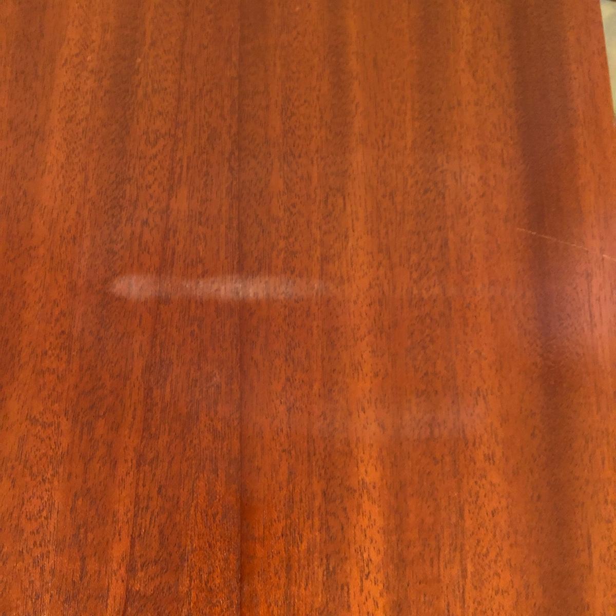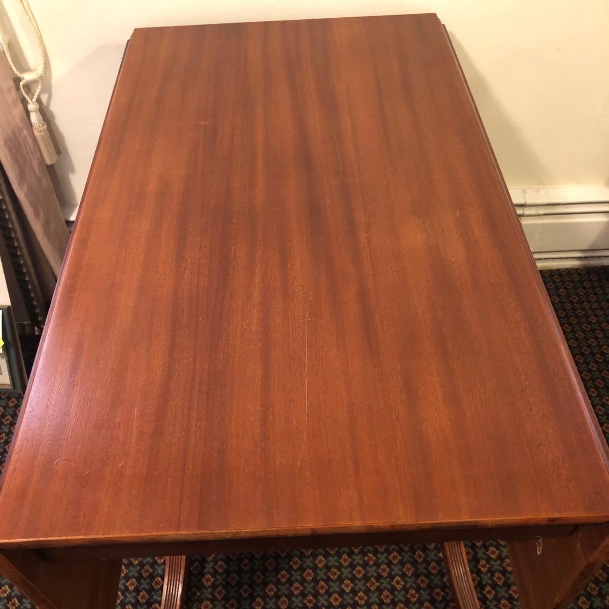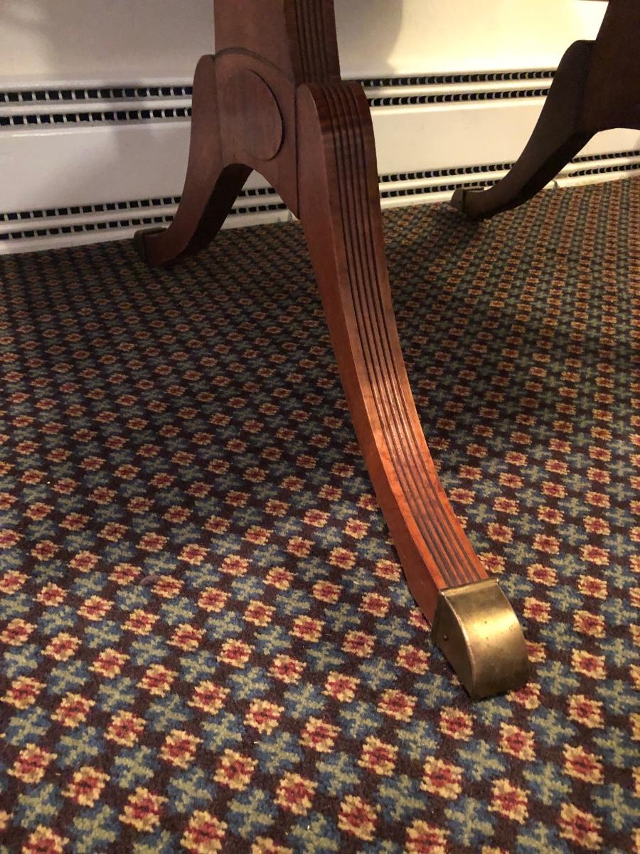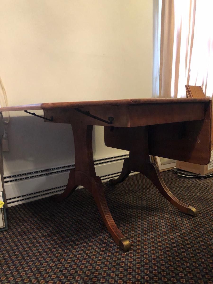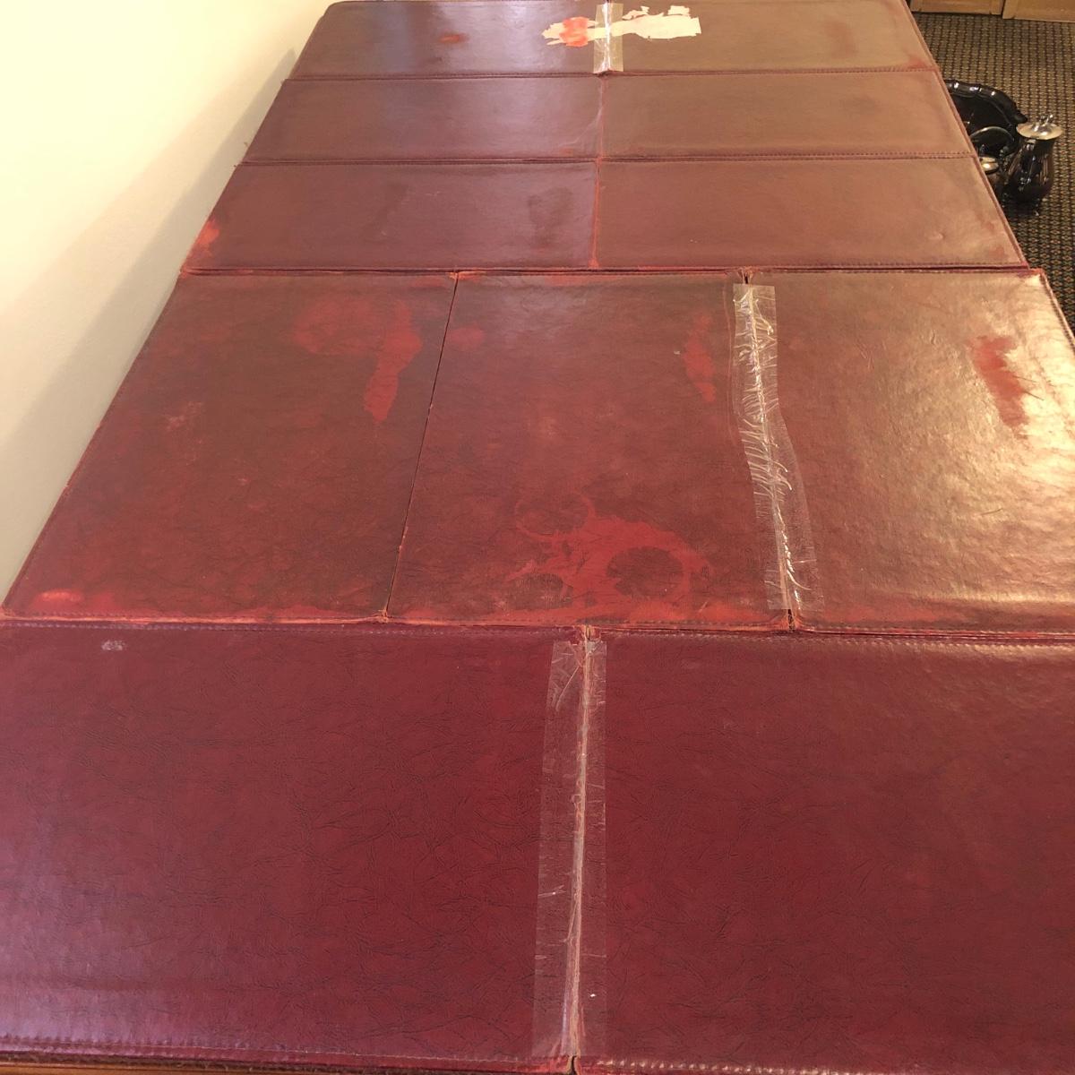 This solid wood dining room table is 6’ 5” long with both leaves extended, 5’ 5” with one leaf extended, 4’ 6” with leaves folded down. The table slid apart easily when adding and removing leaves. There are two leaves with this table. With the tabletop folded down it measures 26” and it’s height is 29.5 with a width of 42”. The table has brass-colored feet with rolling wheels. A full set of table pads or tabletop protector is included. There are 5 individual sections of table pads that are topped in red leather with felt bases. The table pads show sign of use with tabbed areas and areas where the leather has worn away. These pads can be placed on top of the table as a layer of protection for the table underneath a tablecloth when serving a meal. Some small indentations and discolorations are visible on the tabletop as pictured. Local pickup only.