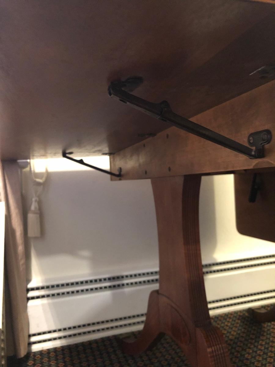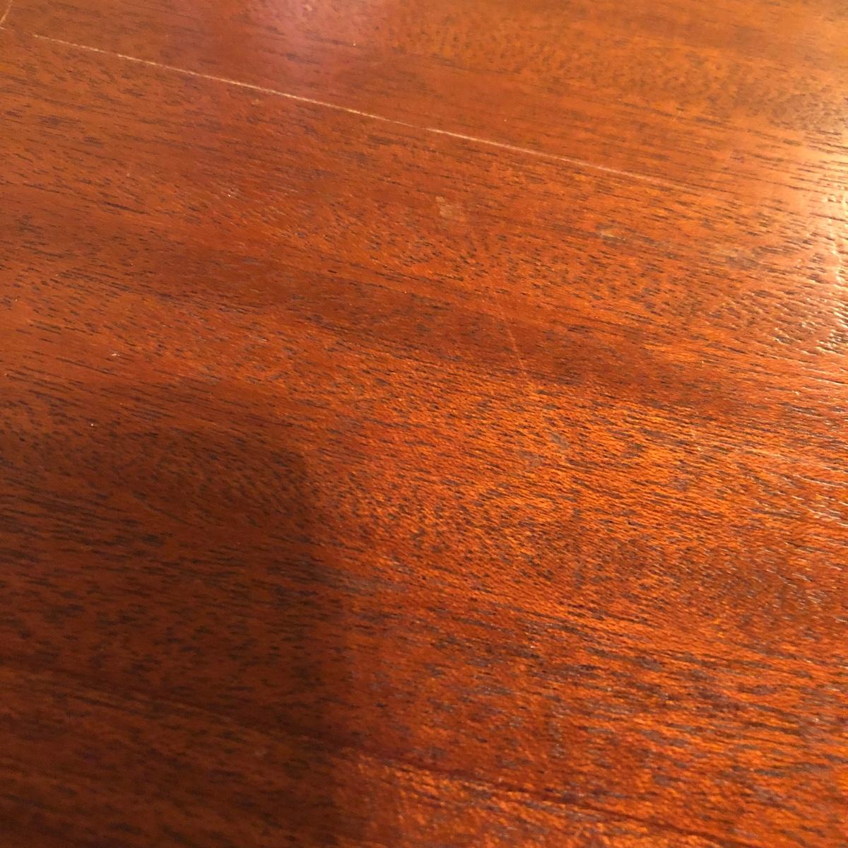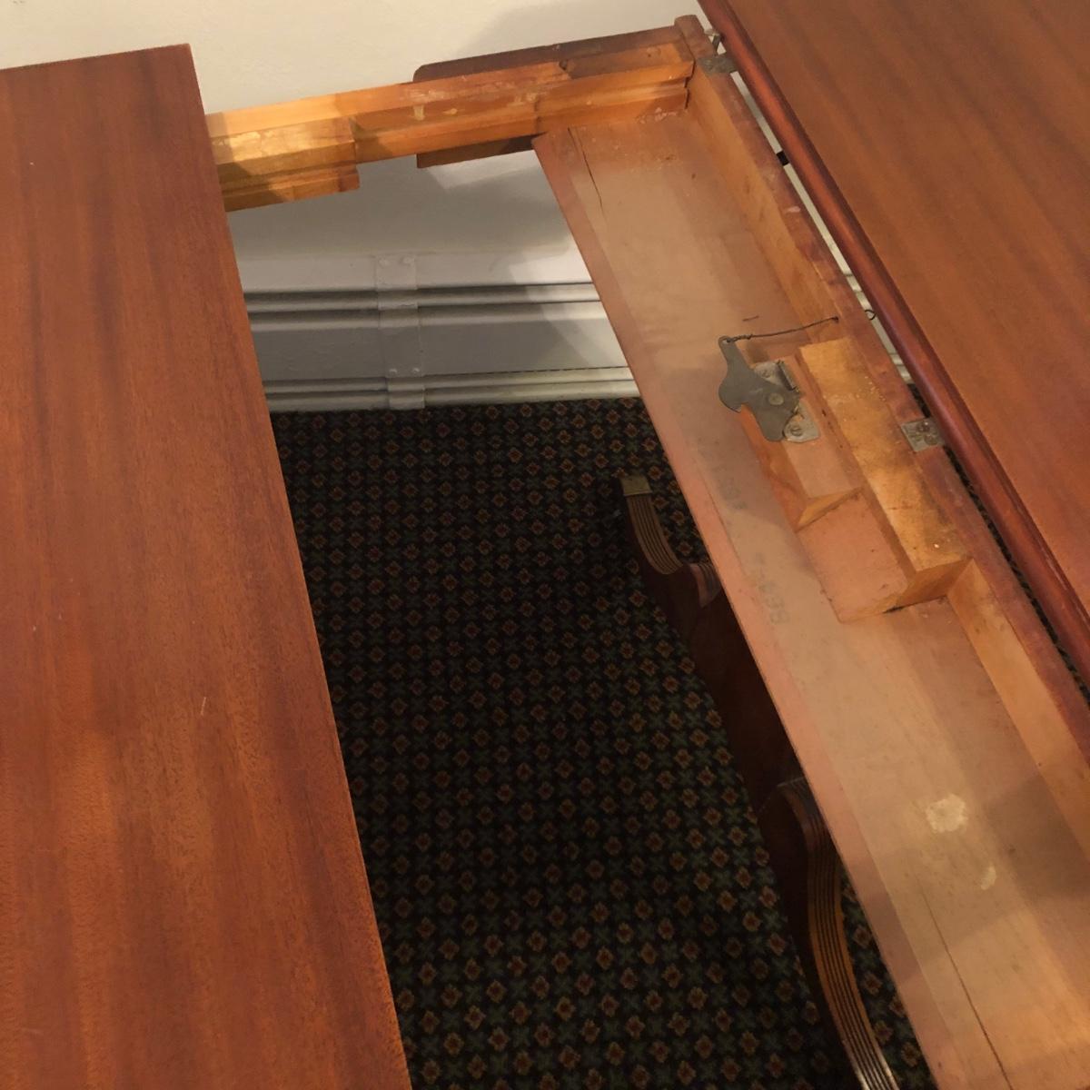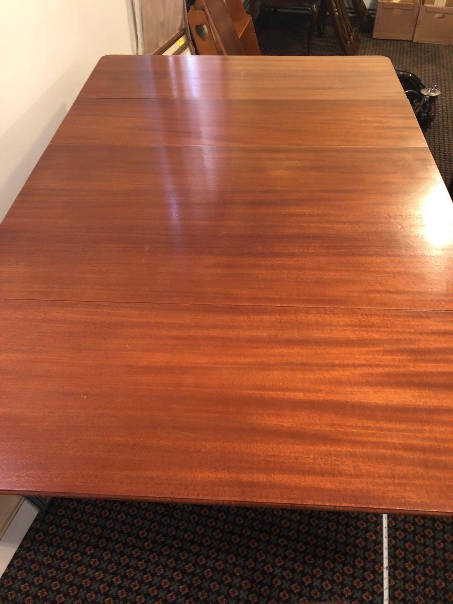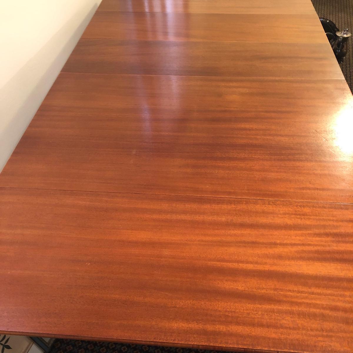 This solid wood dining room table is 6’ 5” long with both leaves extended, 5’ 5” with one leaf extended, 4’ 6” with leaves folded down. The table slid apart easily when adding and removing leaves. There are two leaves with this table. With the tabletop folded down it measures 26” and it’s height is 29.5 with a width of 42”. The table has brass-colored feet with rolling wheels. A full set of table pads or tabletop protector is included. There are 5 individual sections of table pads that are topped in red leather with felt bases. The table pads show sign of use with tabbed areas and areas where the leather has worn away. These pads can be placed on top of the table as a layer of protection for the table underneath a tablecloth when serving a meal. Some small indentations and discolorations are visible on the tabletop as pictured. Local pickup only.