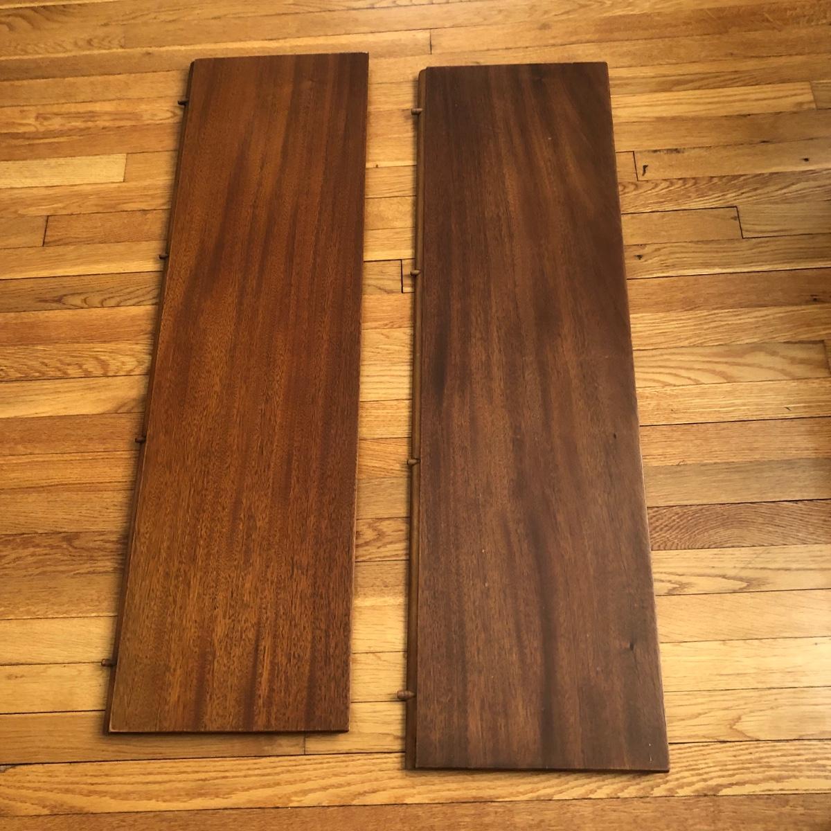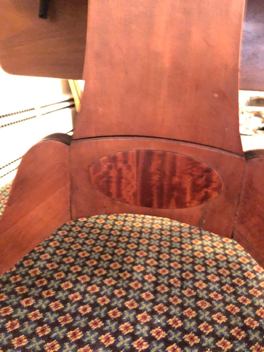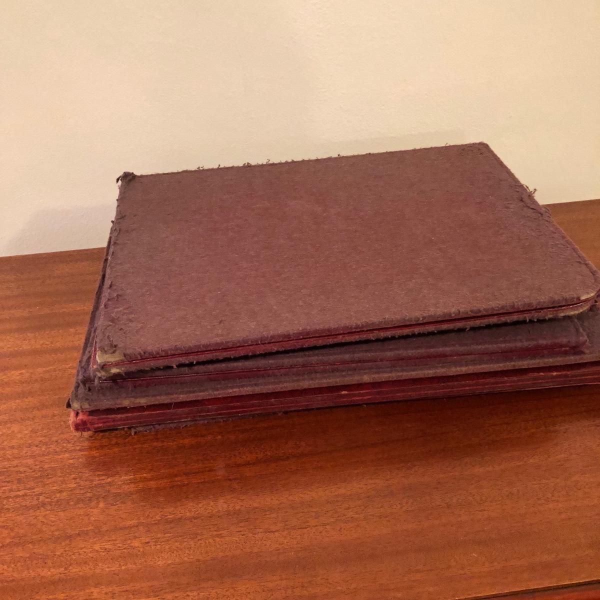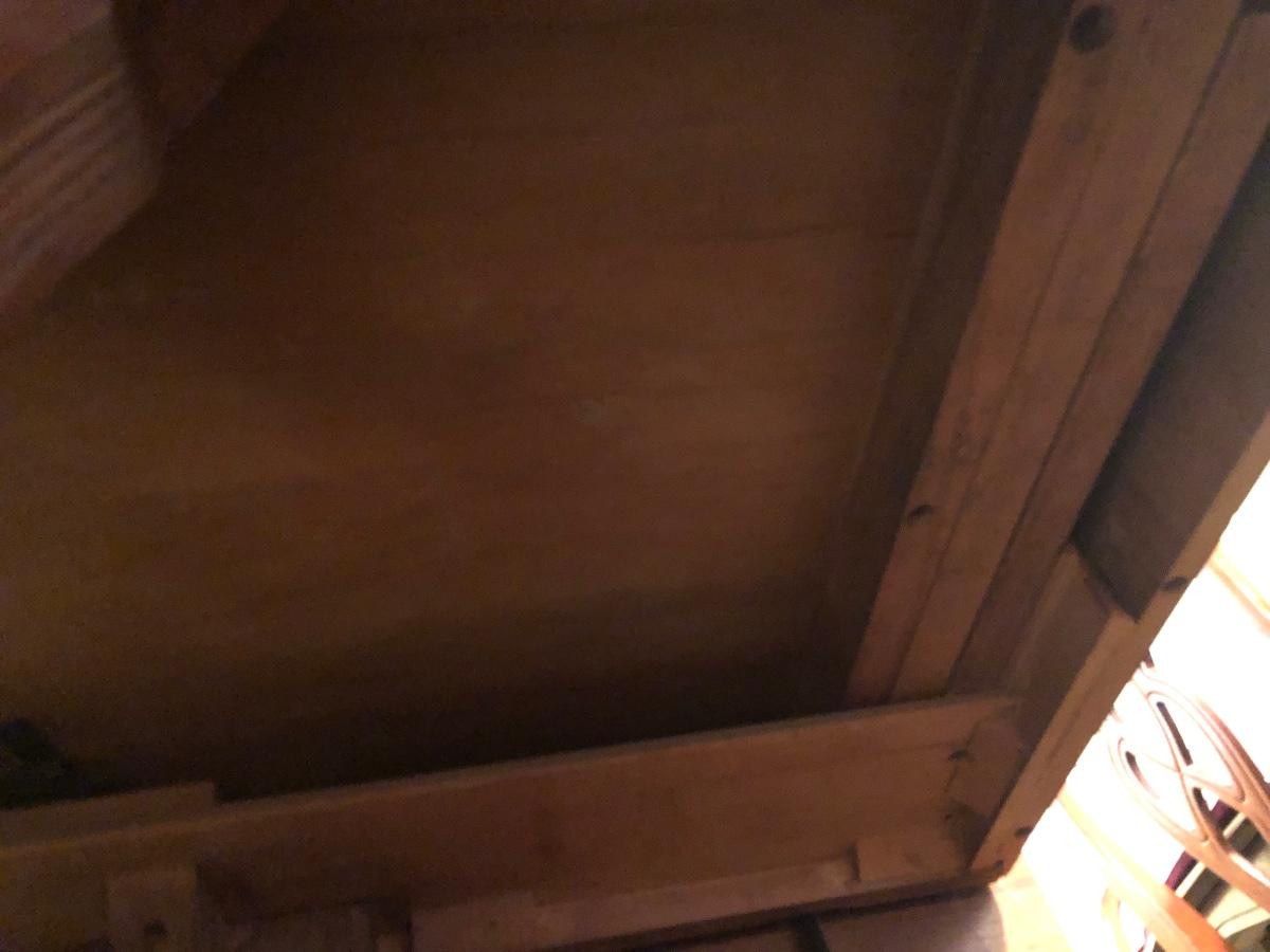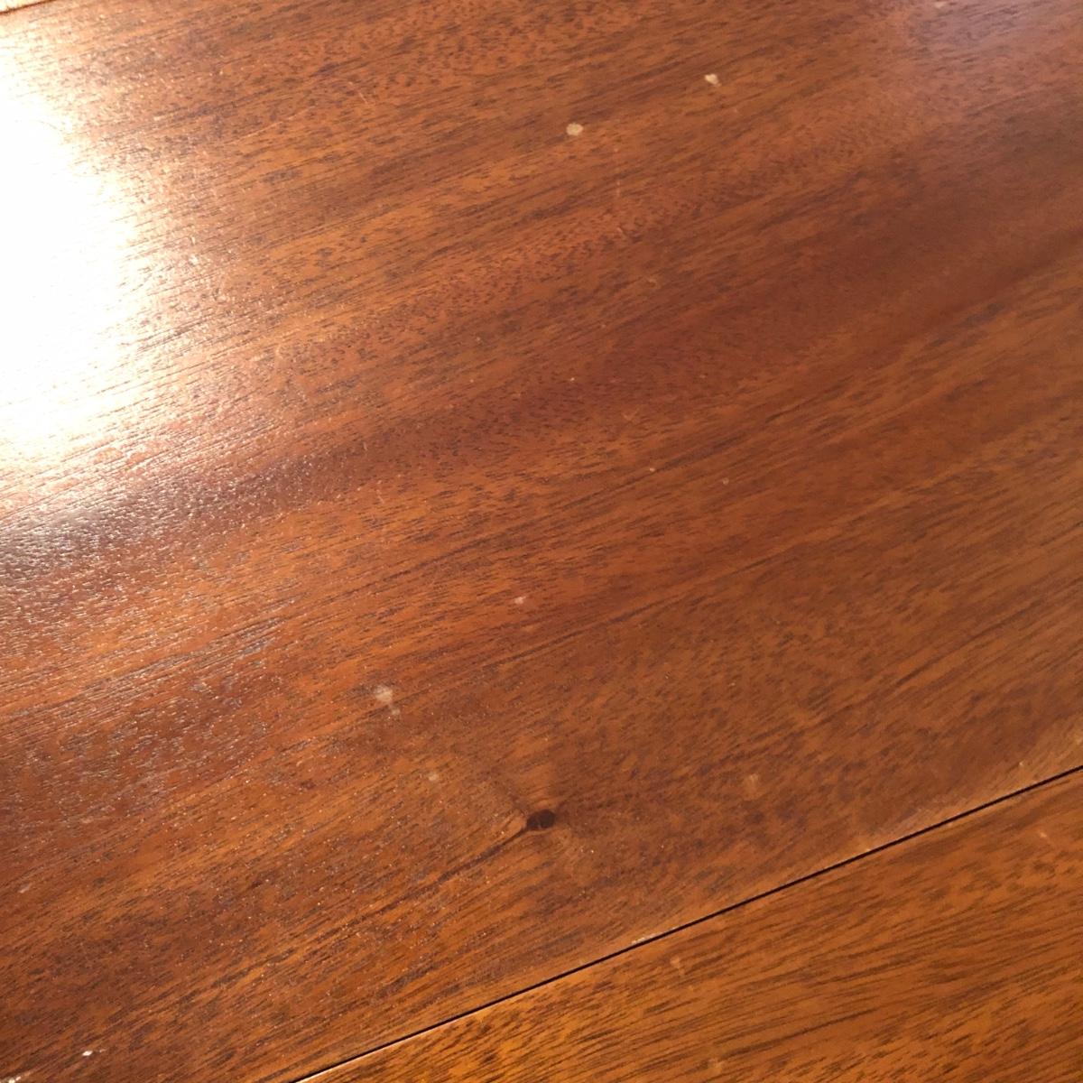 This solid wood dining room table is 6’ 5” long with both leaves extended, 5’ 5” with one leaf extended, 4’ 6” with leaves folded down. The table slid apart easily when adding and removing leaves. There are two leaves with this table. With the tabletop folded down it measures 26” and it’s height is 29.5 with a width of 42”. The table has brass-colored feet with rolling wheels. A full set of table pads or tabletop protector is included. There are 5 individual sections of table pads that are topped in red leather with felt bases. The table pads show sign of use with tabbed areas and areas where the leather has worn away. These pads can be placed on top of the table as a layer of protection for the table underneath a tablecloth when serving a meal. Some small indentations and discolorations are visible on the tabletop as pictured. Local pickup only.