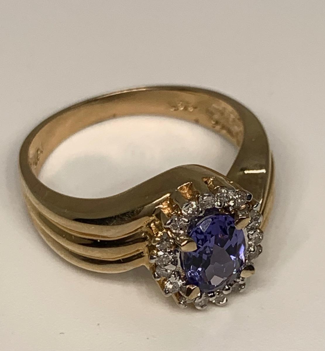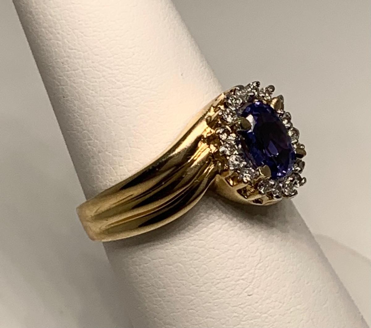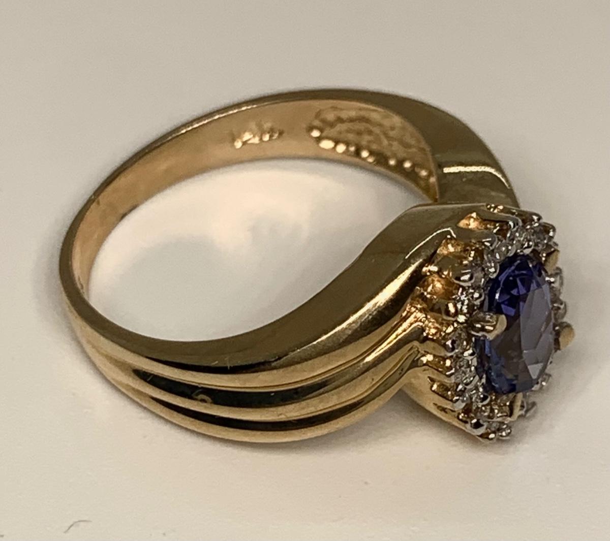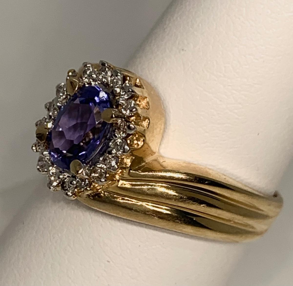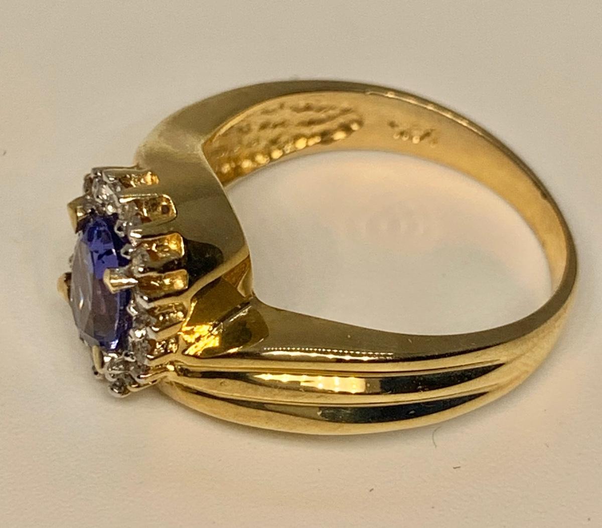 Tw 4.3g 14k ABR Yellow Gold Tanzanite Ring w/ Halo of Diamond Chips  sz7