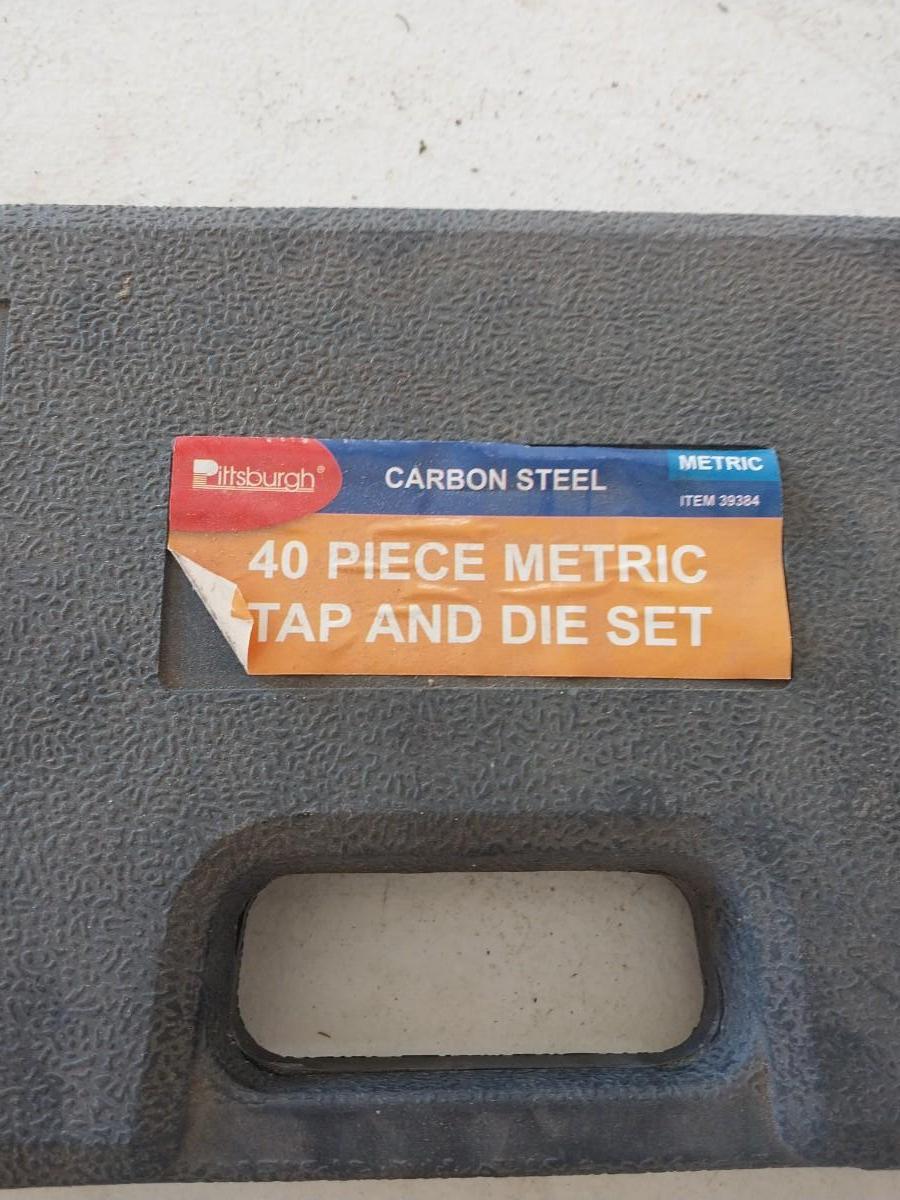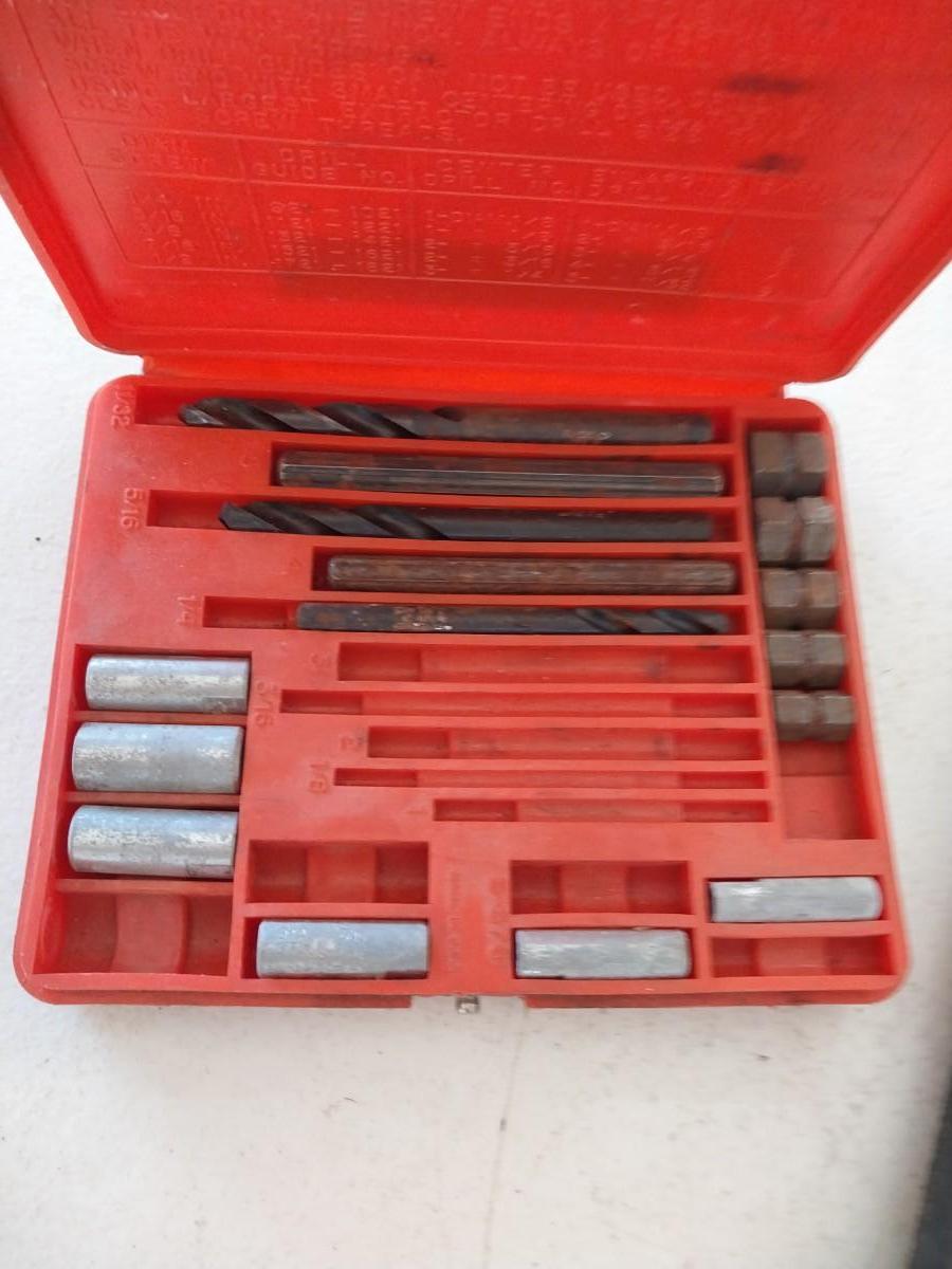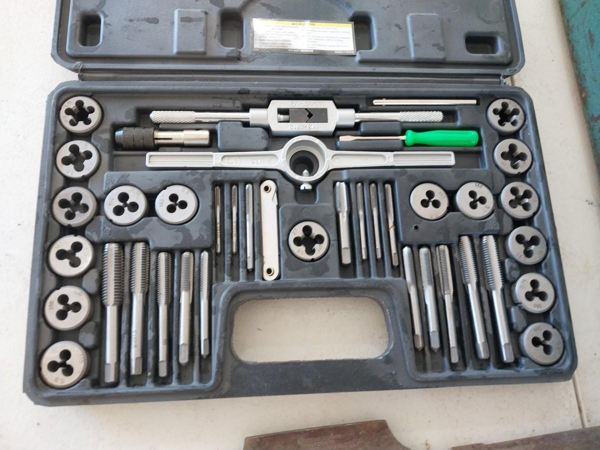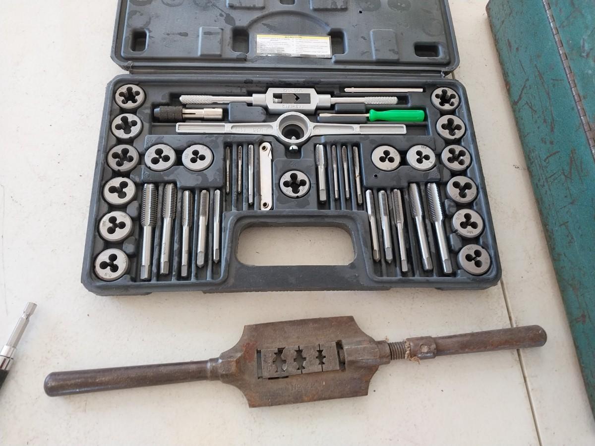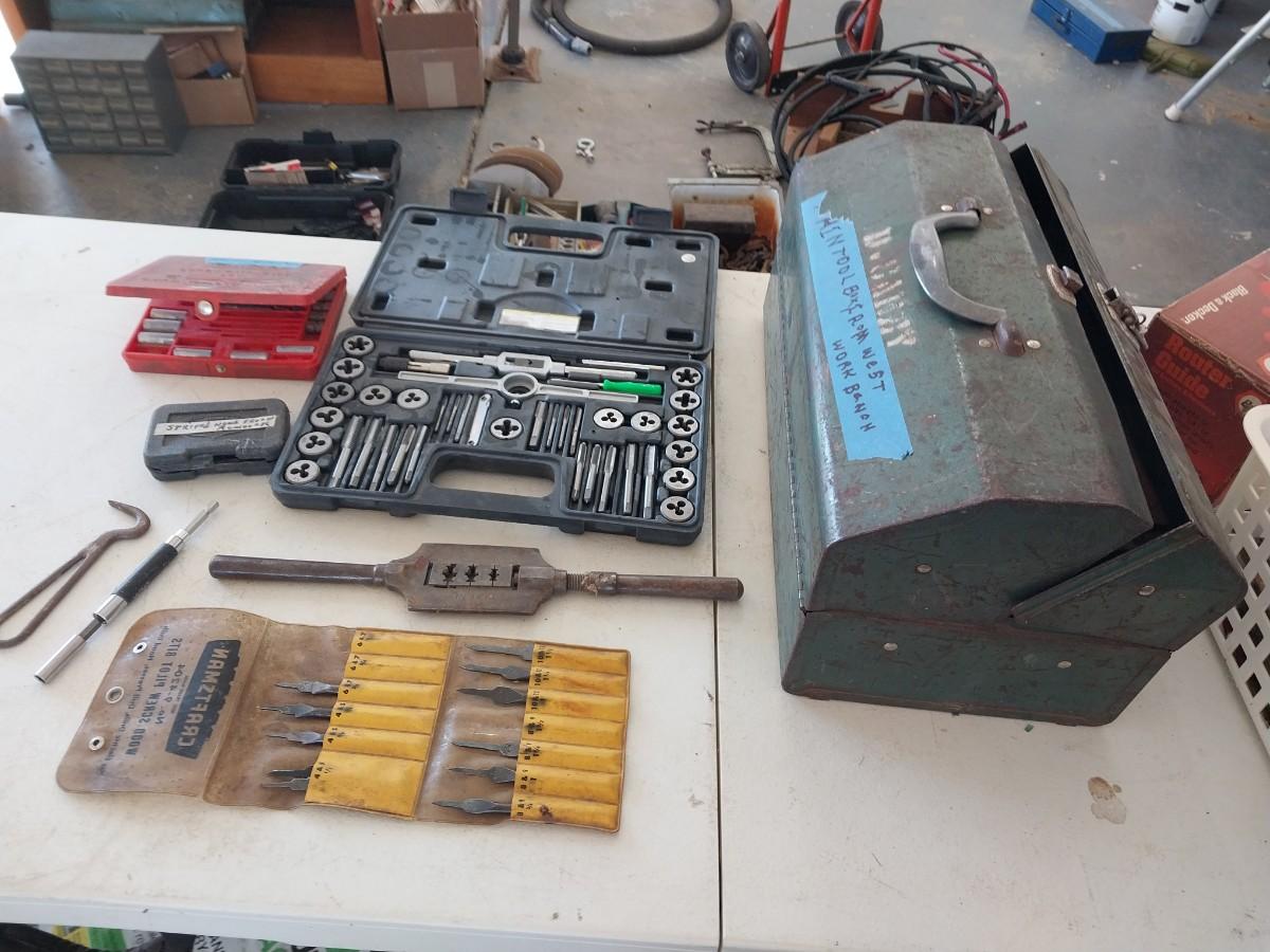 TAP AND DIE SET, SCREW EXTRACTOR, METAL TOOL BOX AND MORE,