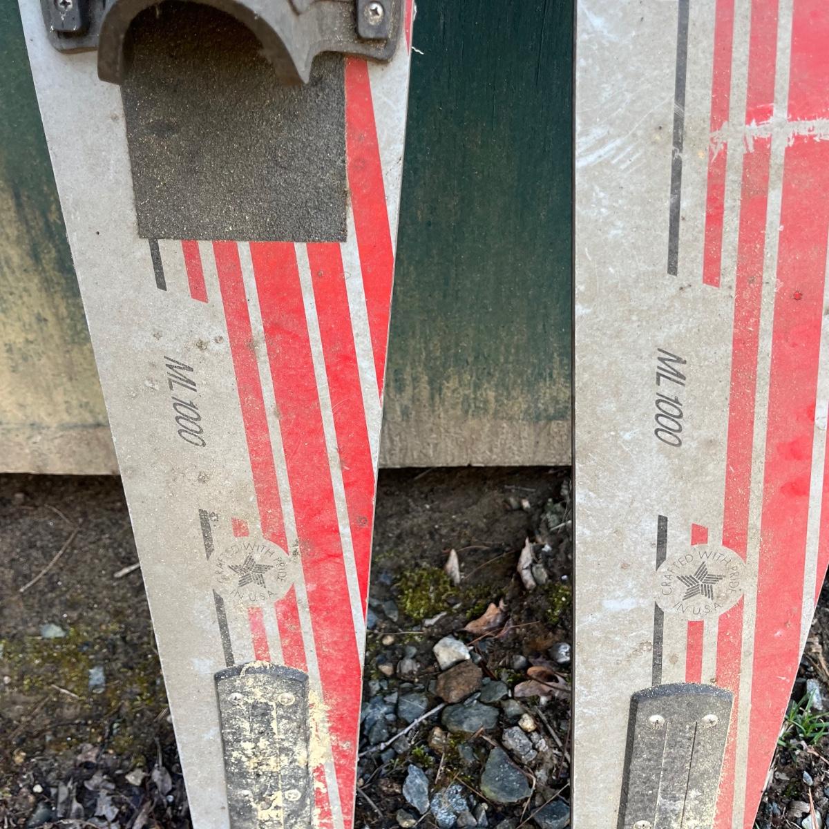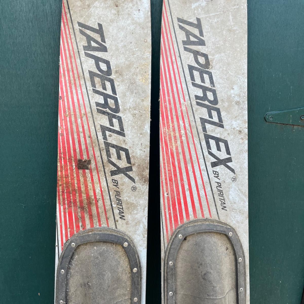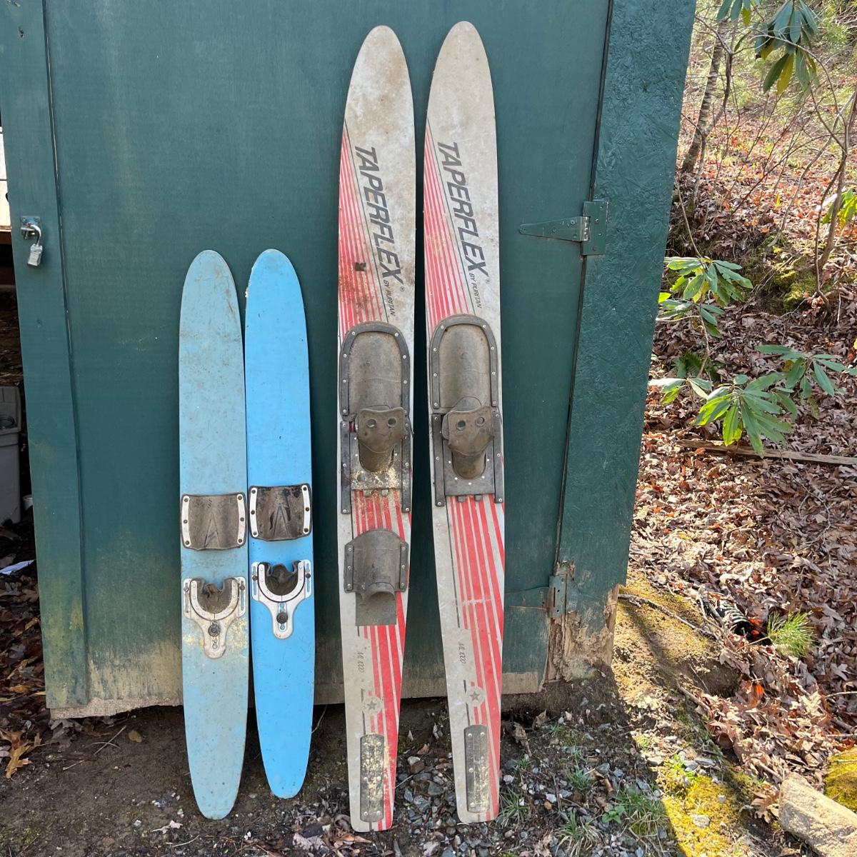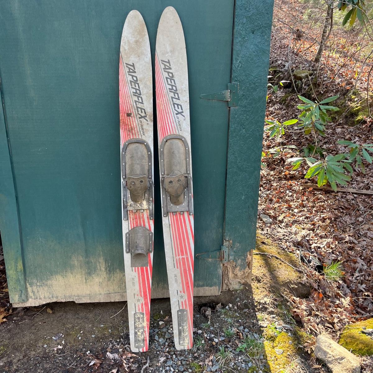 Lot includes a pair of Taperflex ML 1000 water skis and a pair of wooden water skis. Taperflex skis measure 6.5” x 67”.
