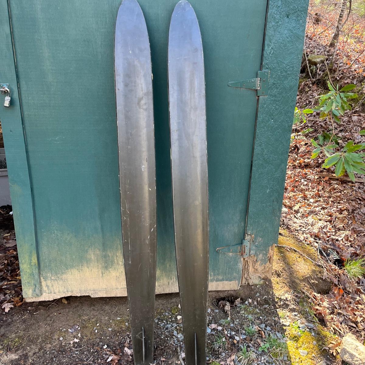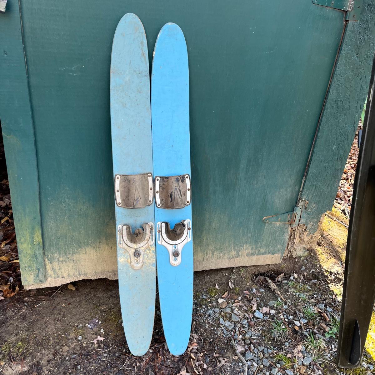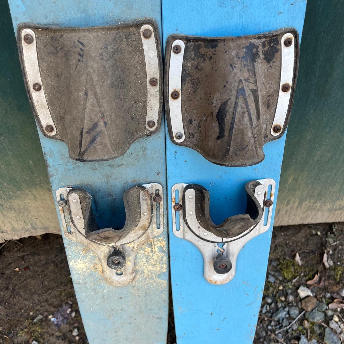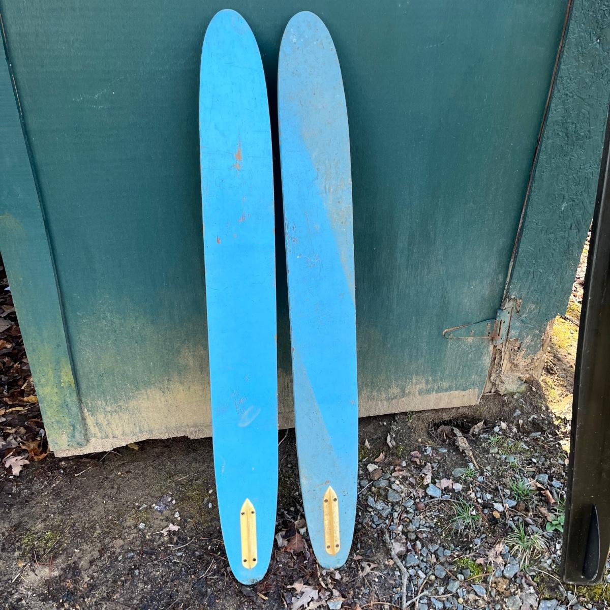 Lot includes a pair of Taperflex ML 1000 water skis and a pair of wooden water skis. Taperflex skis measure 6.5” x 67”.