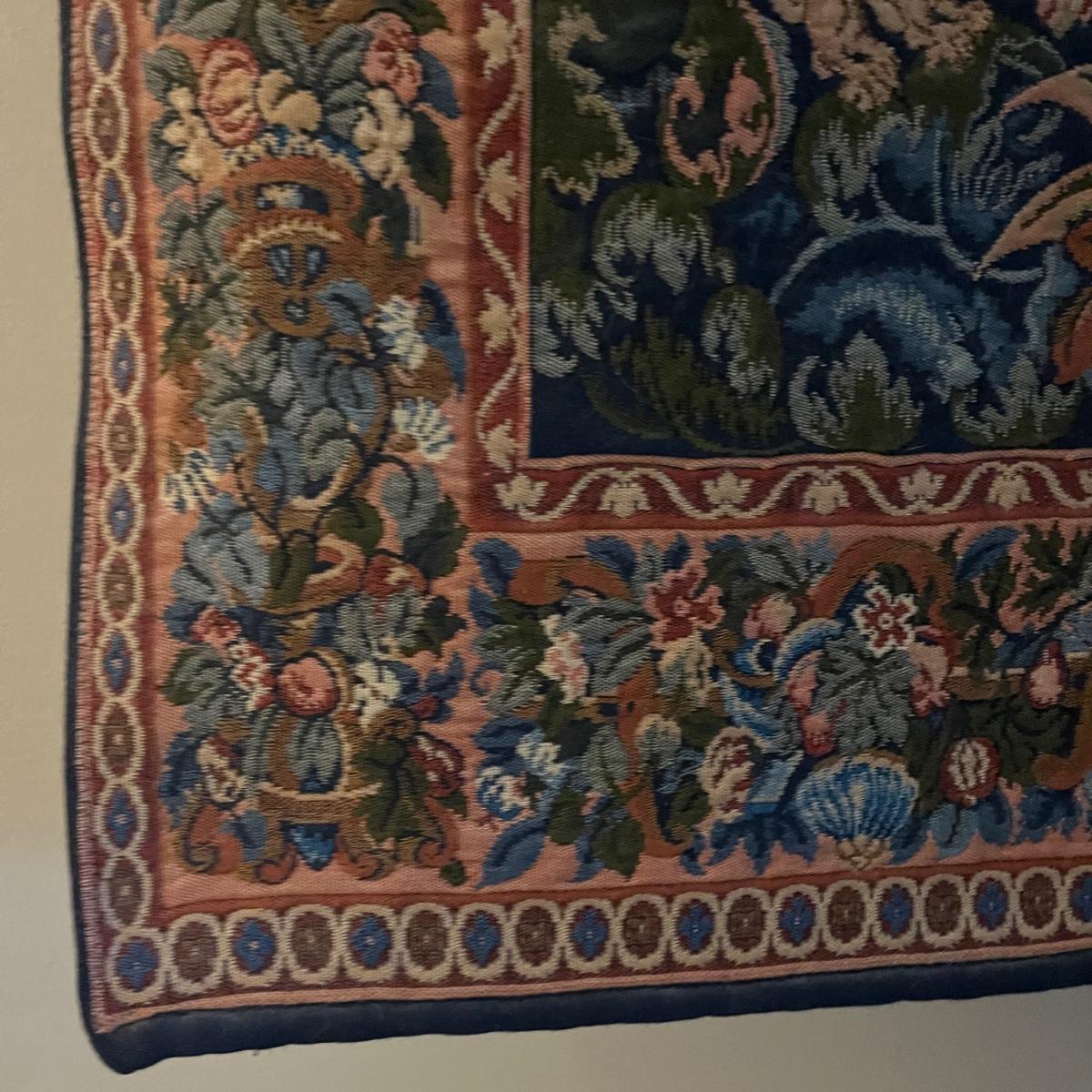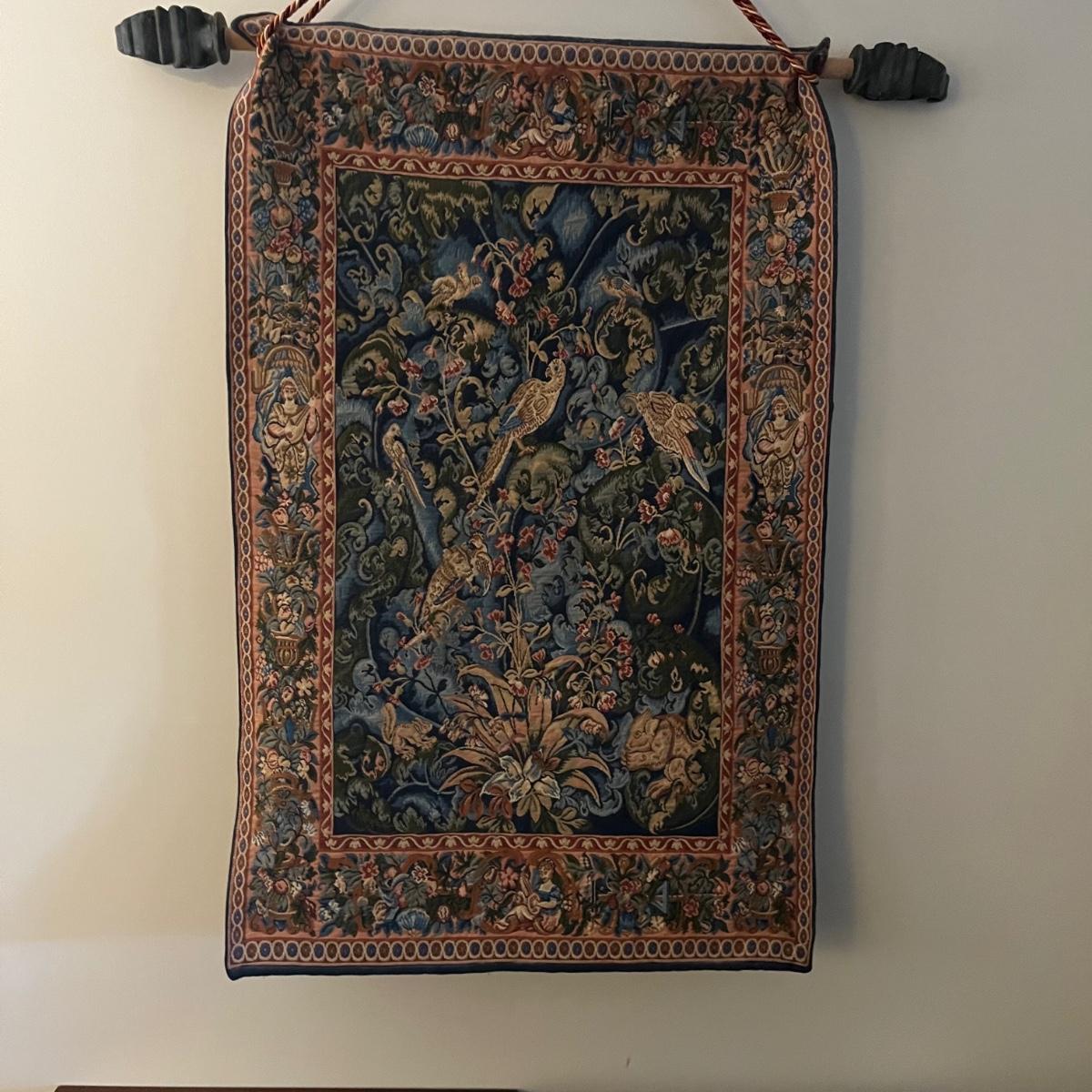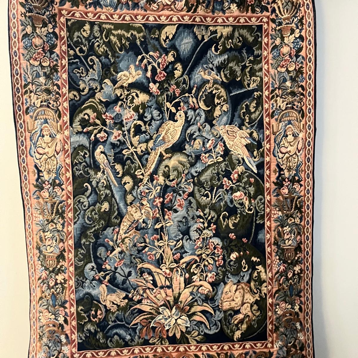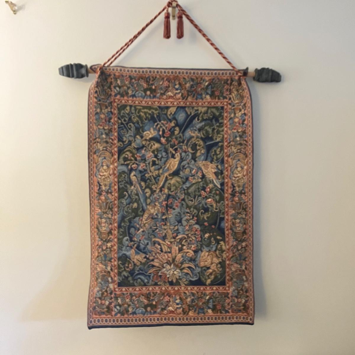 Lot includes a tapestry with a pheasant motif that measures 27” x 42”. Piece has pet hair on back, see pictures.