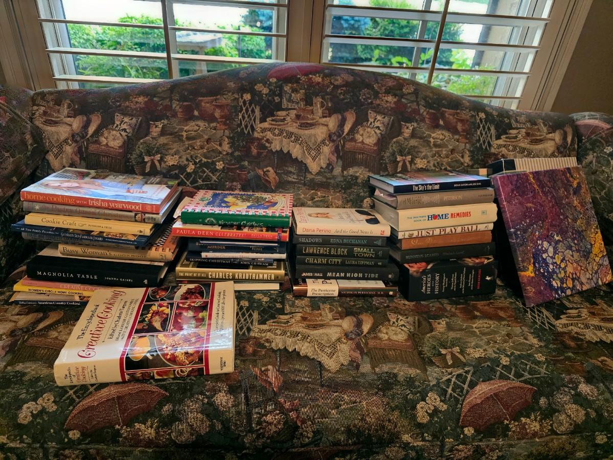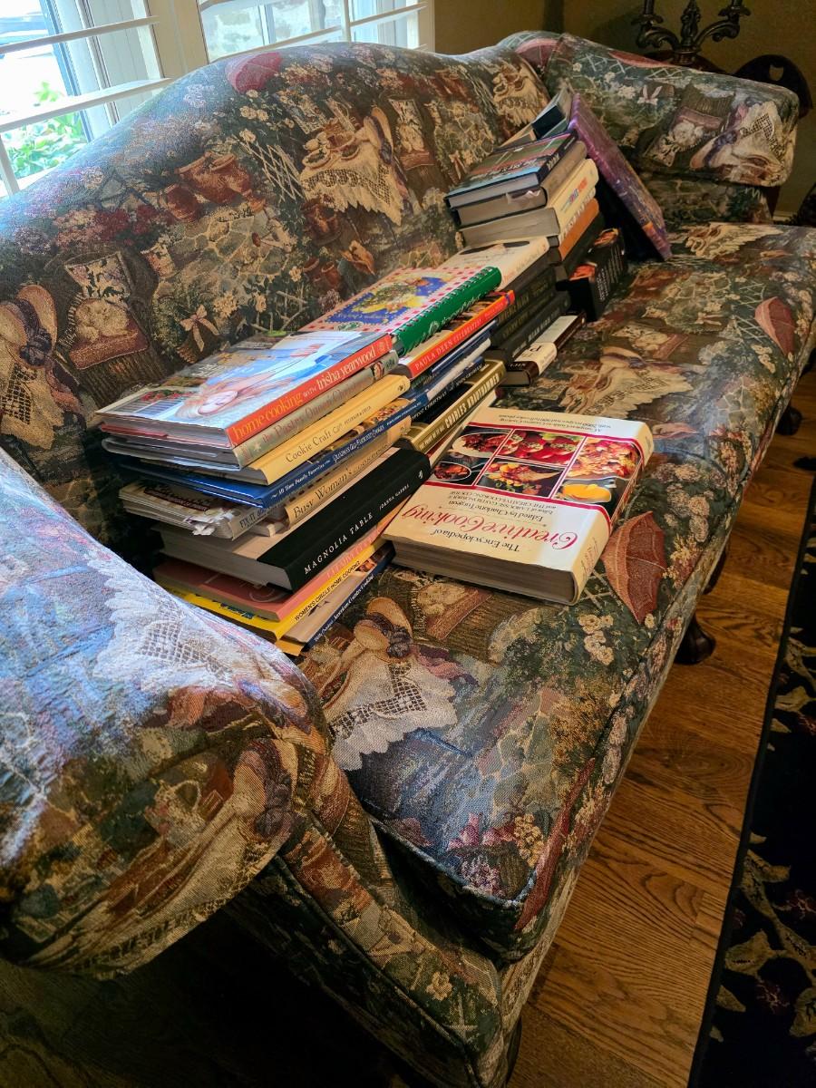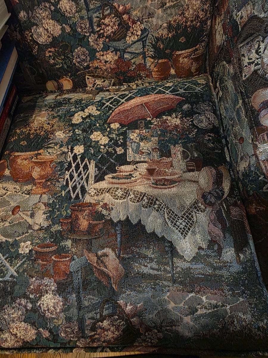 Tapestry Upholstery sofa with books lot. Must take sofa and books. Sofa measures 77"L x 33"D x 35"H