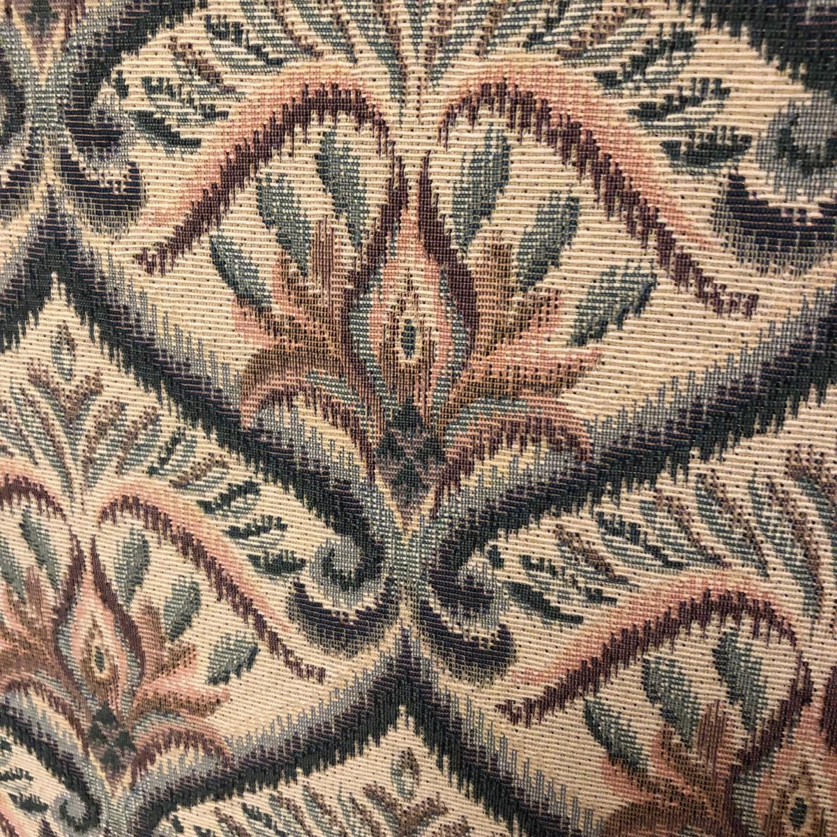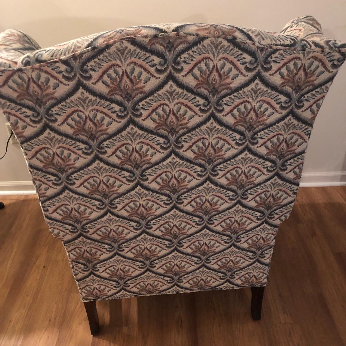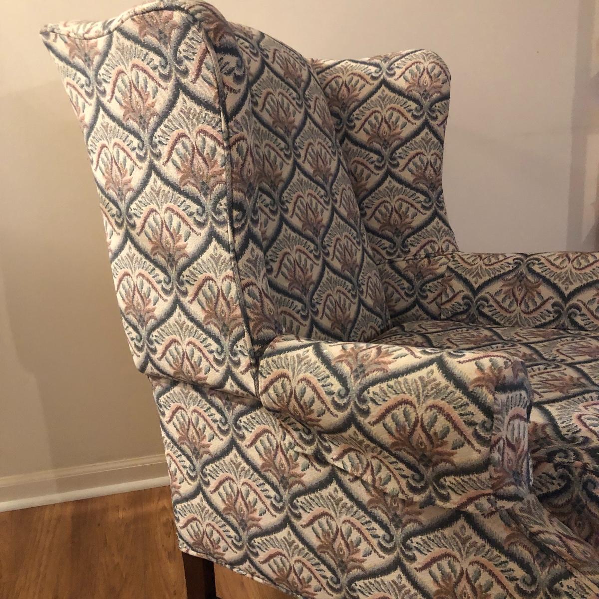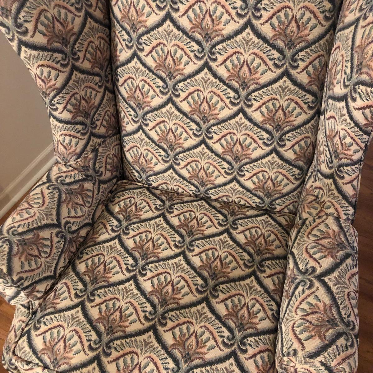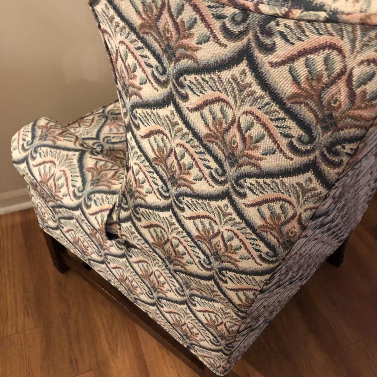 This tapestry style wing back chair has browns, pinks and greens. The chair measures 31.5” (arm to arm) x 28.5” x 40” with a seat height of 20”. Local pick up only.