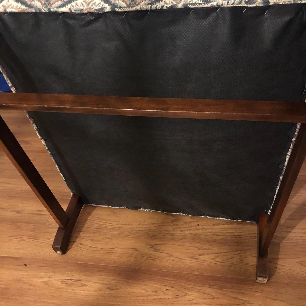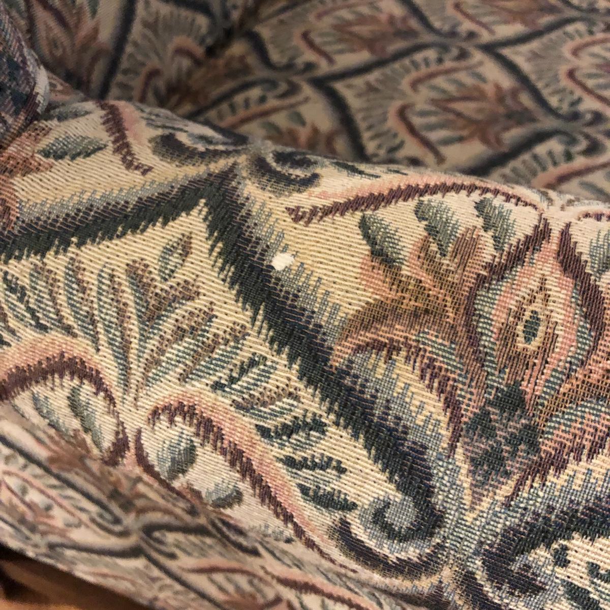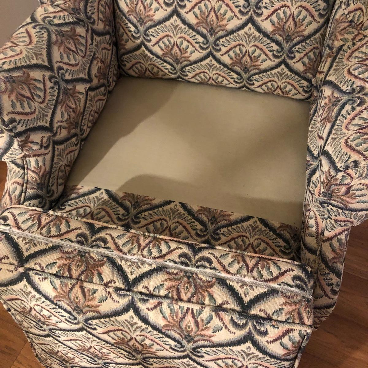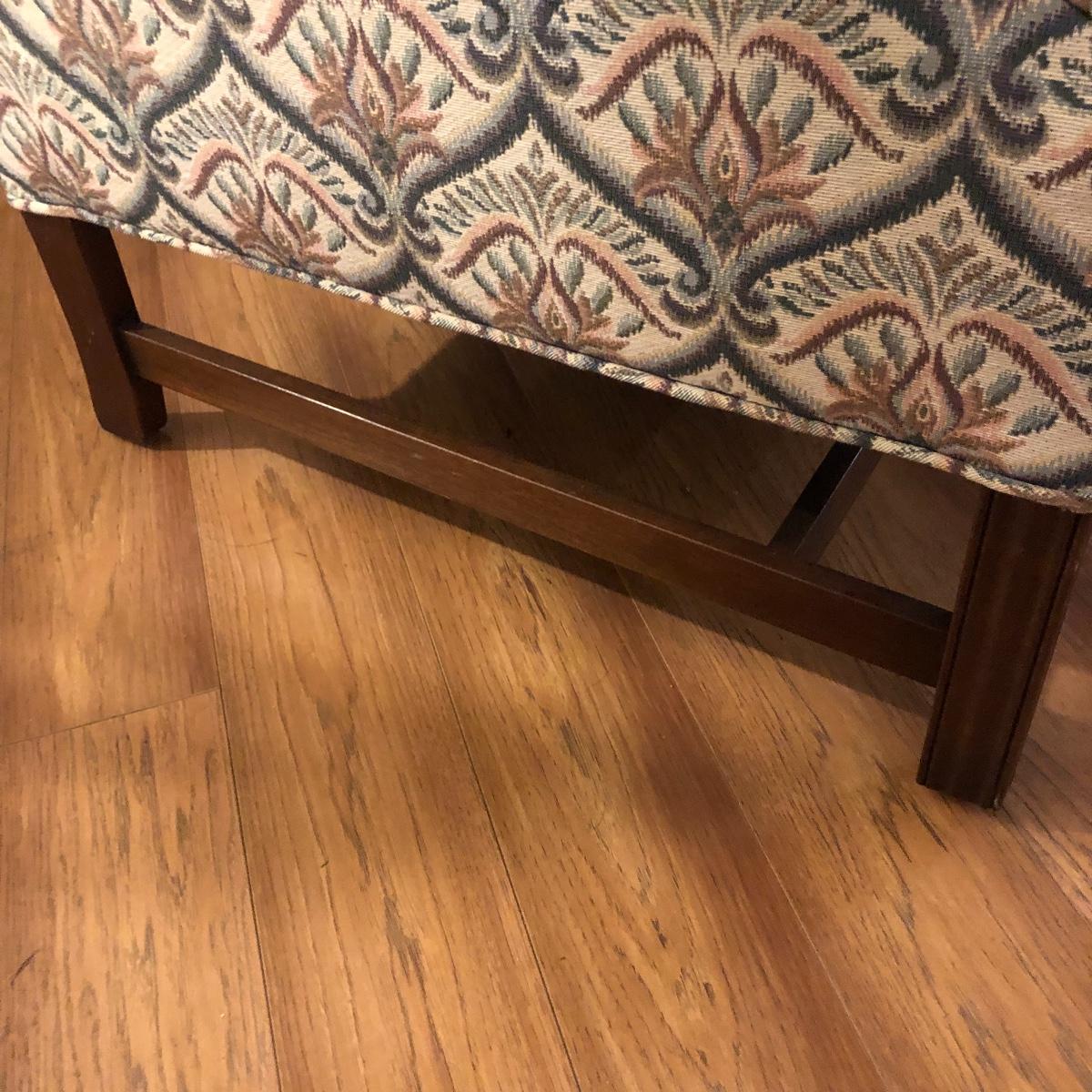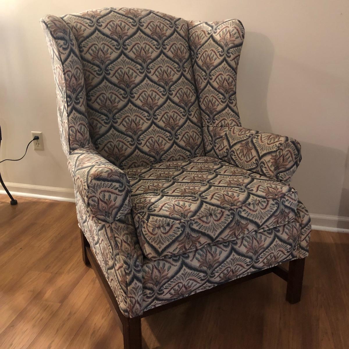 This tapestry style wing back chair has browns, pinks and greens. The chair measures 31.5” (arm to arm) x 28.5” x 40” with a seat height of 20”. Local pick up only.
