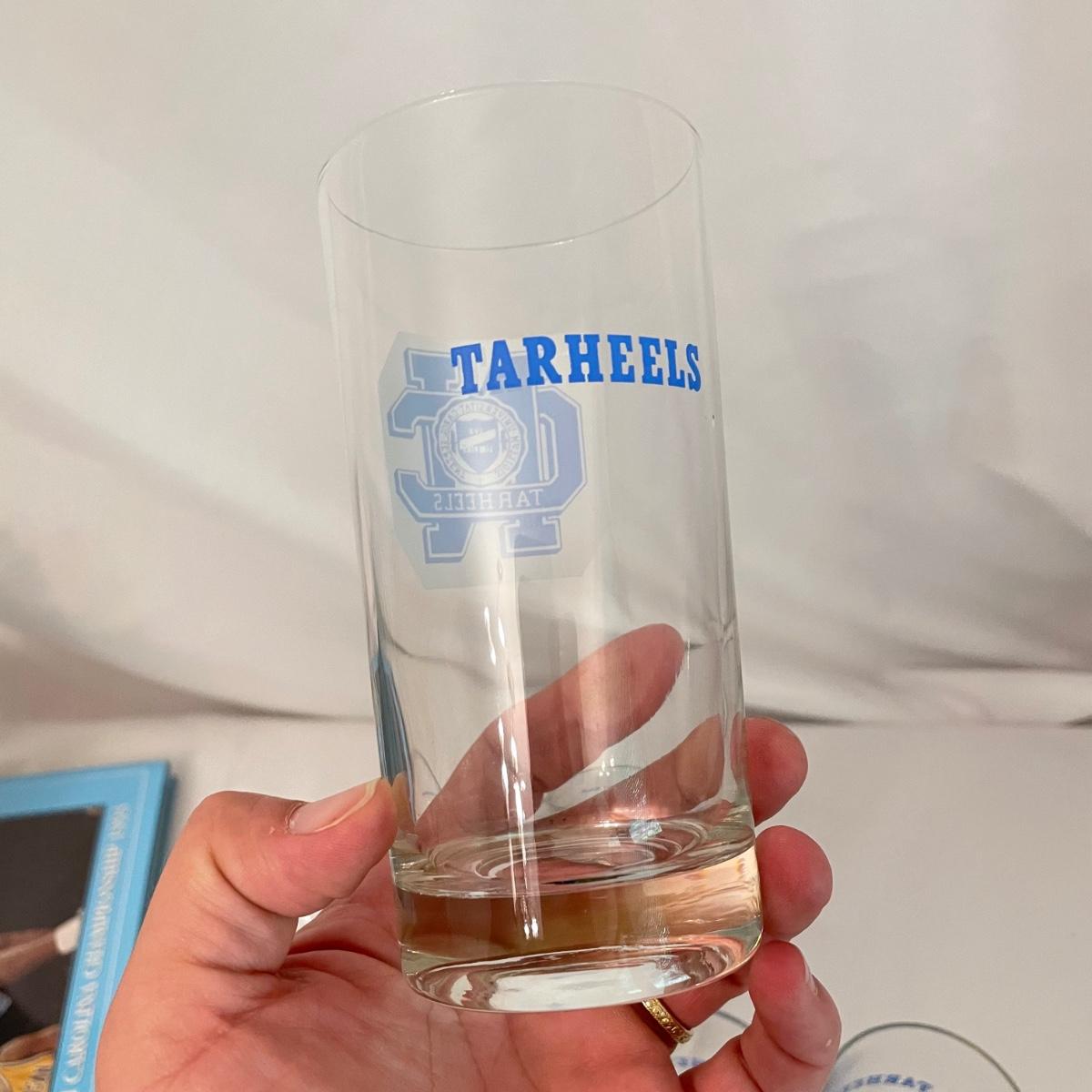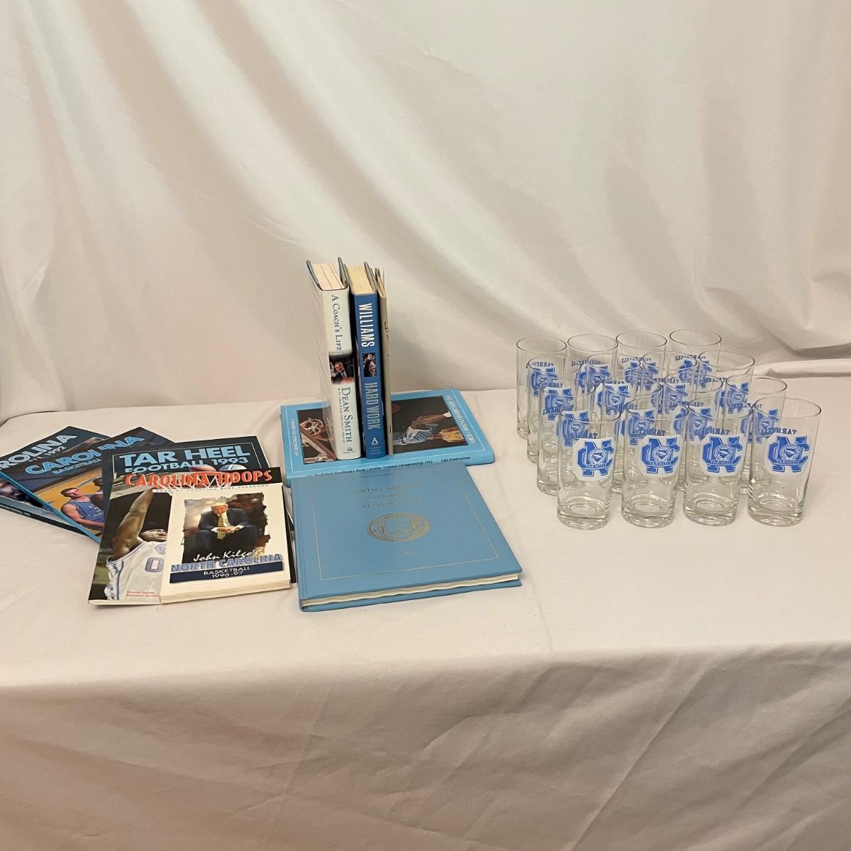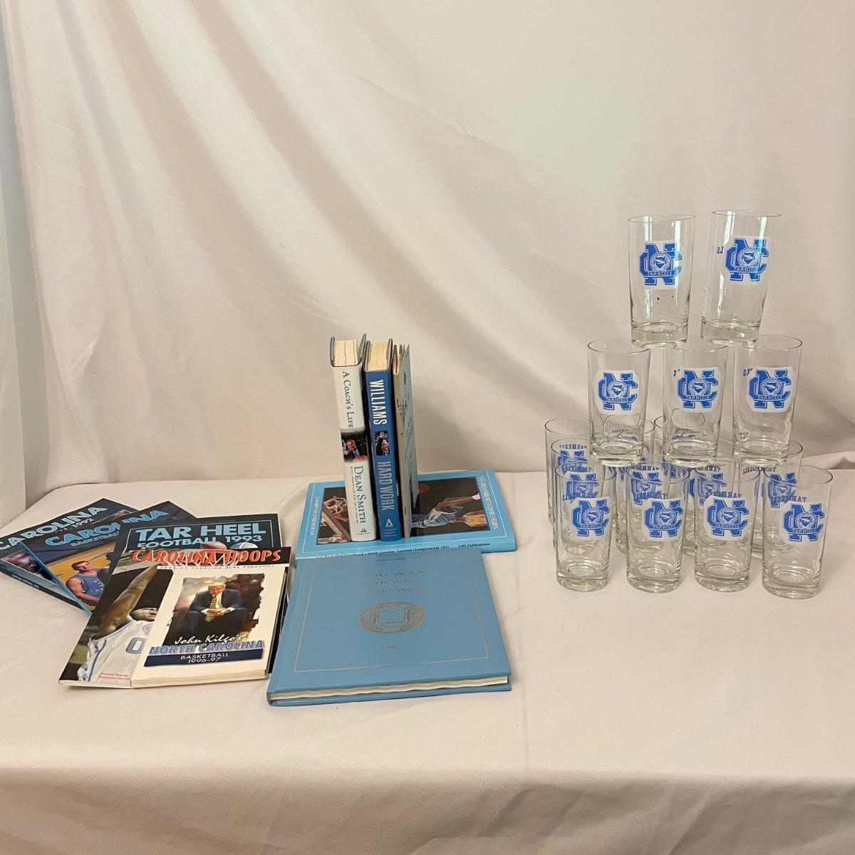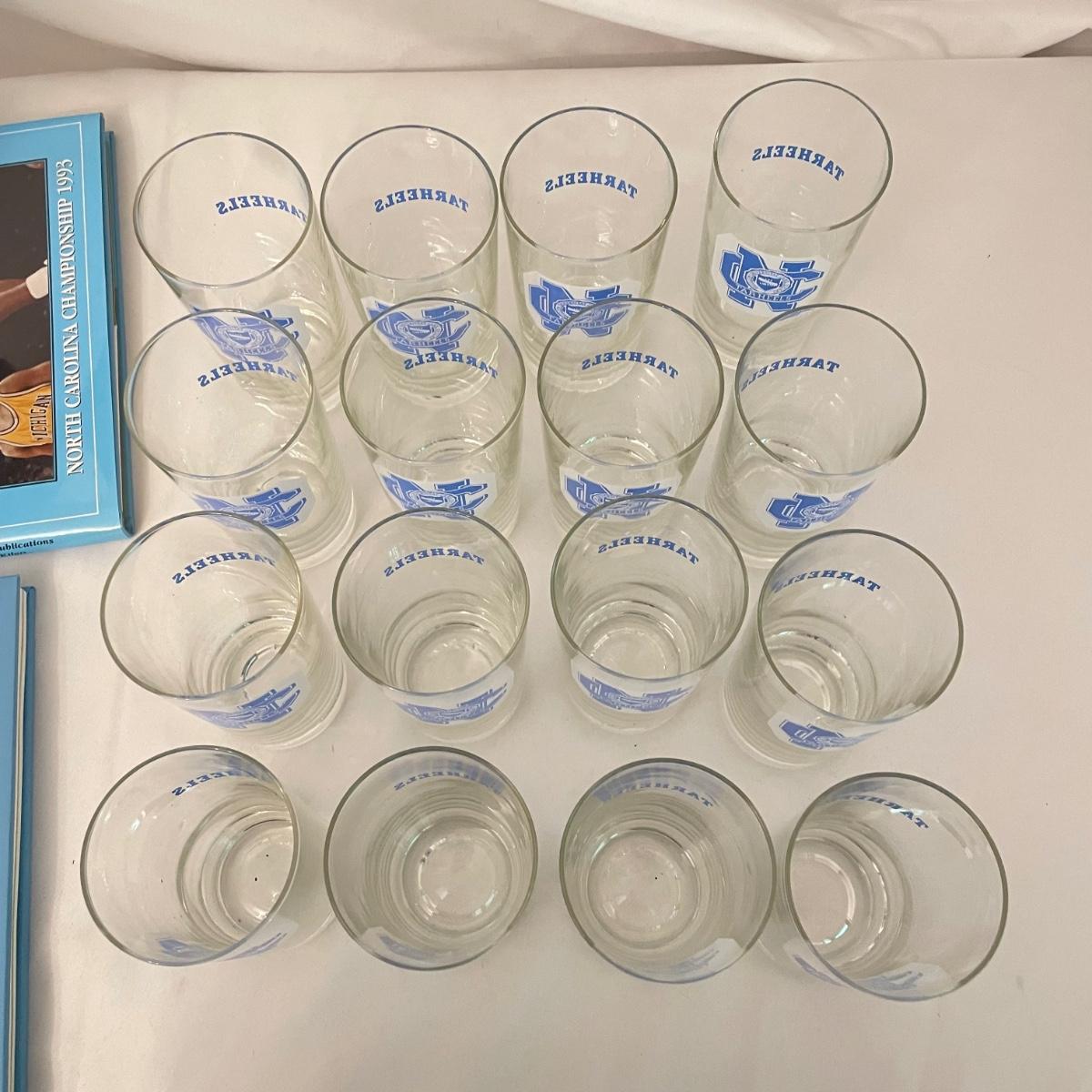 Four hard cover books, two paperbacks and four magazines all things Tar Heel sports. Lot also includes sixteen matching, like-new glasses standing 5.5” tall. See images. Shipping available.