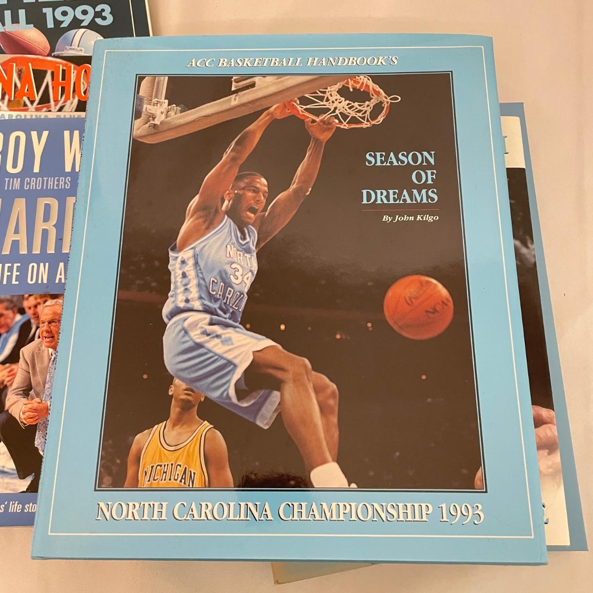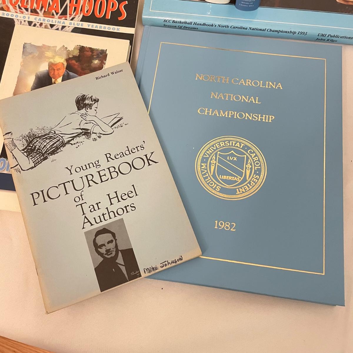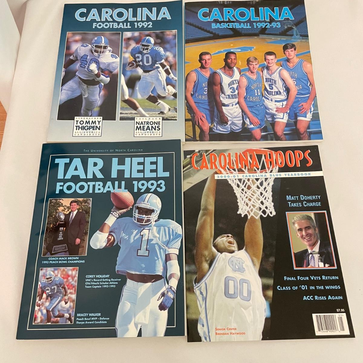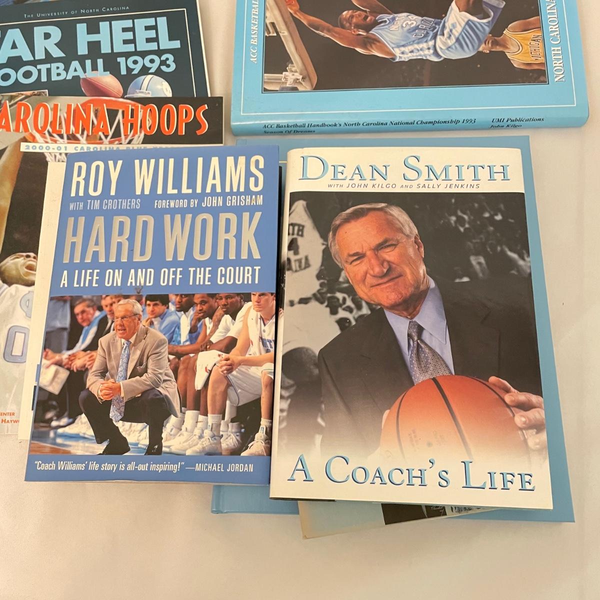 Four hard cover books, two paperbacks and four magazines all things Tar Heel sports. Lot also includes sixteen matching, like-new glasses standing 5.5” tall. See images. Shipping available.
