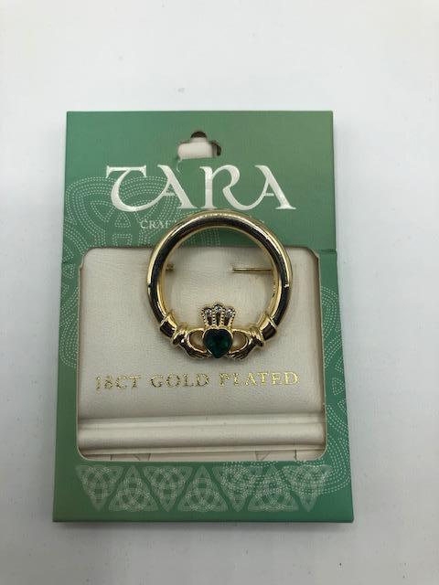Tara by Solvar Claddagh Pin. 18k gold plated. Comes with original packaging. Pin is about 1.25". Emerald like heart stone with 3 rhinestone accents.