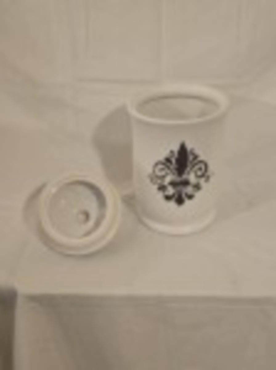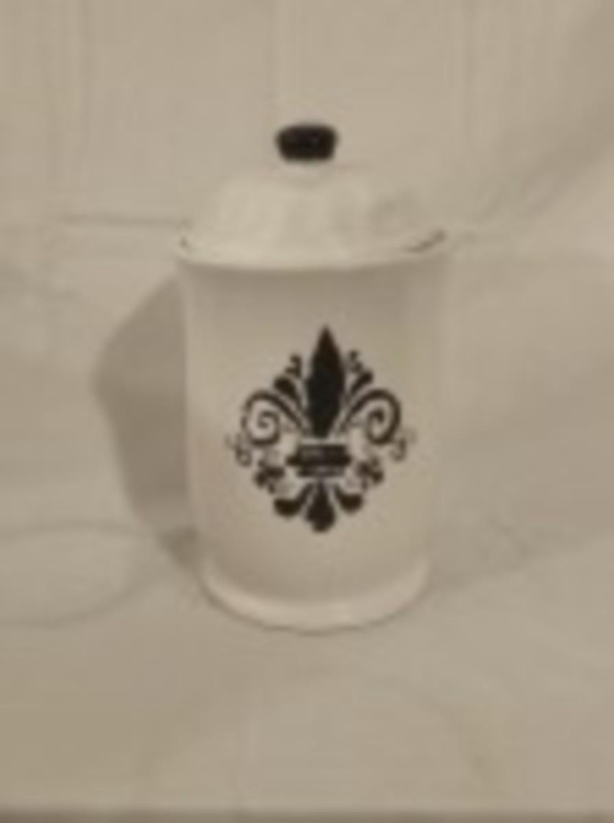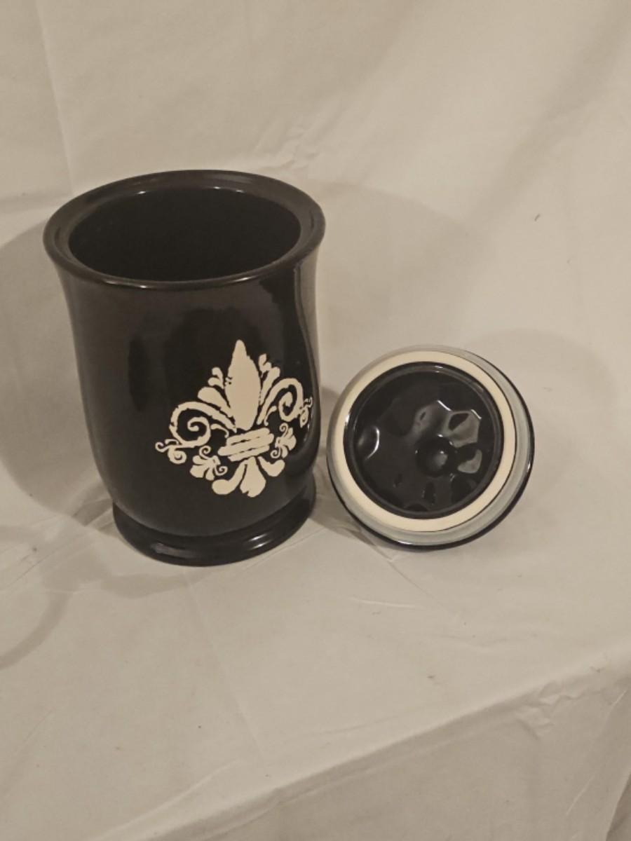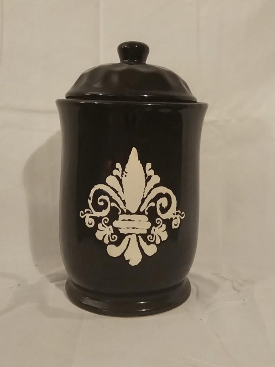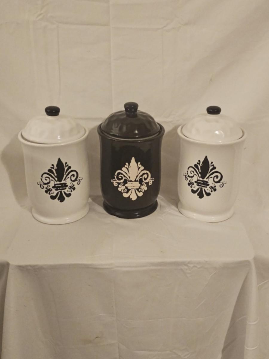 Three piece black and white Fleur Di Lis stoneware cannister set in excellent condition. Tight seals and no chips