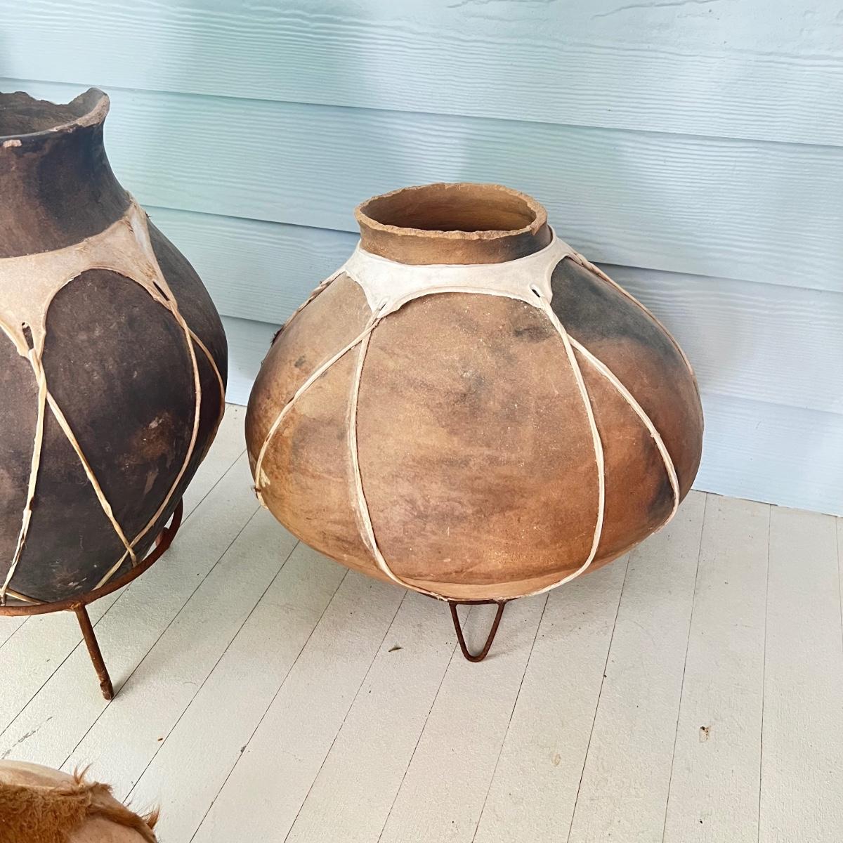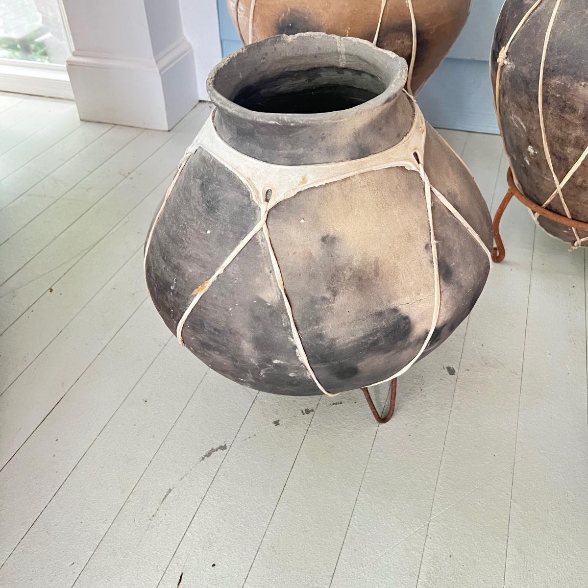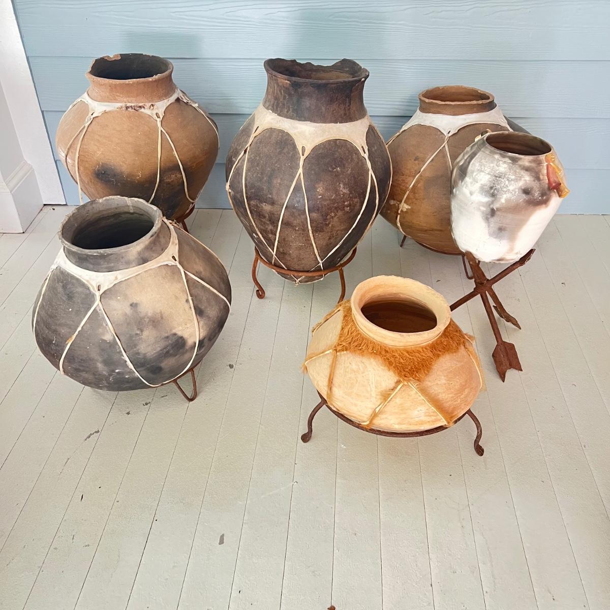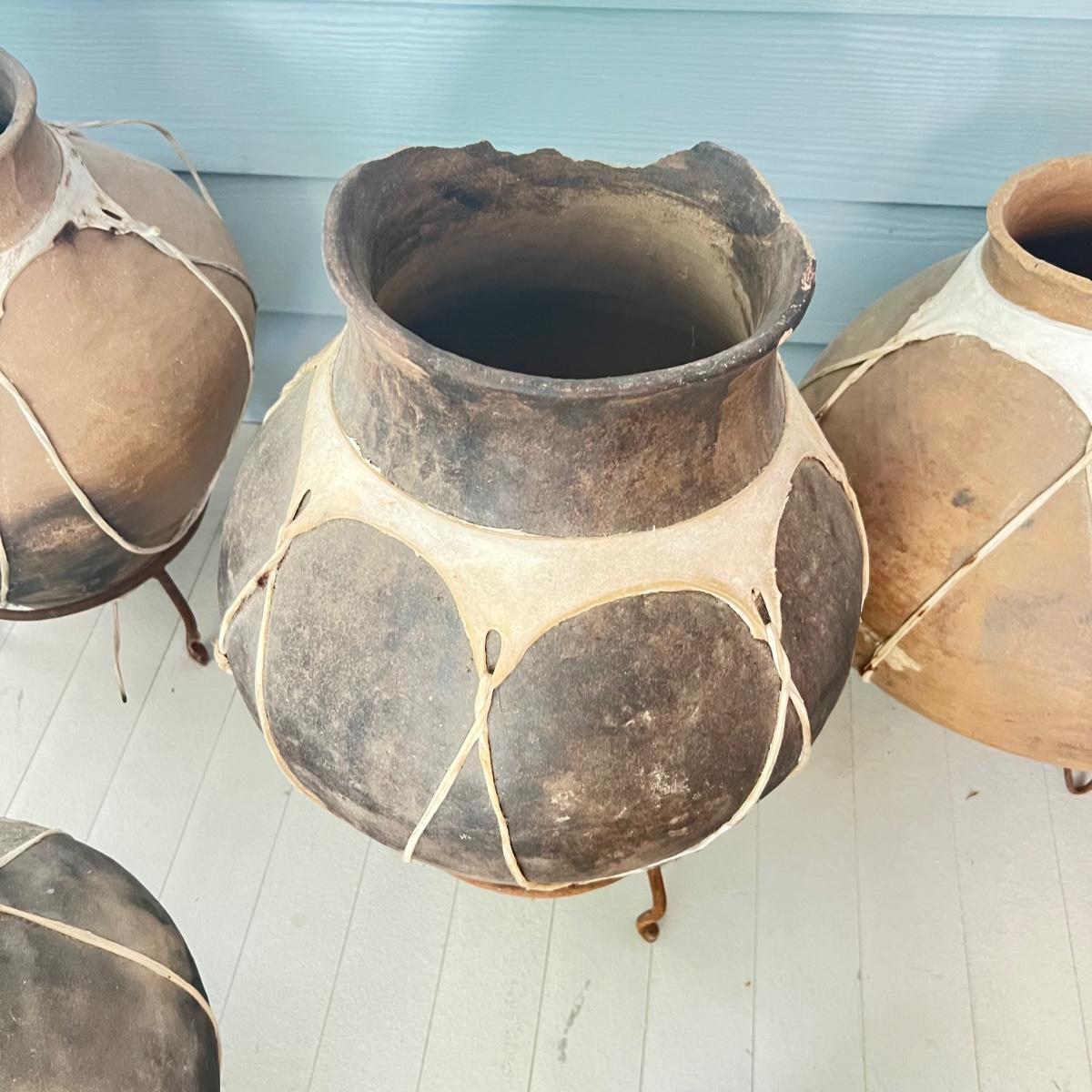 A collection of six vessels that appear to be indigenous pottery. Most of them do have numerous chips on rims etc., see photos. The four largest pots have what appears to be raw hide straps. Note one has mostly broken straps. One pot has a fur like material on its rope straps, and the smallest pot has no straps and has damage shown in photos. All pots have rusty iron stands.