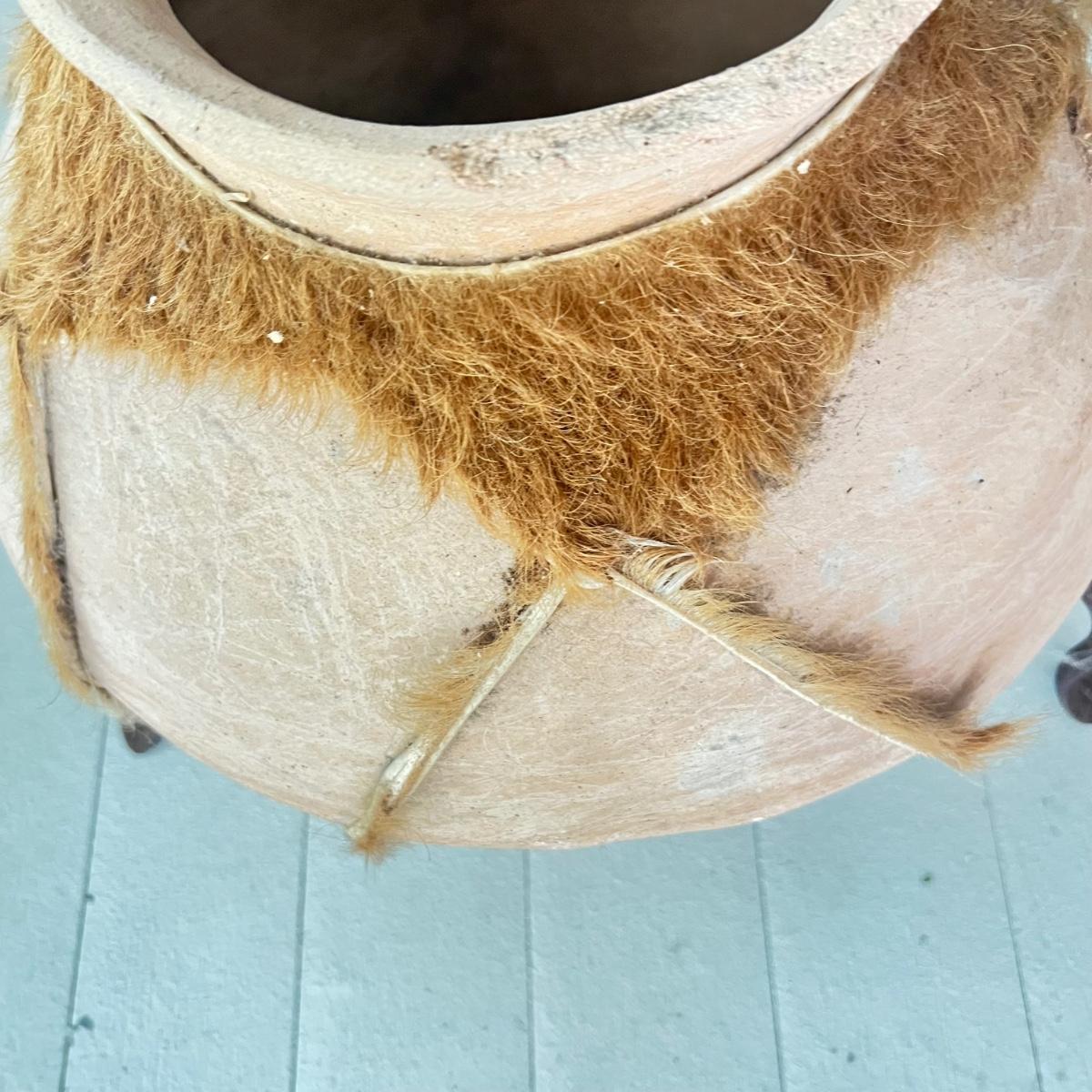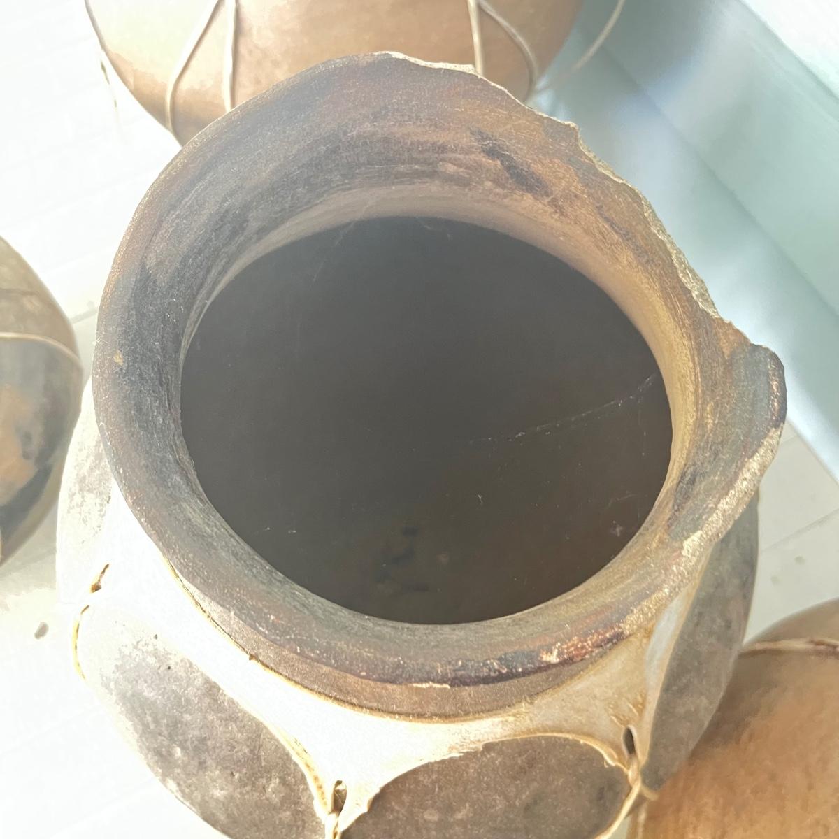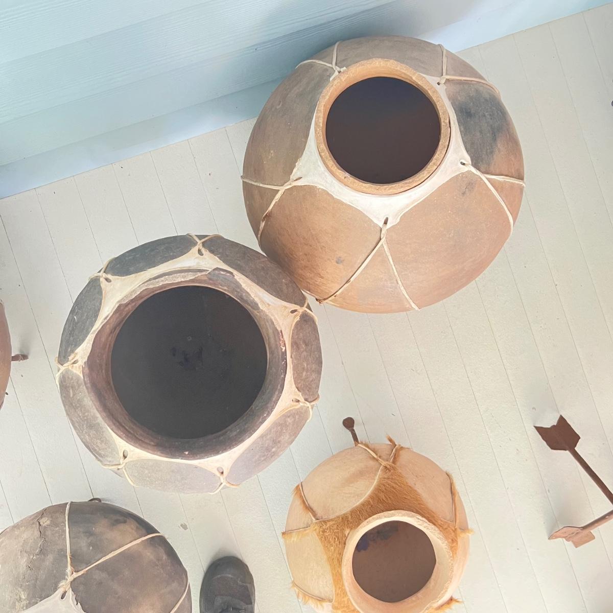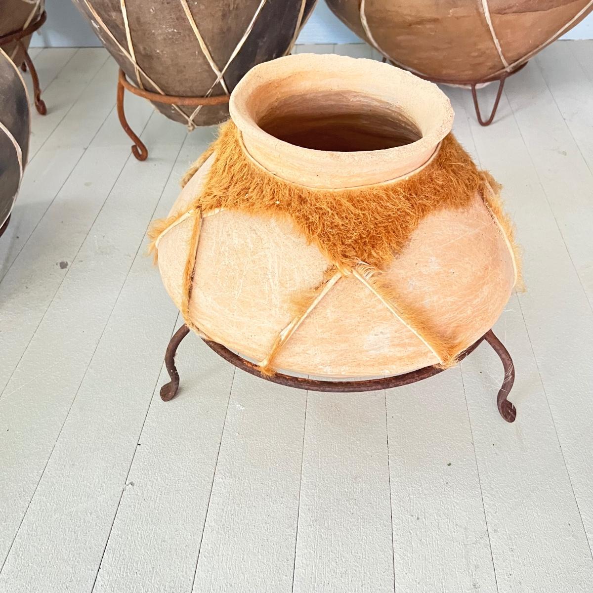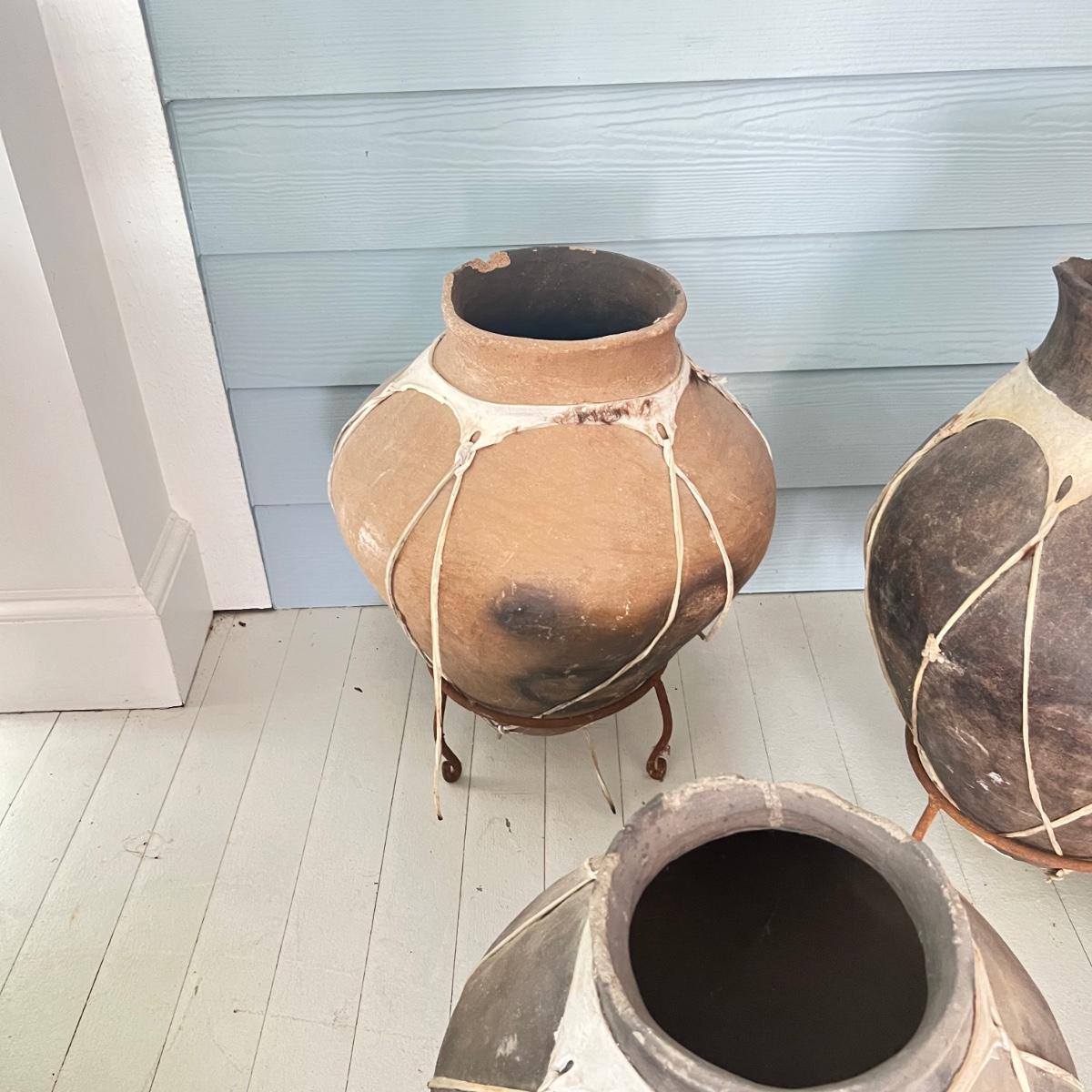 A collection of six vessels that appear to be indigenous pottery. Most of them do have numerous chips on rims etc., see photos. The four largest pots have what appears to be raw hide straps. Note one has mostly broken straps. One pot has a fur like material on its rope straps, and the smallest pot has no straps and has damage shown in photos. All pots have rusty iron stands.