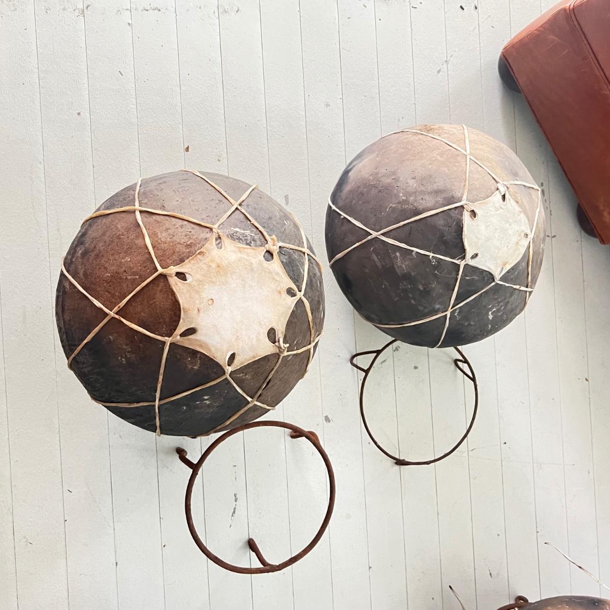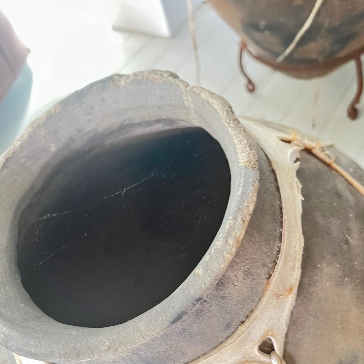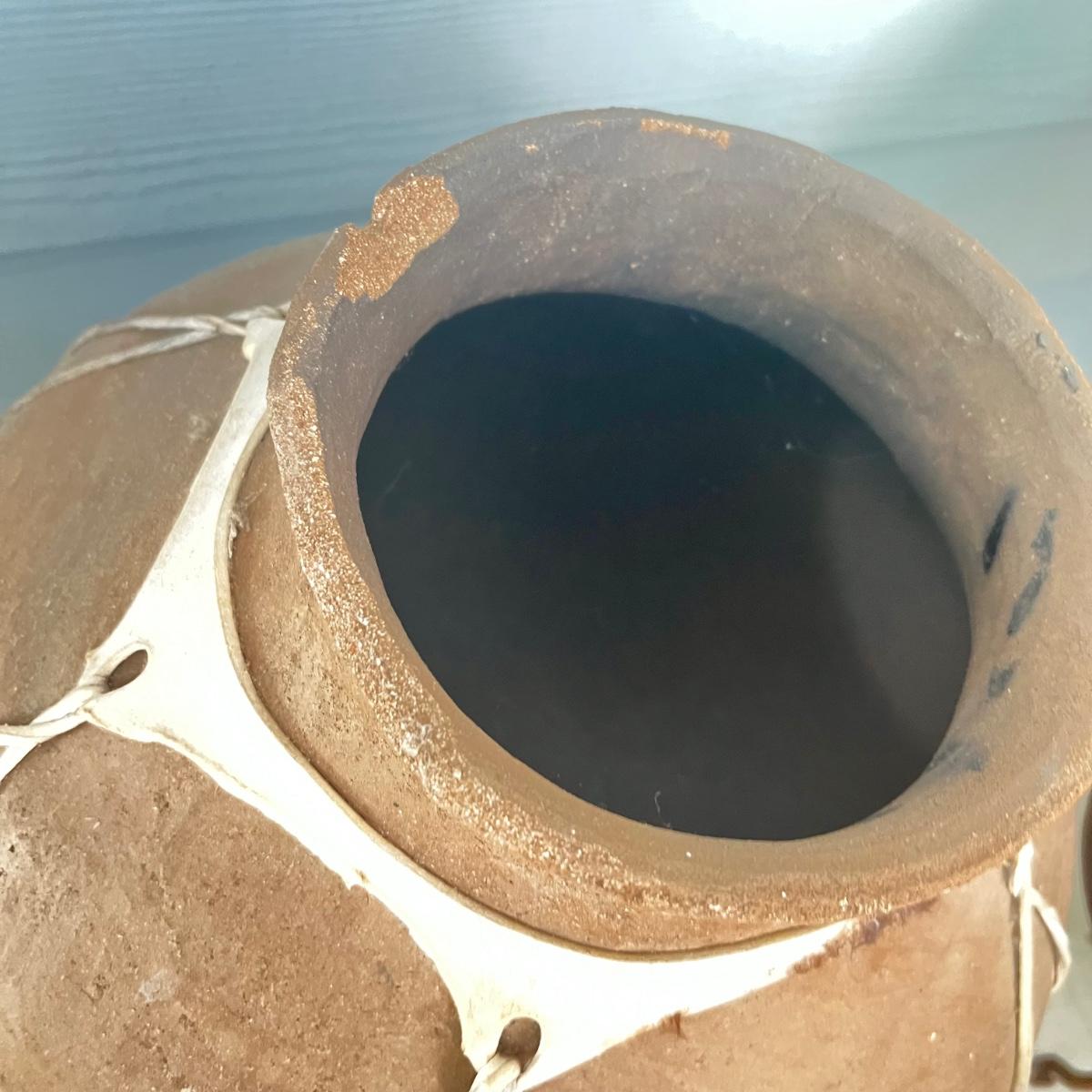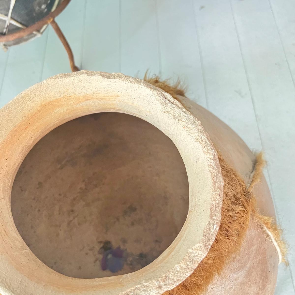A collection of six vessels that appear to be indigenous pottery. Most of them do have numerous chips on rims etc., see photos. The four largest pots have what appears to be raw hide straps. Note one has mostly broken straps. One pot has a fur like material on its rope straps, and the smallest pot has no straps and has damage shown in photos. All pots have rusty iron stands.