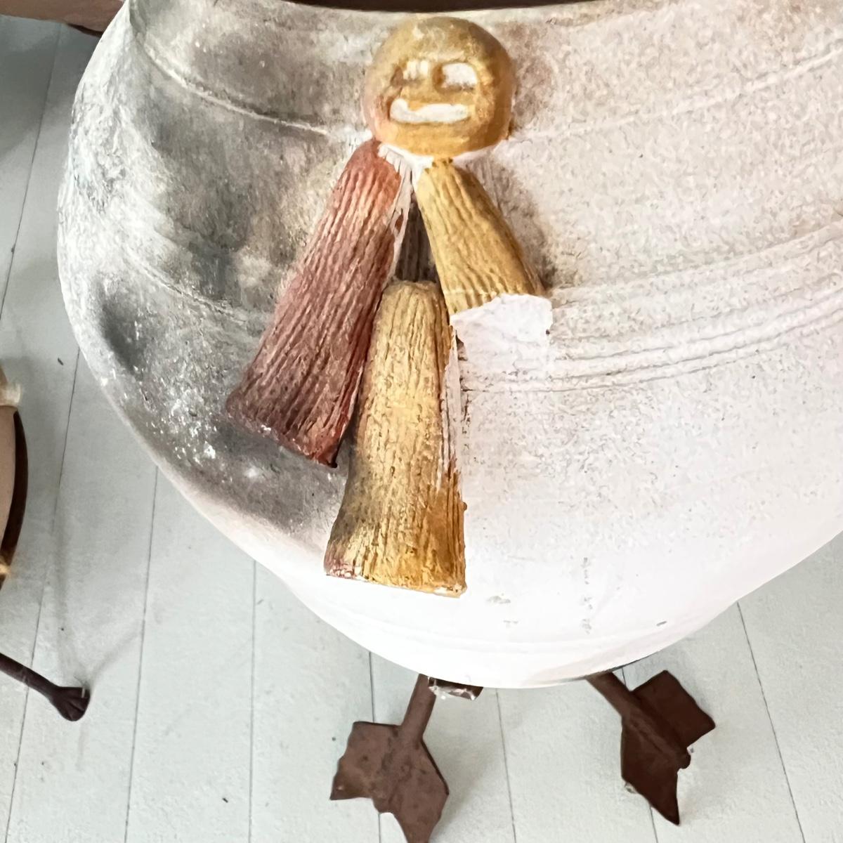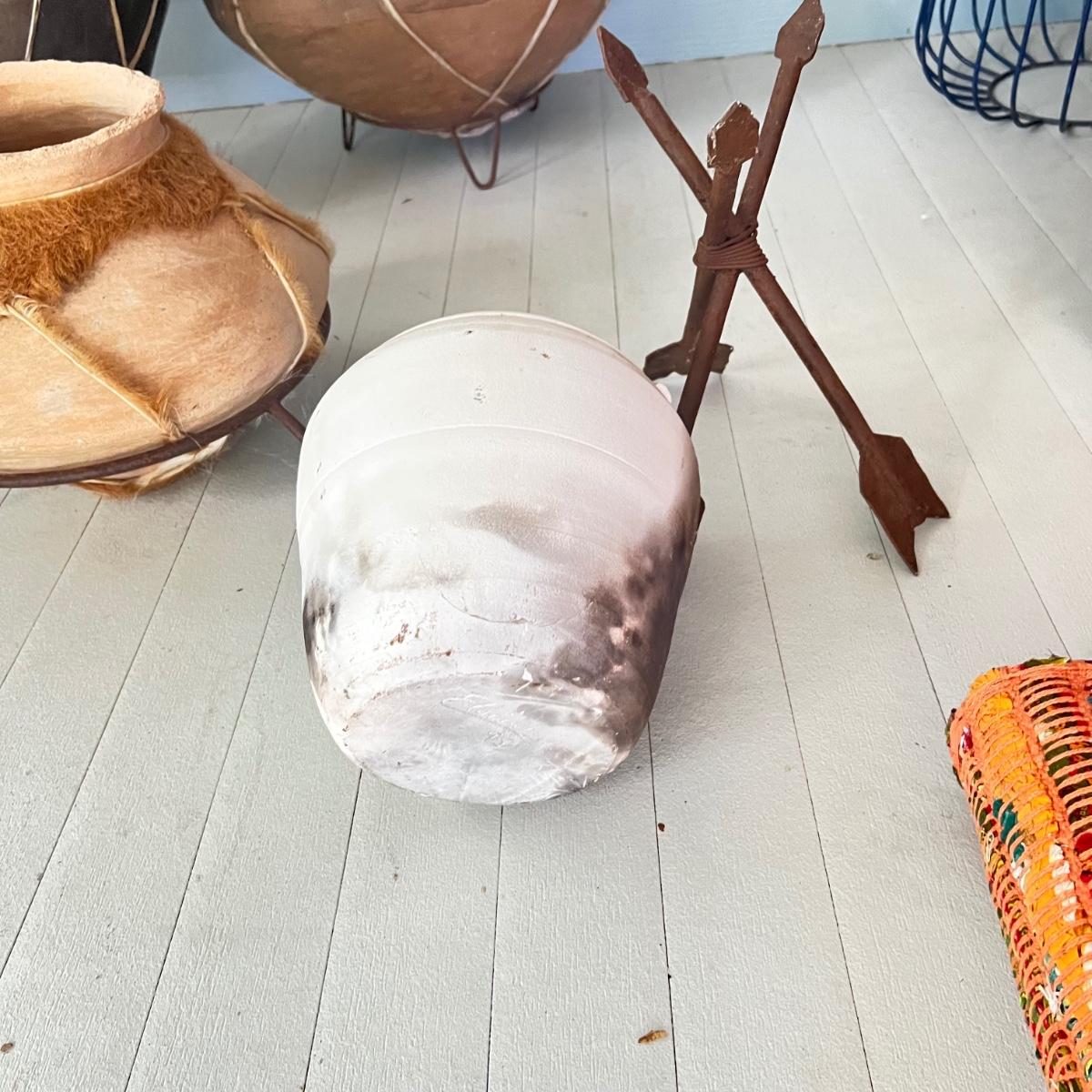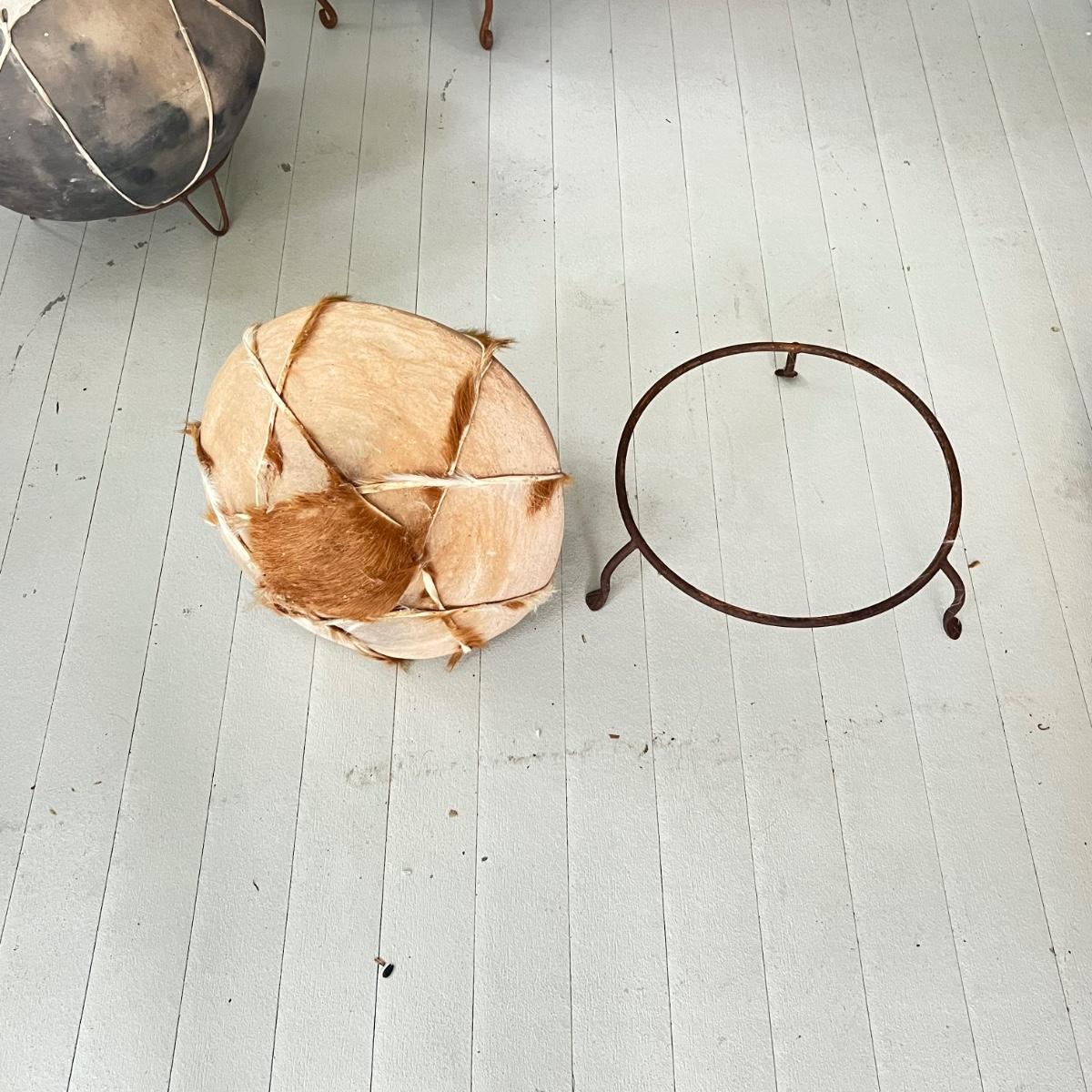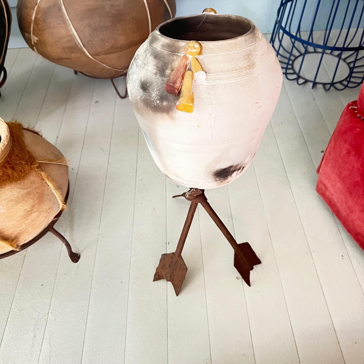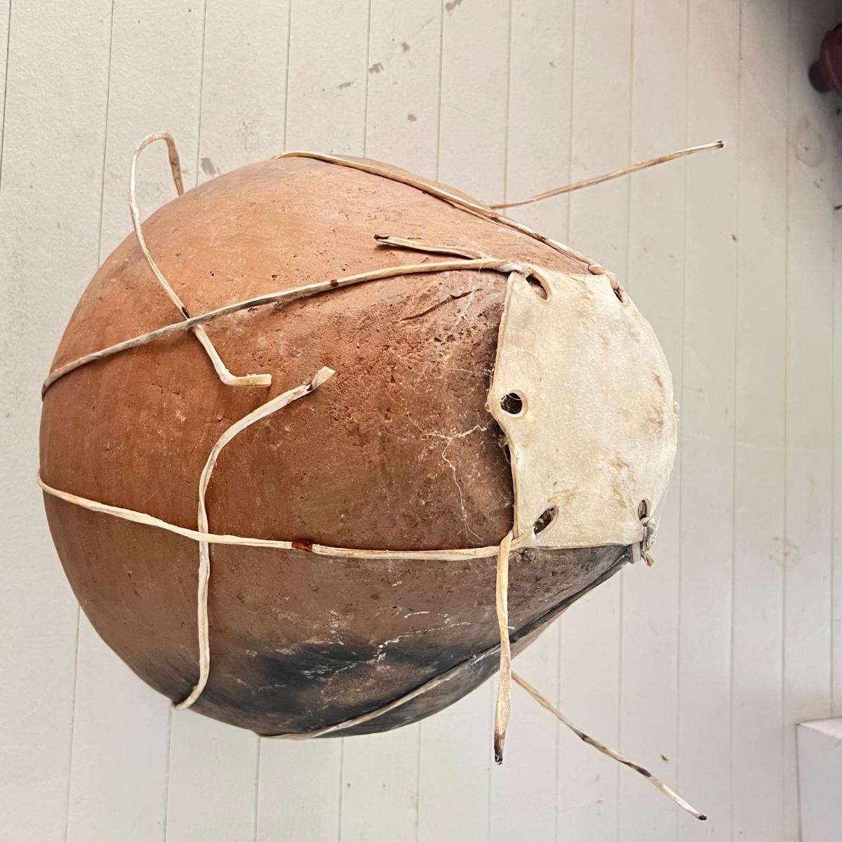 A collection of six vessels that appear to be indigenous pottery. Most of them do have numerous chips on rims etc., see photos. The four largest pots have what appears to be raw hide straps. Note one has mostly broken straps. One pot has a fur like material on its rope straps, and the smallest pot has no straps and has damage shown in photos. All pots have rusty iron stands.