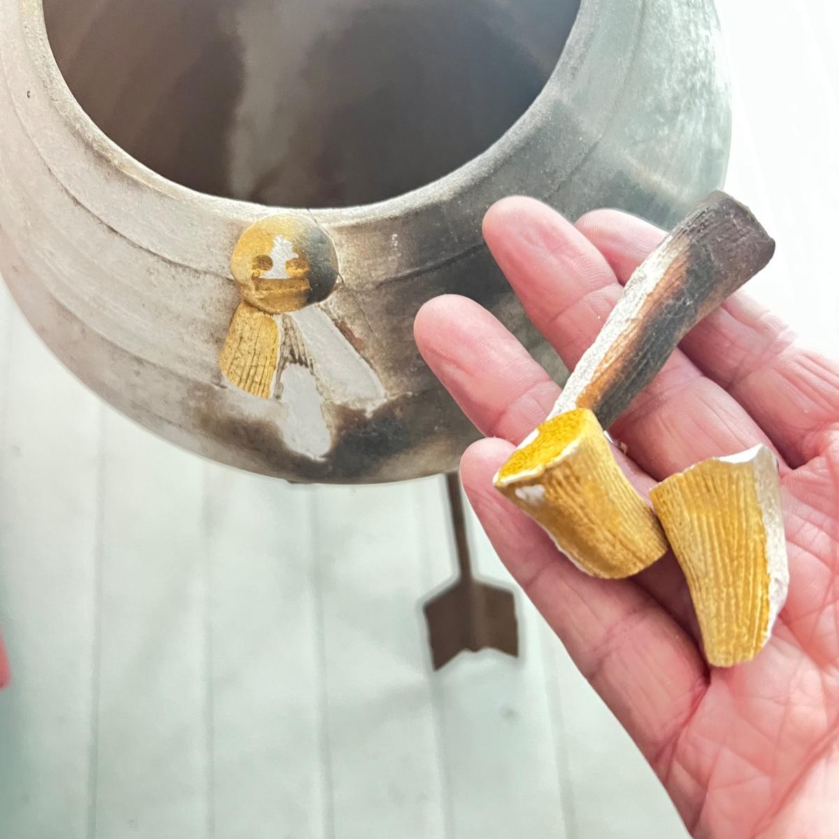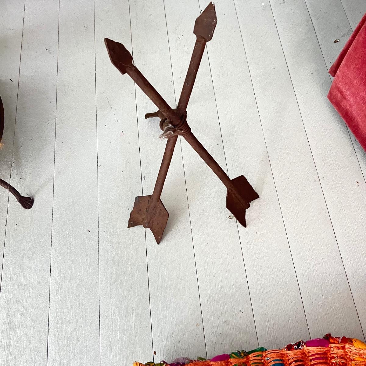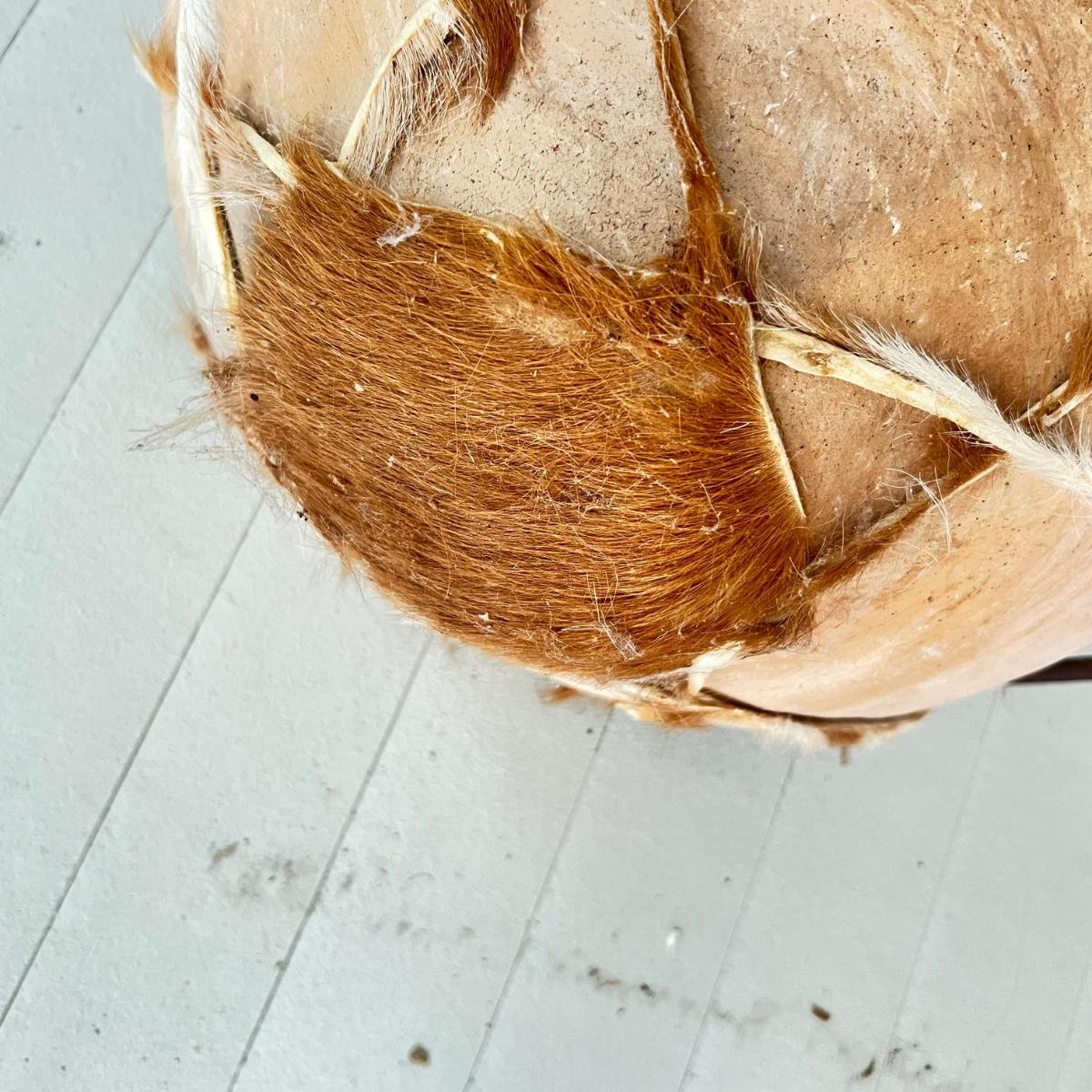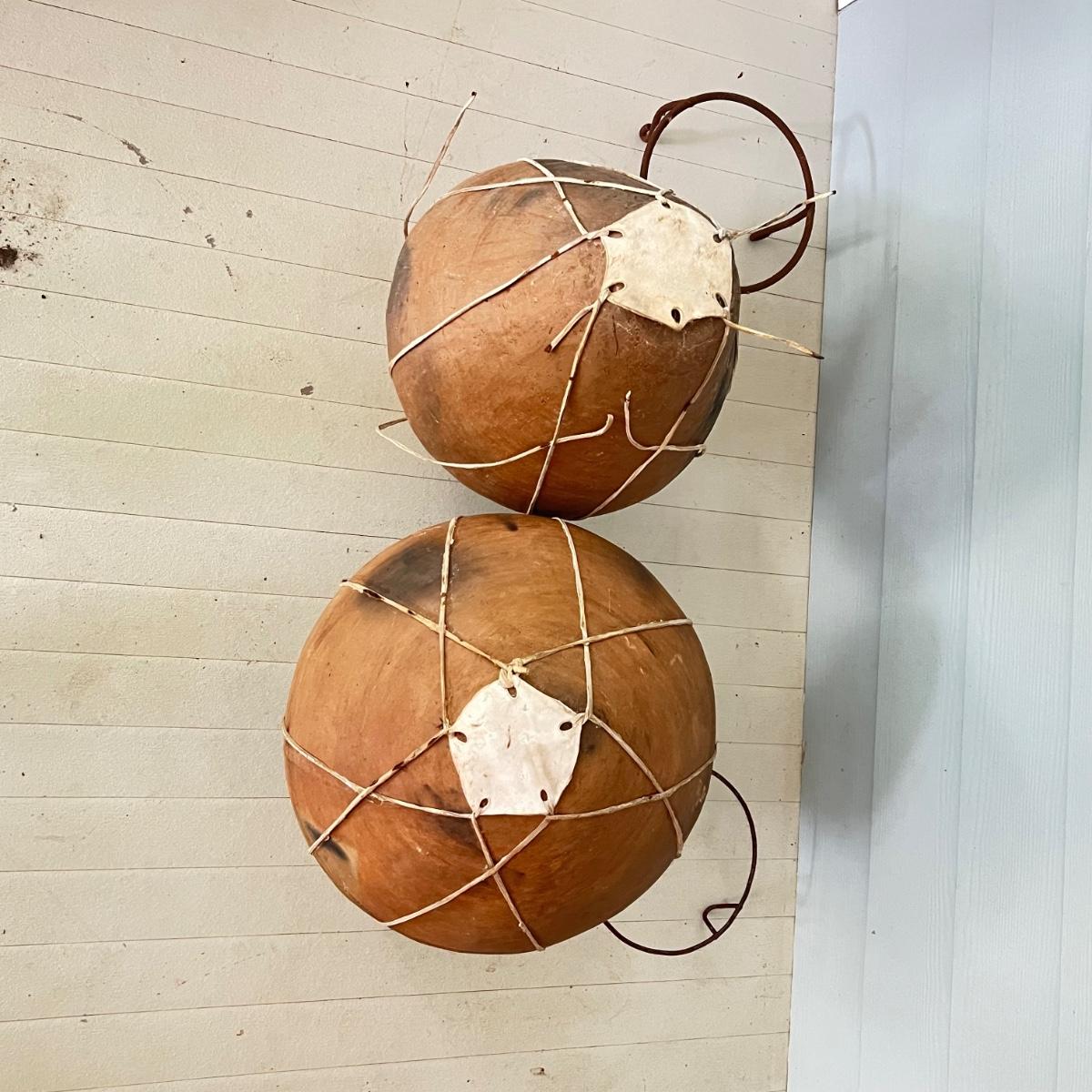 A collection of six vessels that appear to be indigenous pottery. Most of them do have numerous chips on rims etc., see photos. The four largest pots have what appears to be raw hide straps. Note one has mostly broken straps. One pot has a fur like material on its rope straps, and the smallest pot has no straps and has damage shown in photos. All pots have rusty iron stands.