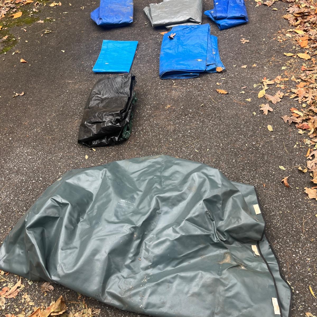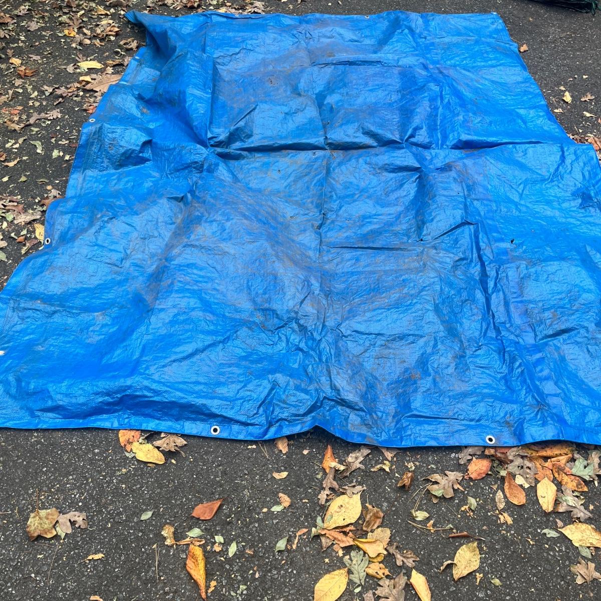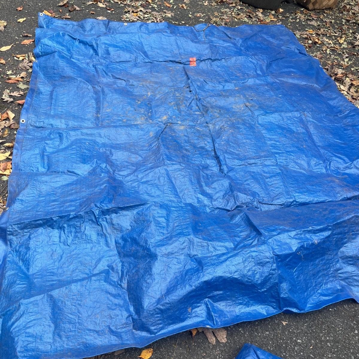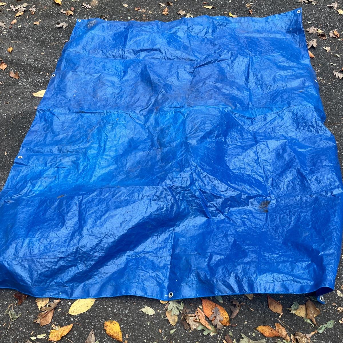 Lot includes six tarps and a furniture cover. Largest three tarps measure 84” x 108”. Two blue tarps have holes, see pictures.
