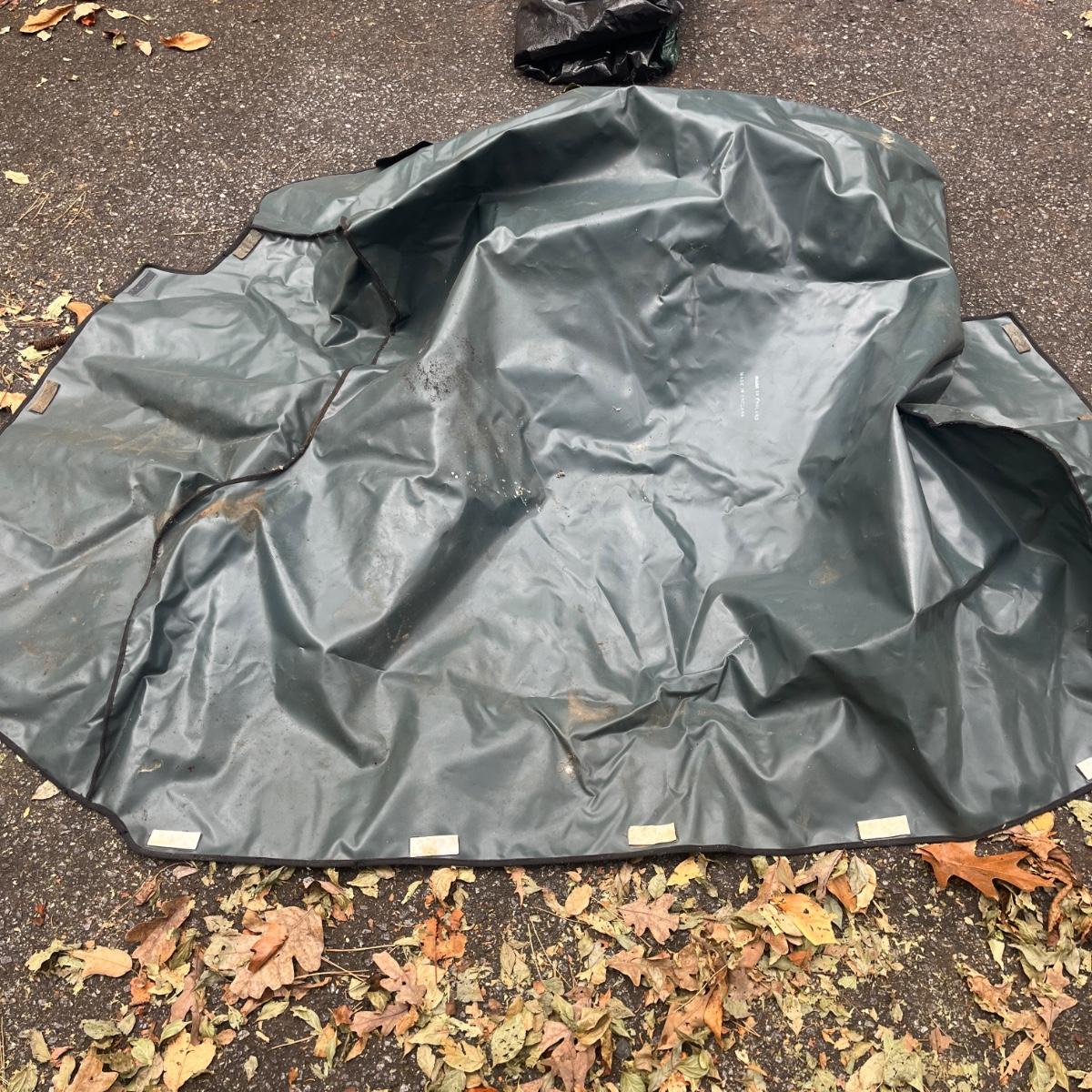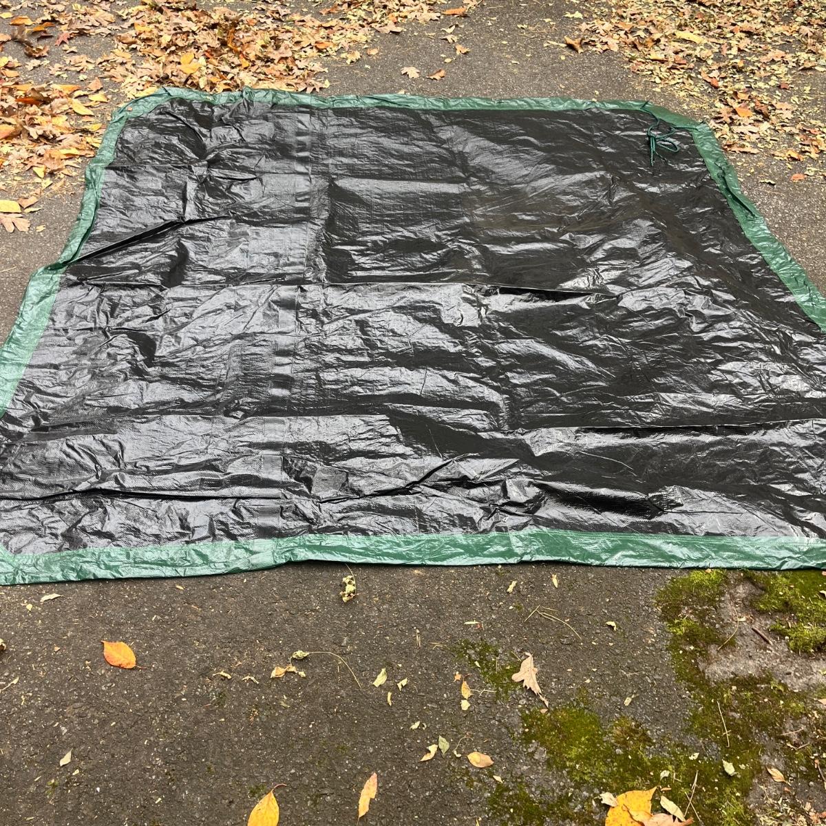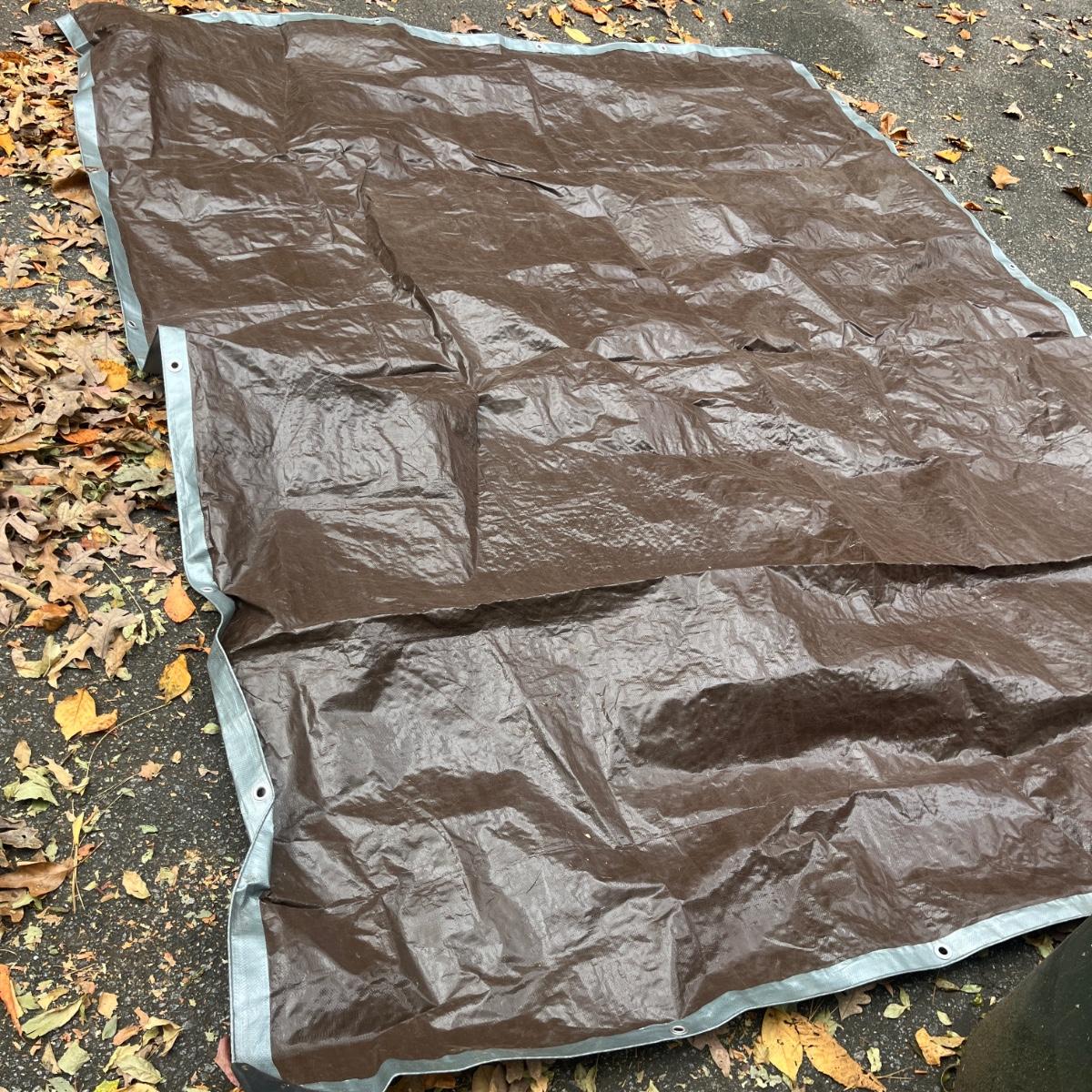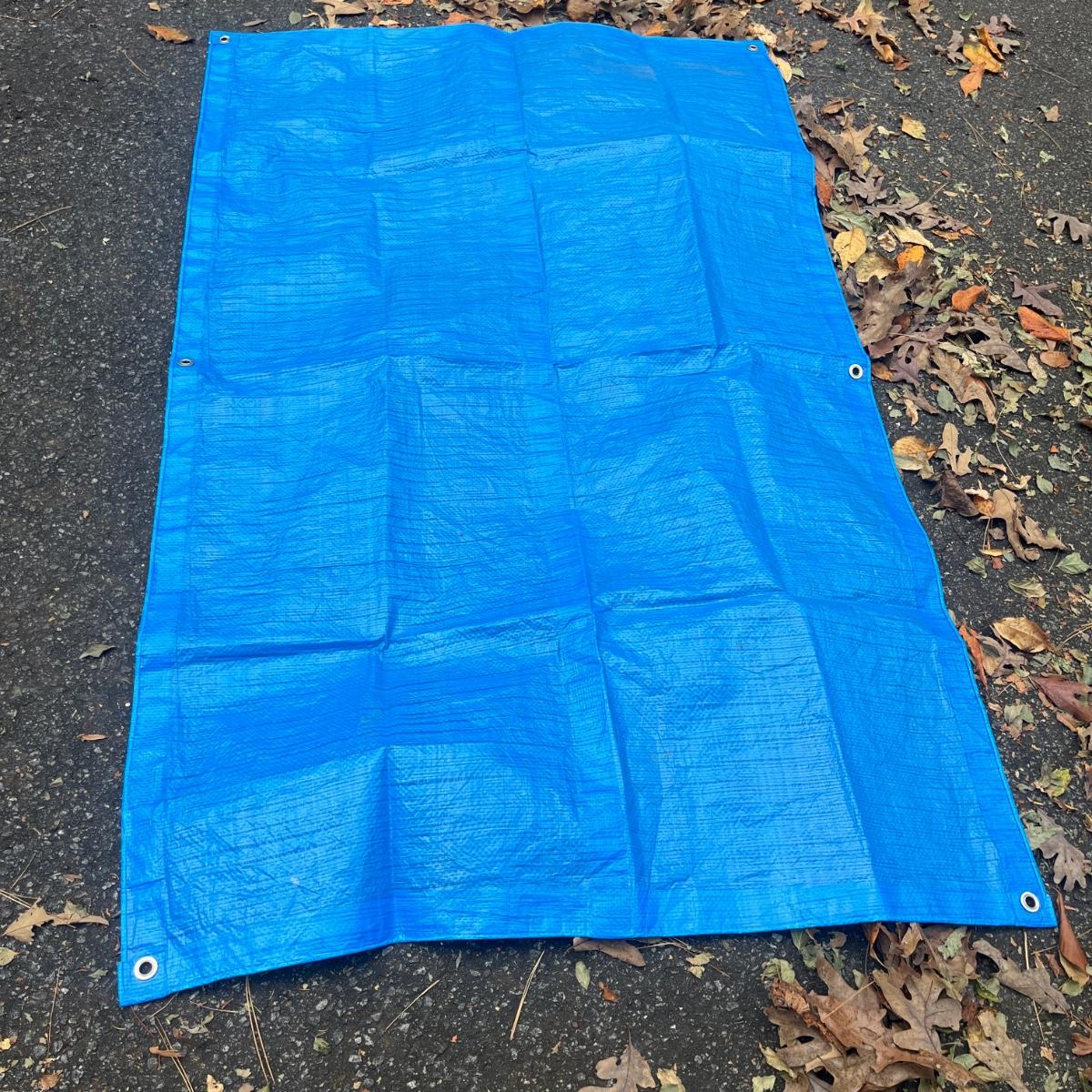Lot includes six tarps and a furniture cover. Largest three tarps measure 84” x 108”. Two blue tarps have holes, see pictures.