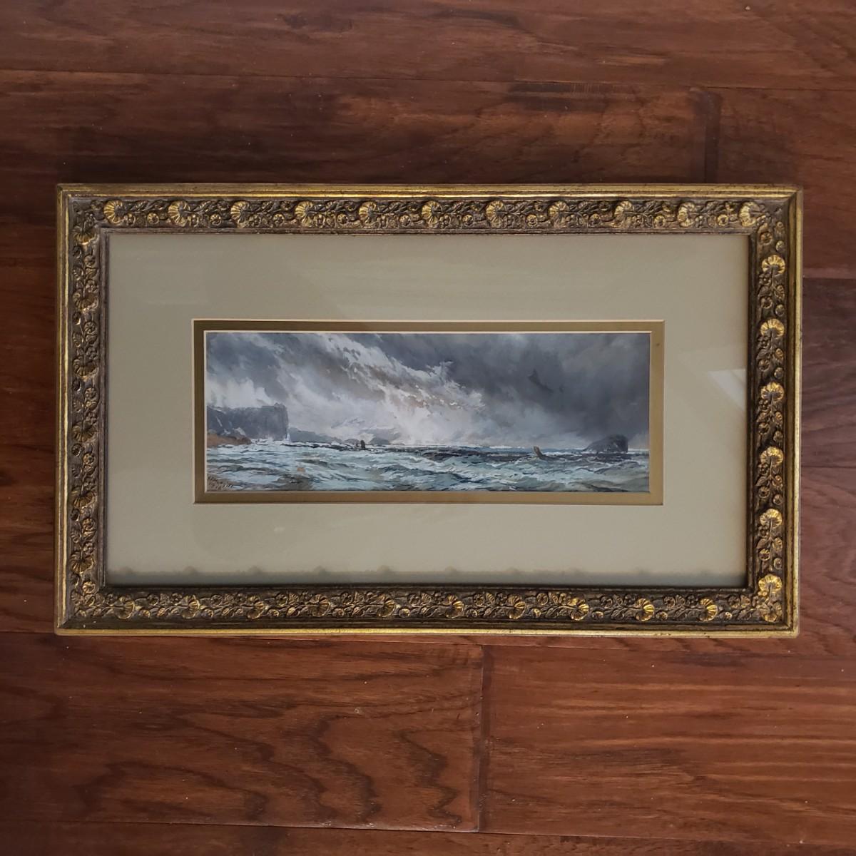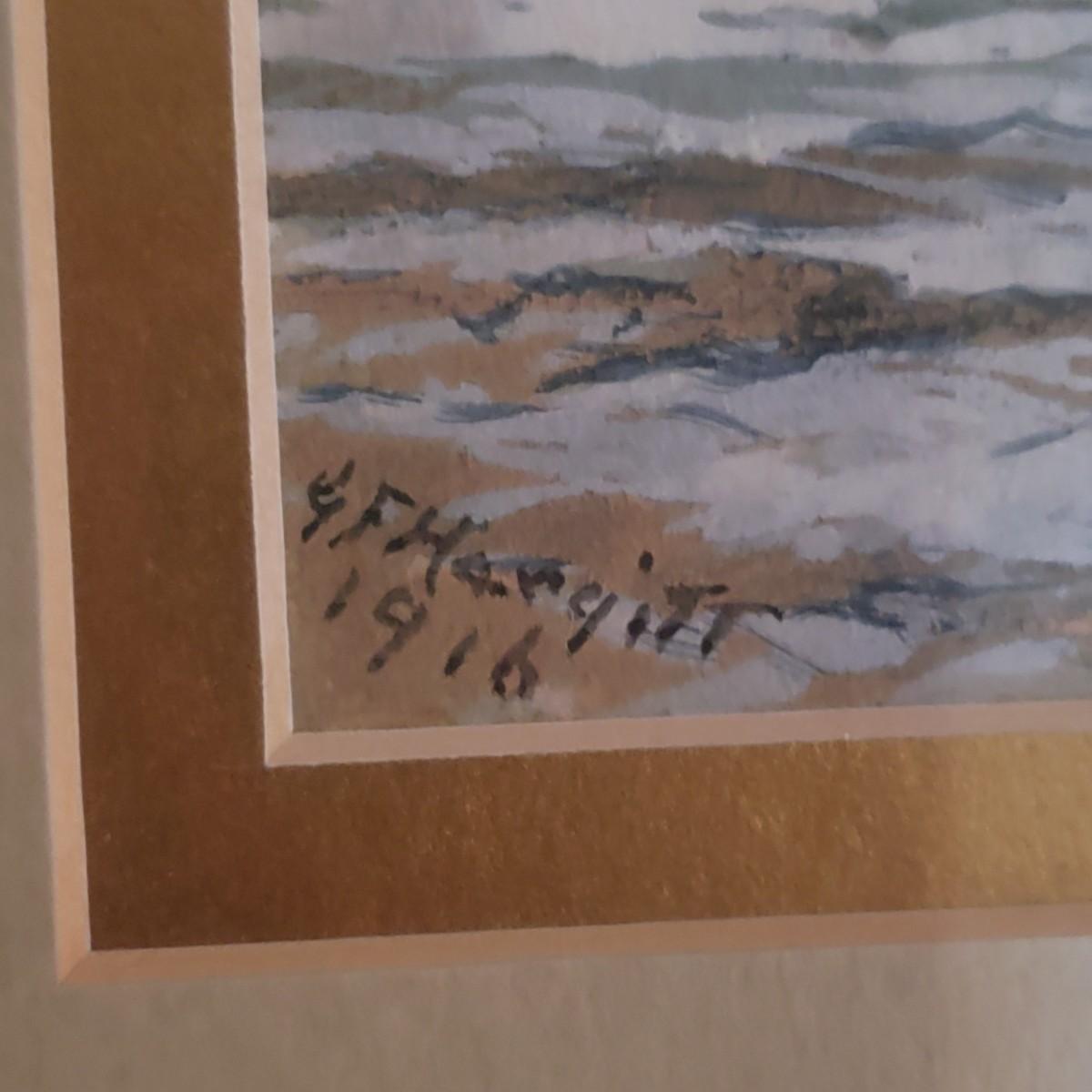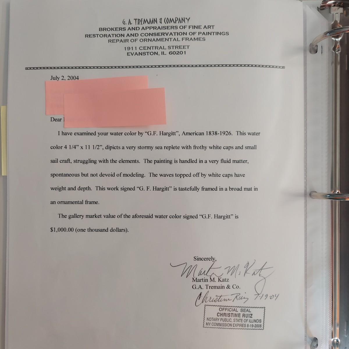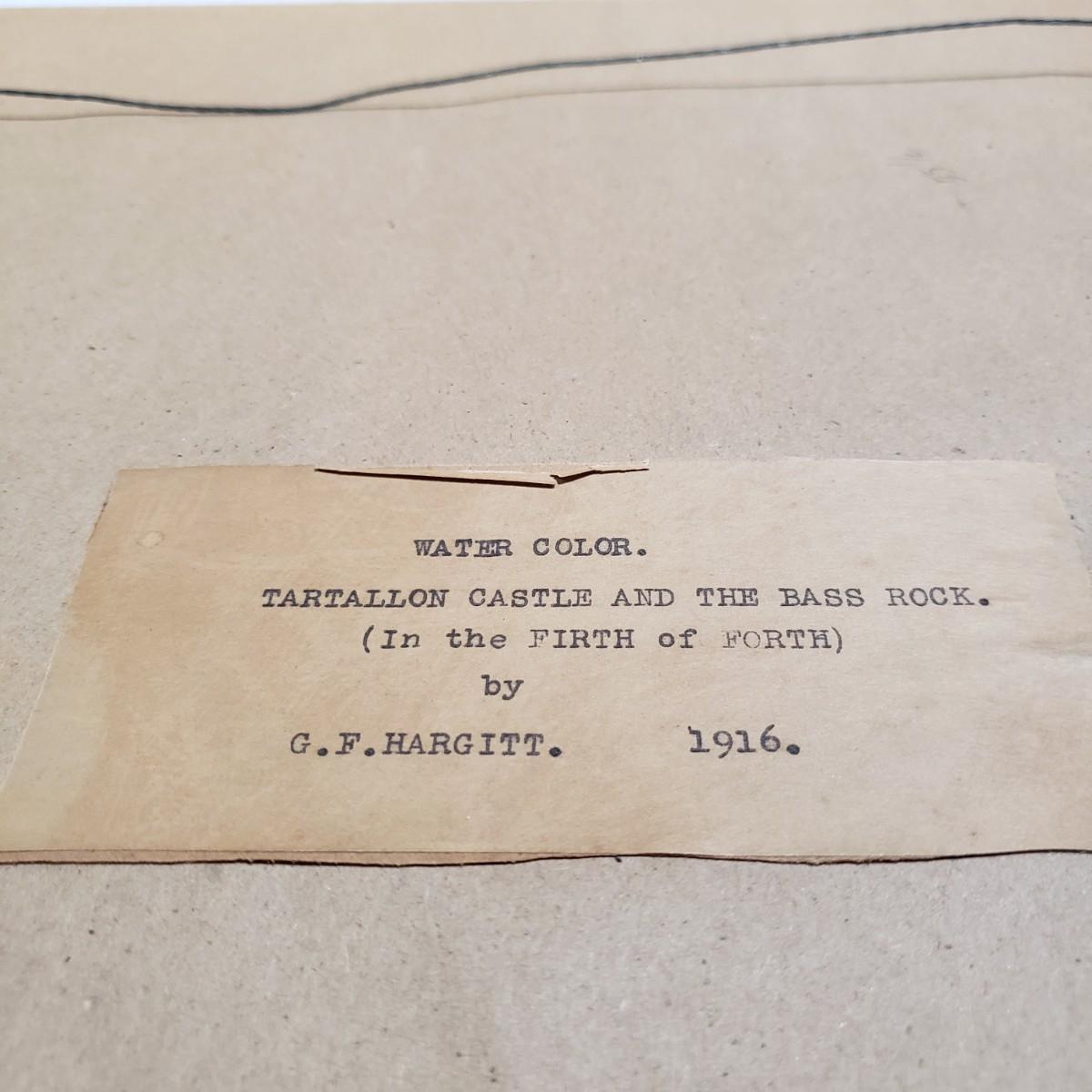 This watercolor signed by the artist is titled "Tarragona Castle & the Bass Rock". It appears that the artist G.F. Hargett painted it in 1916. The painting in under glass in an ornamental gold colored frame that measures 19" x 11.5"H. Per the appraisal, it is American circa 1838-1936. Paperwork included.