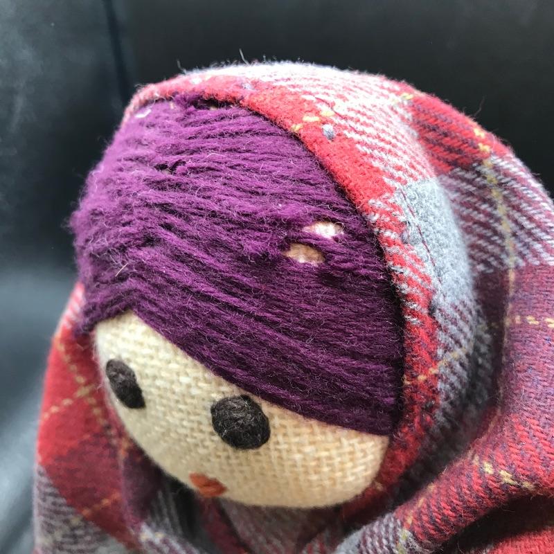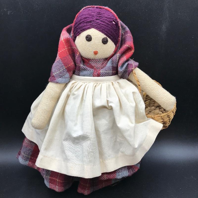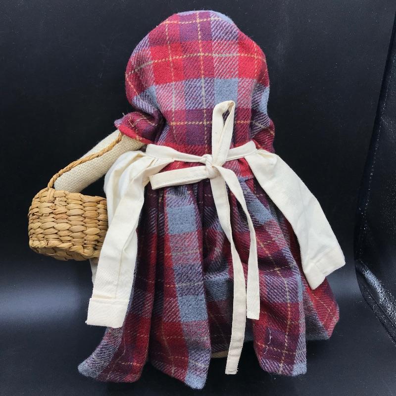 Stands approximately 12 3/4“ tall. Doll is unmarked with no tags. There’s a small nick in the yarn on her bonnet. See pictures.