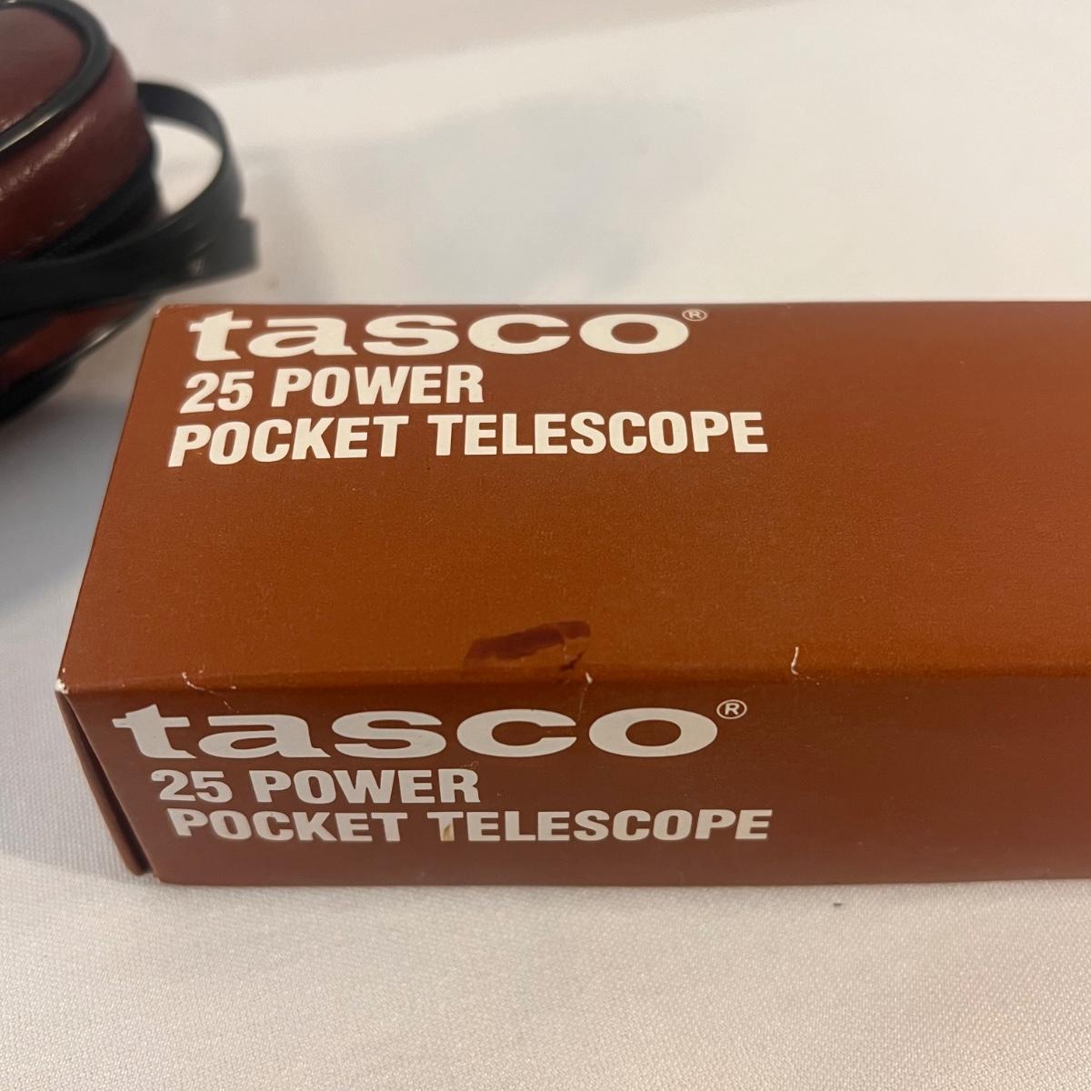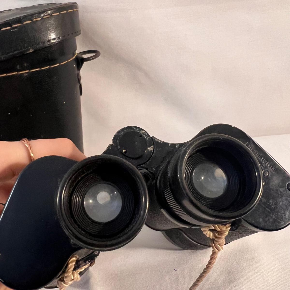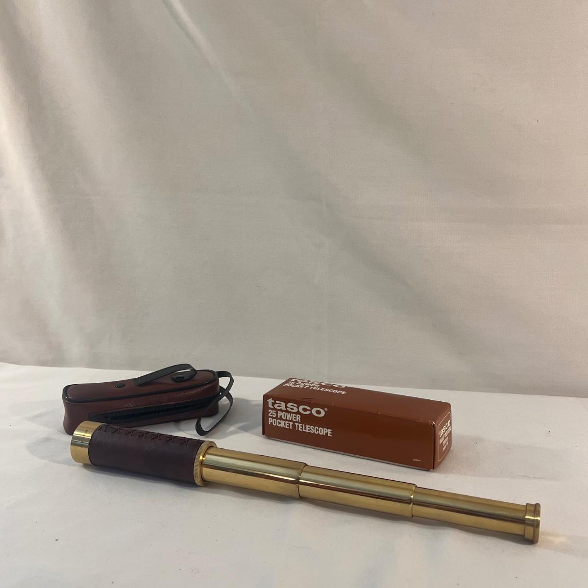This lot includes one Tasco pair of binoculars, one Tasco 25 power pocket telescope, one Bushnell pocket scope, and one pair of Dienstglas binoculars. The Dienstglas binoculars are the largest pair measuring 7” x 7” x 2”H. Those binoculars appear to be from 1944. The smallest is the Bushnell Pocket Scope that measures 2” x 1” x 3.5”H. Every item comes in their own case. All in good condition. Shipping available.