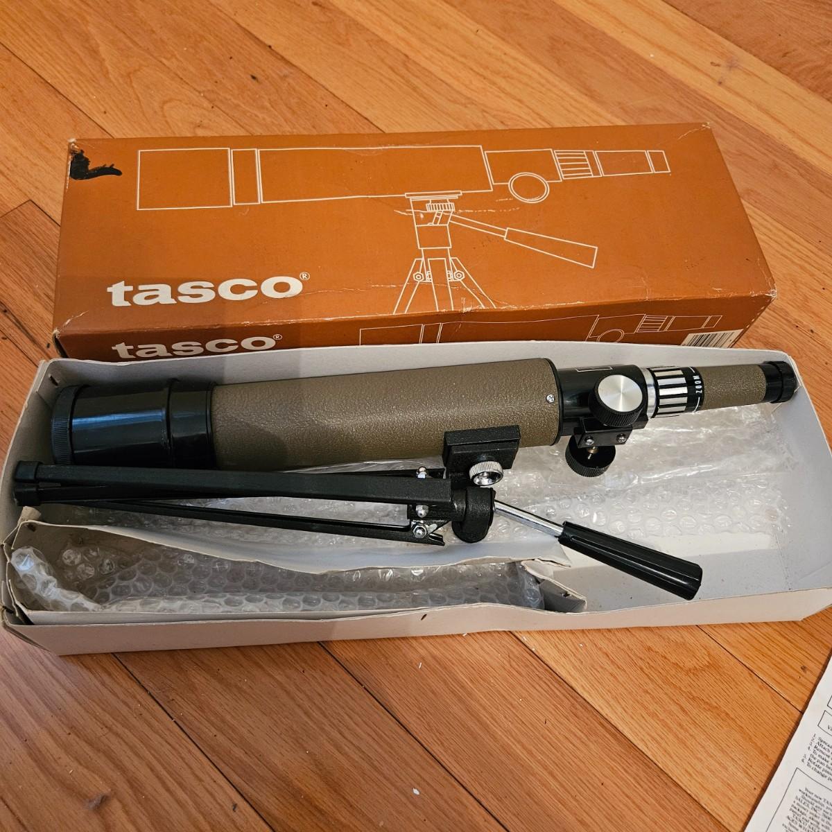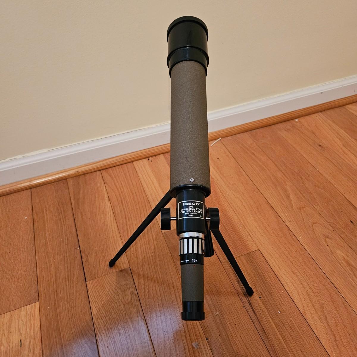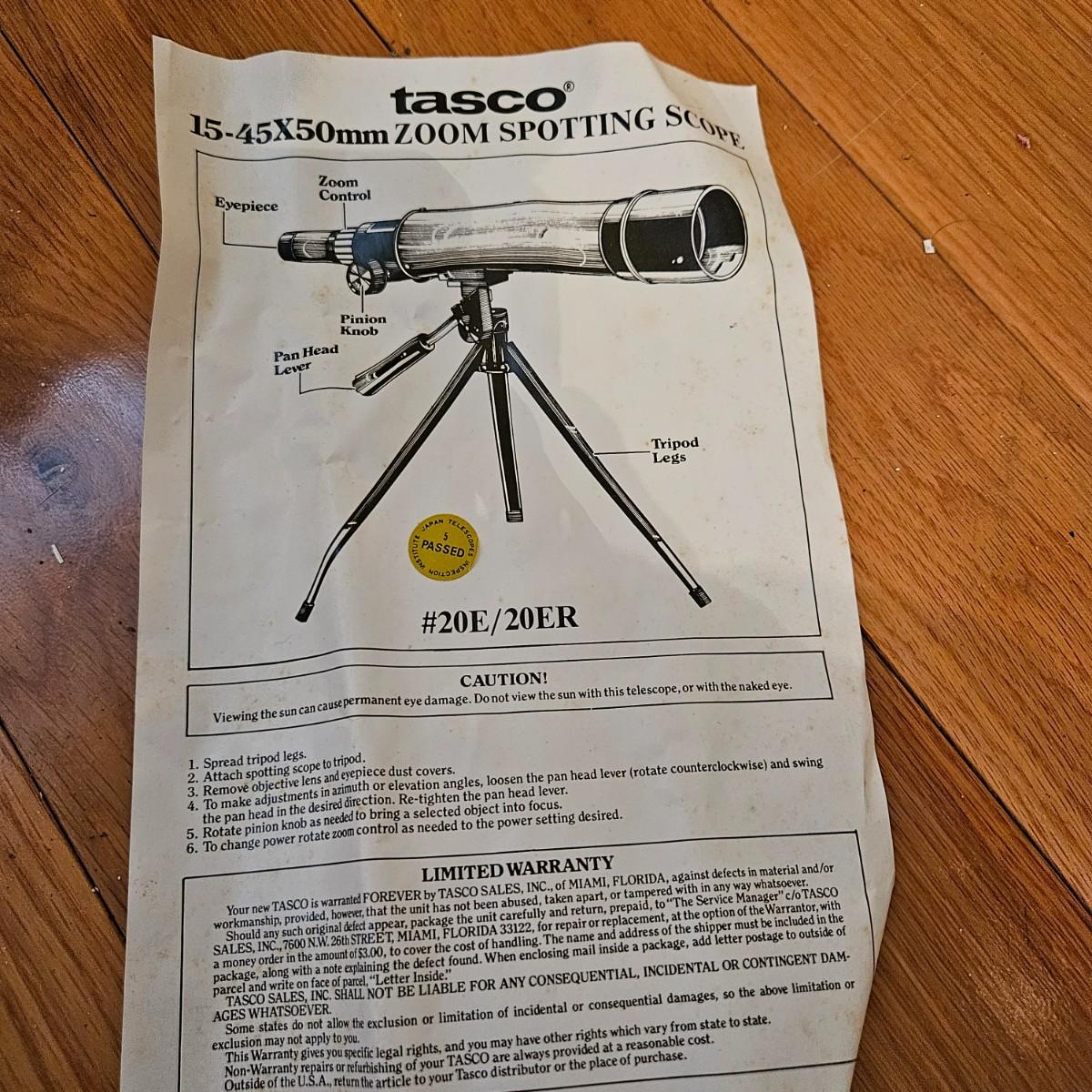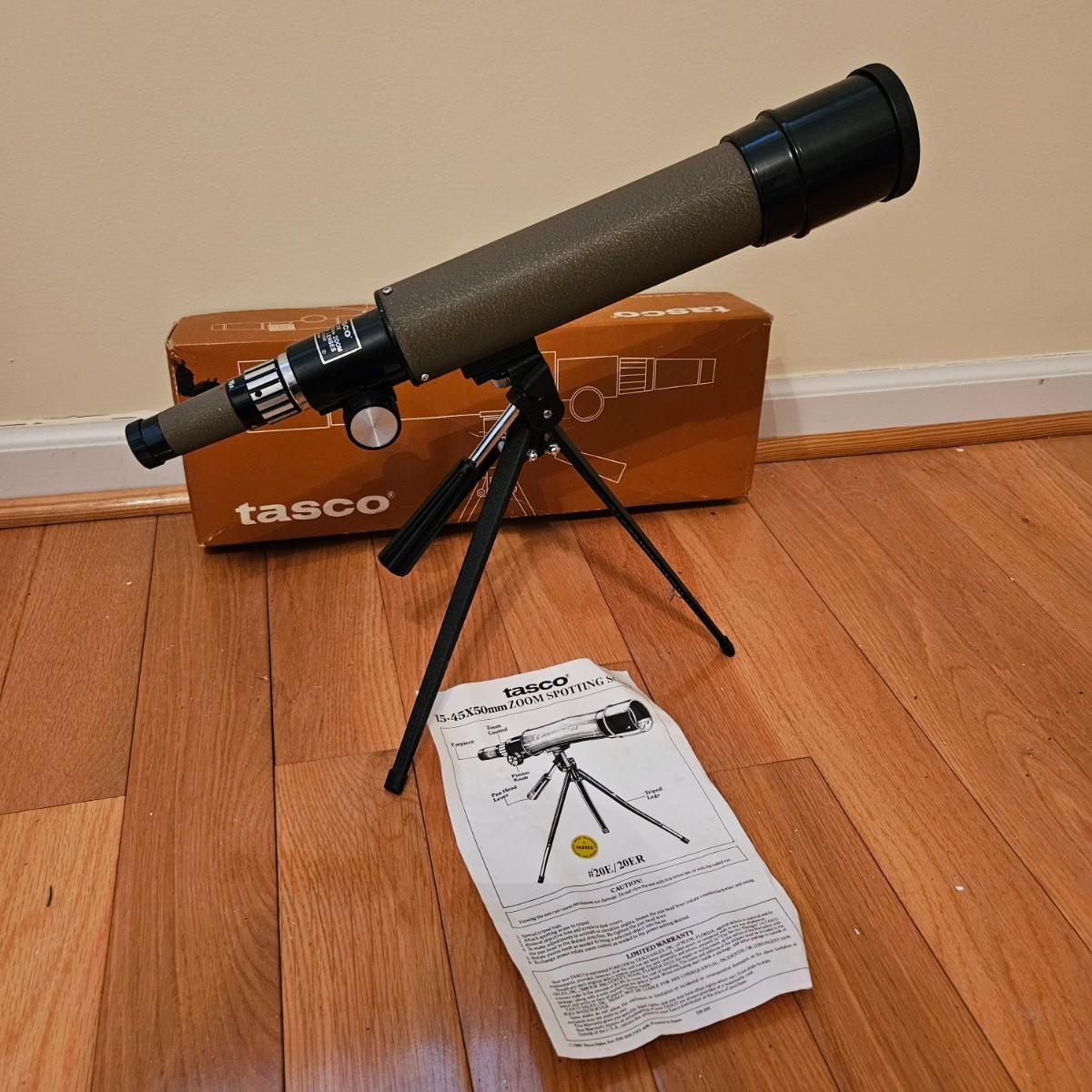 A Tasco 15-45x50mm zoom spotting scope that includes an attached tripod and its original packaging. It measures approximately 17" x 11" x 12"H with the tripod. Box measures 18” x 6” x 3”. Shipping available