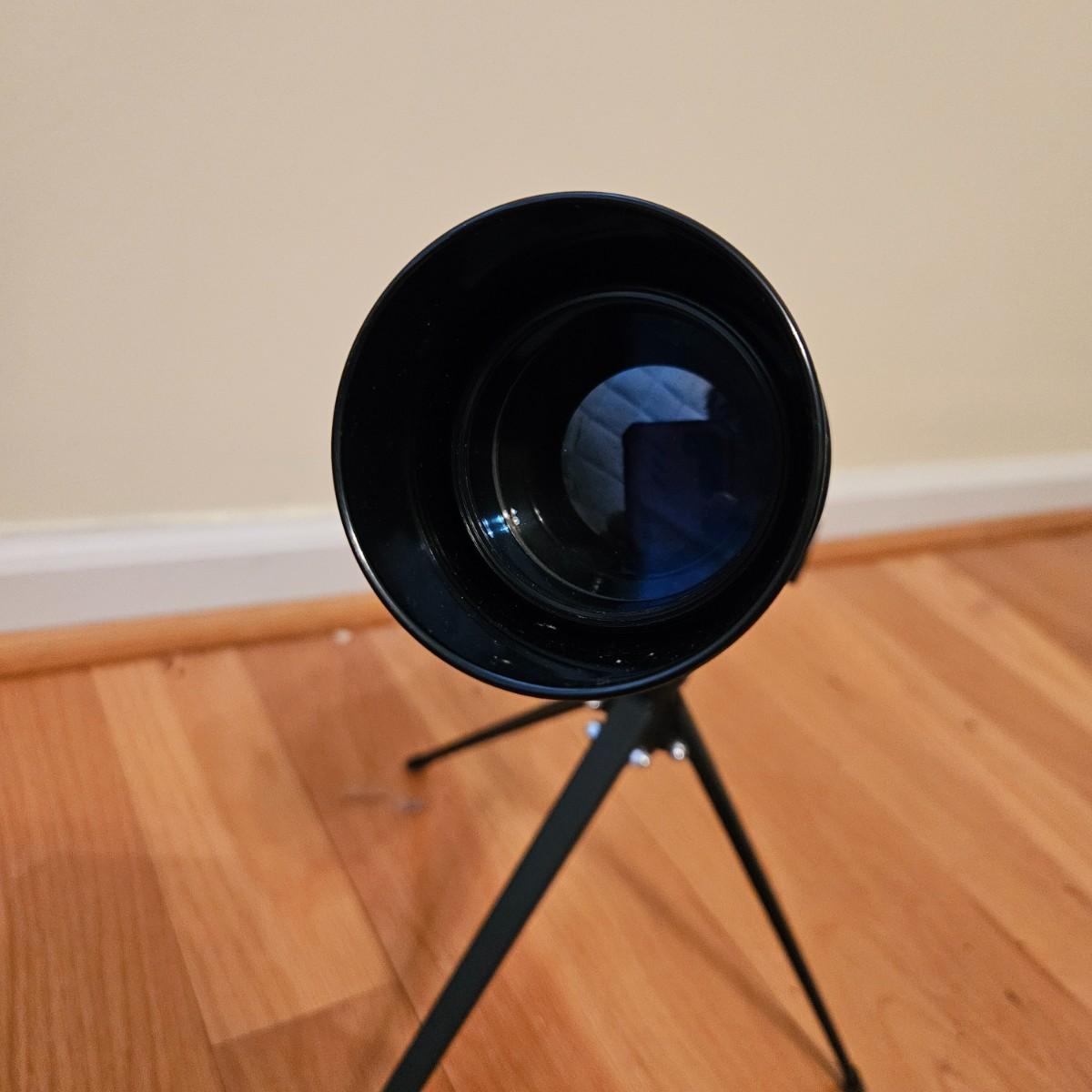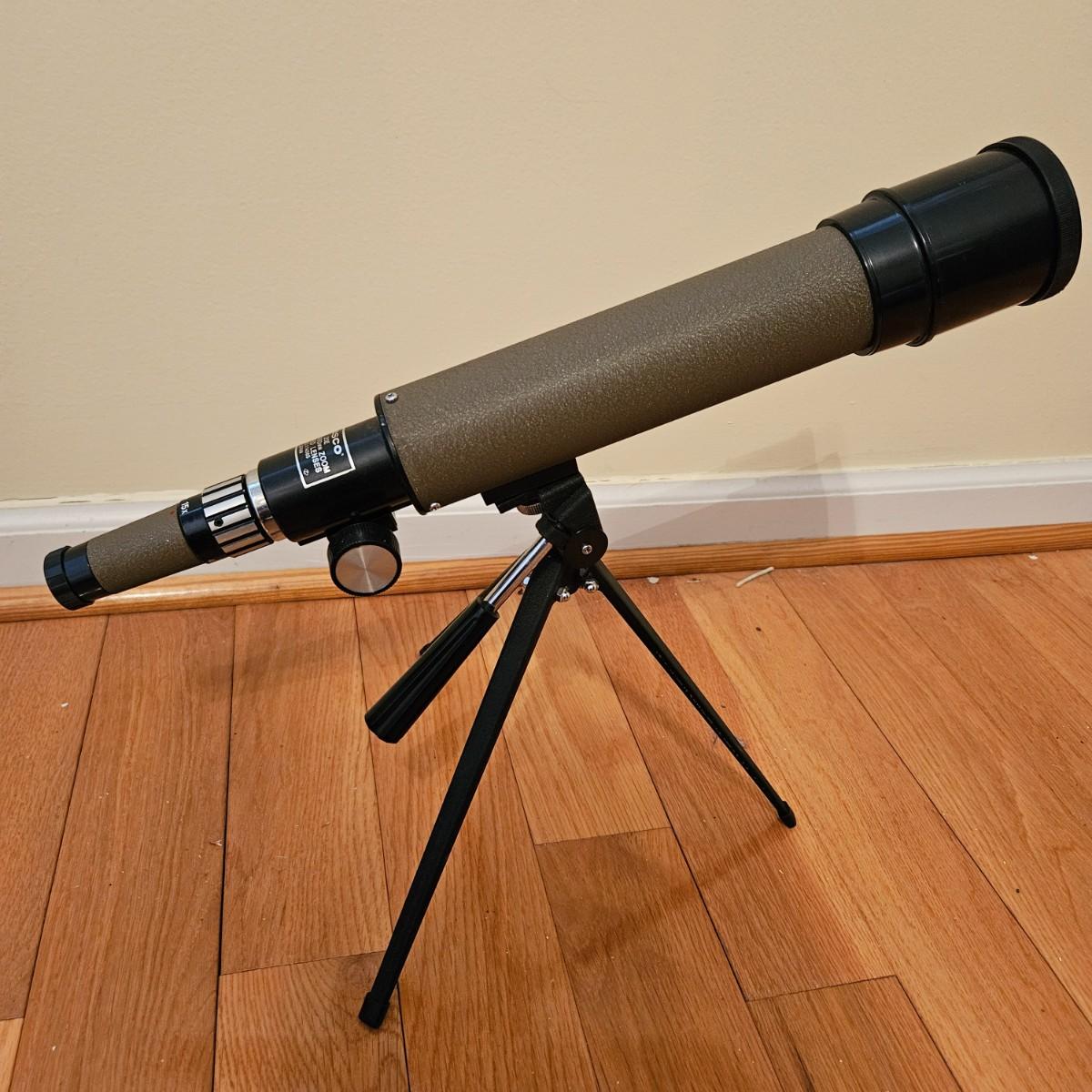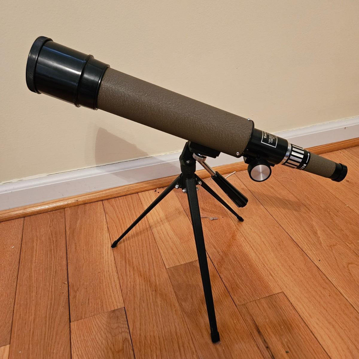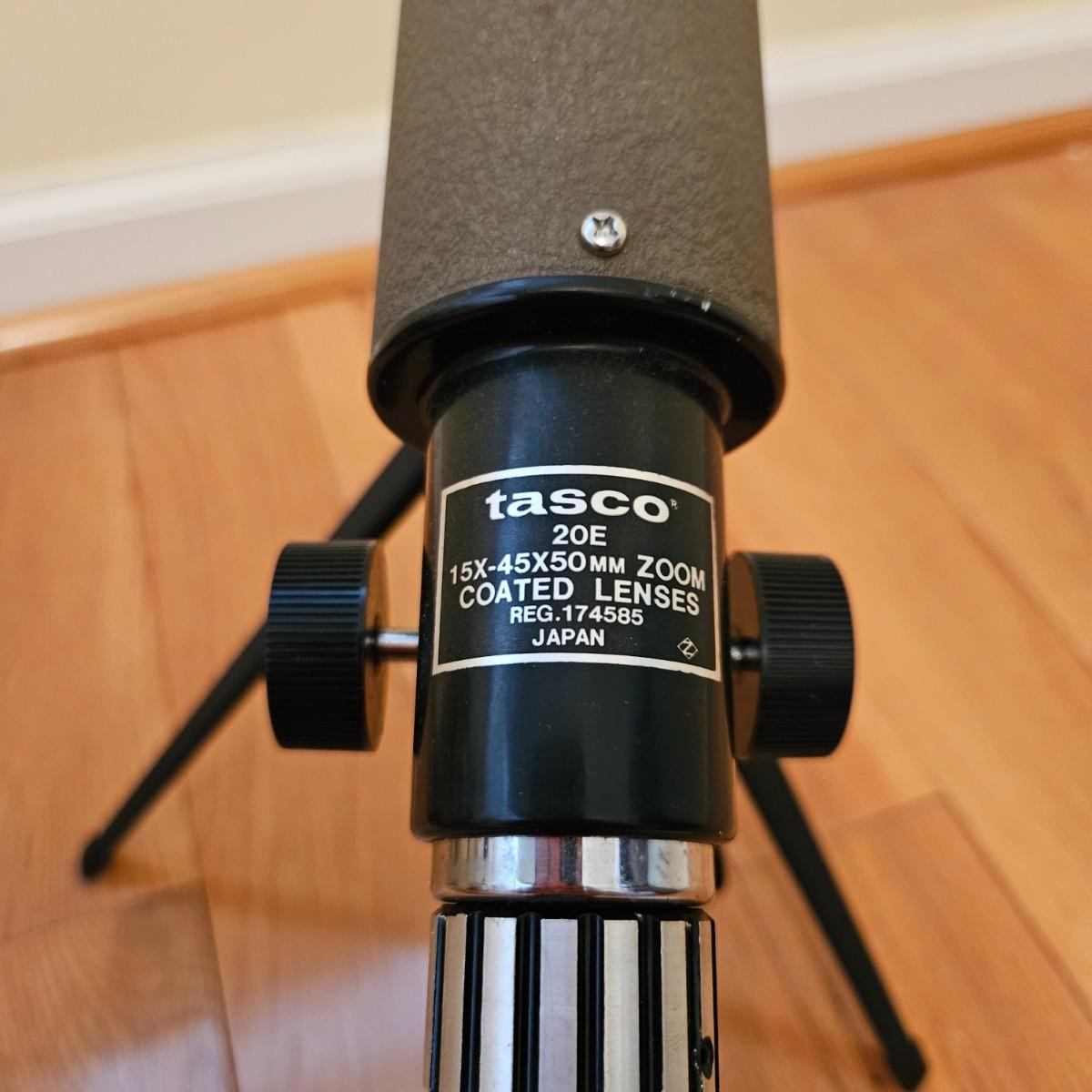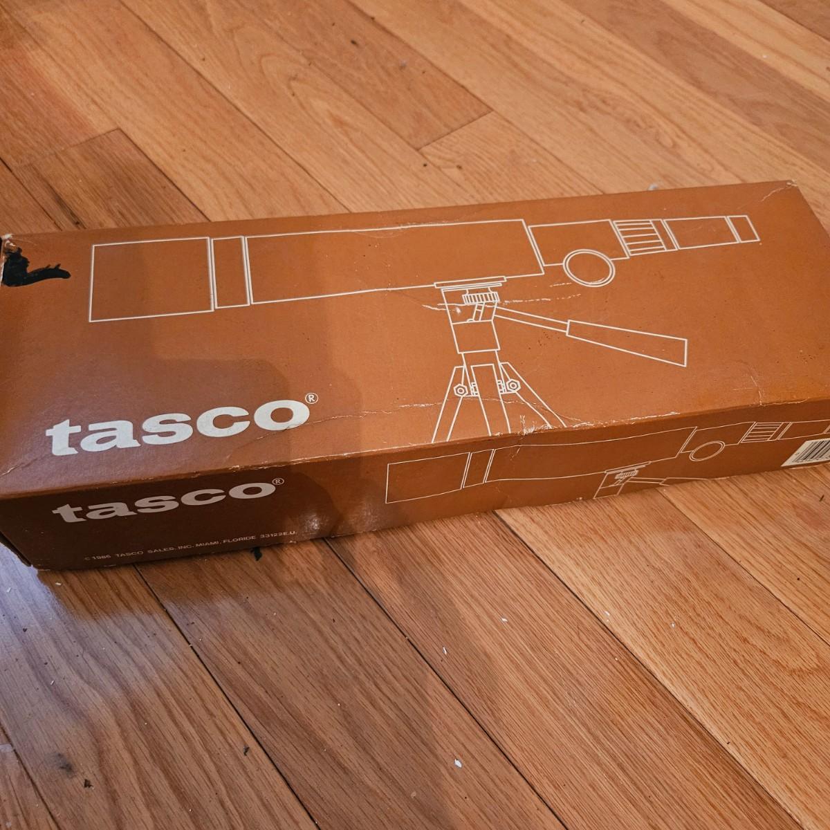 A Tasco 15-45x50mm zoom spotting scope that includes an attached tripod and its original packaging. It measures approximately 17" x 11" x 12"H with the tripod. Box measures 18” x 6” x 3”. Shipping available