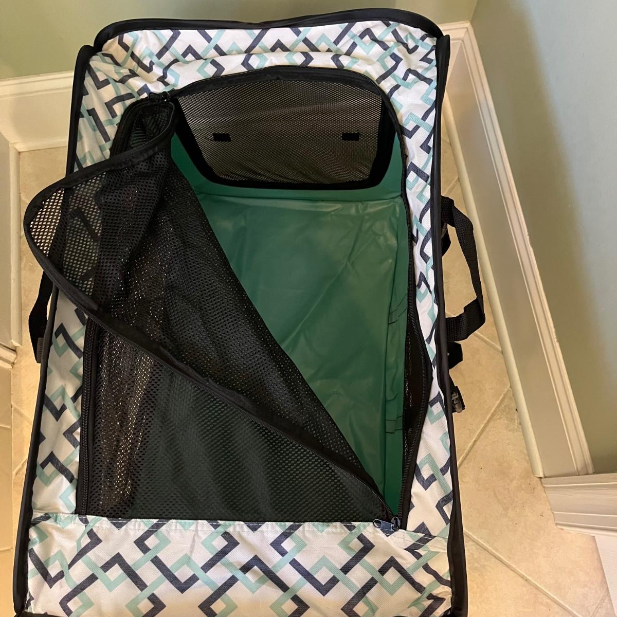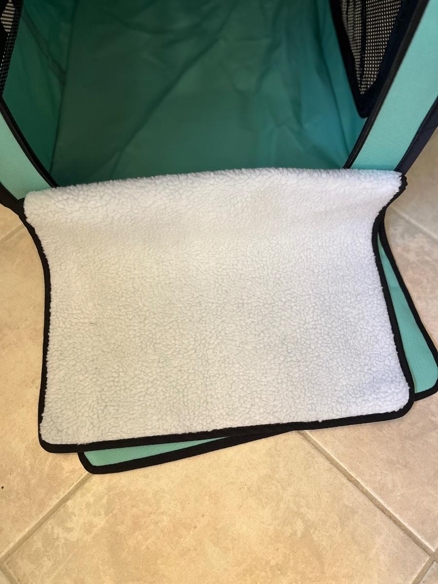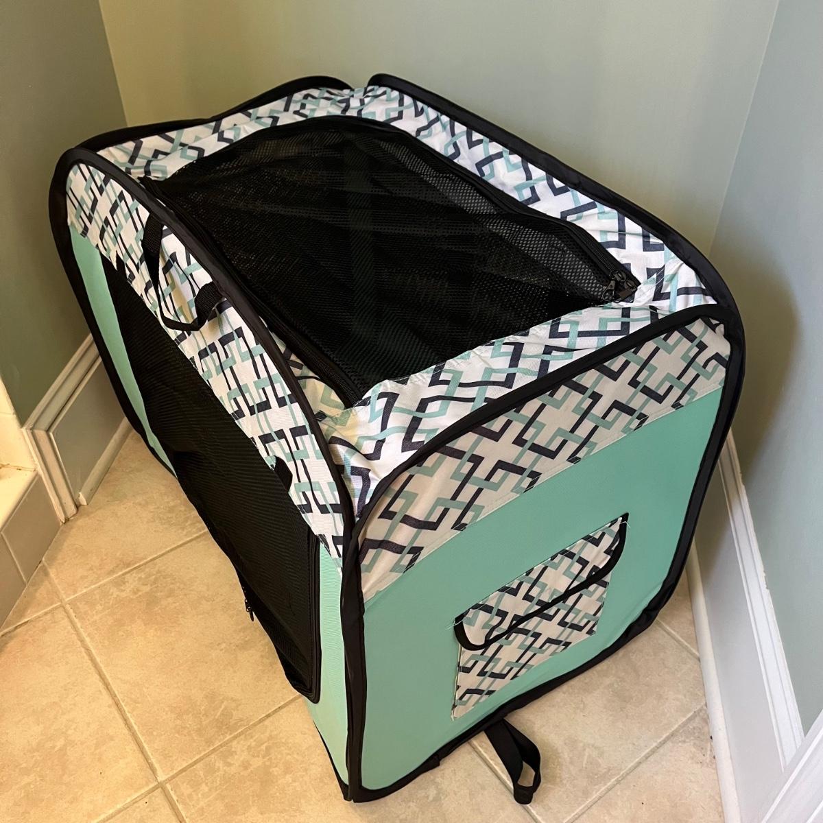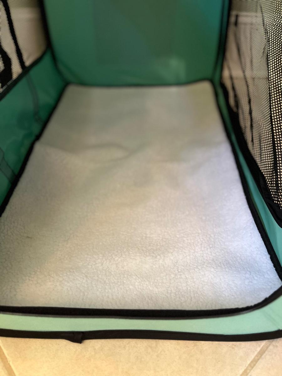 This is a portable, foldable lightweight pet crate, with two handles. Two of the sides, as well as the top, have zippered openings. The zippers are functioning smoothly. The side flaps have Velcro that keep them rolled up and out of the way when unzipped and one end has an envelope storage pocket. There is a removable liner with a soft lining on one side and vinyl on the other. The crate can be buckled into the car thru the back tether strap.