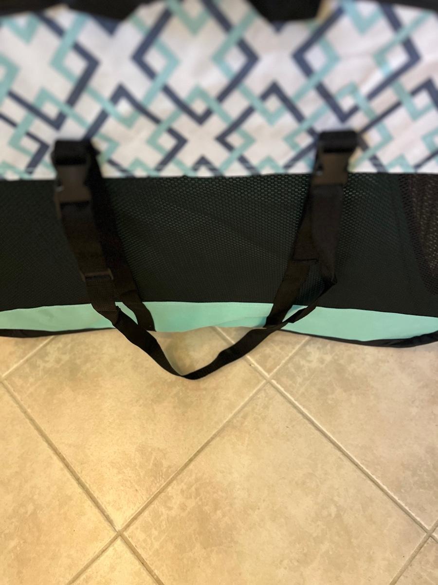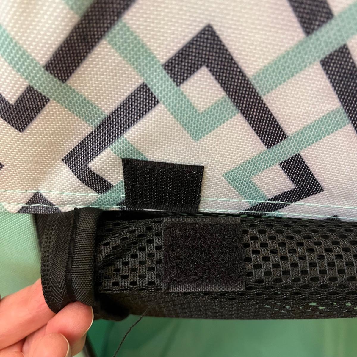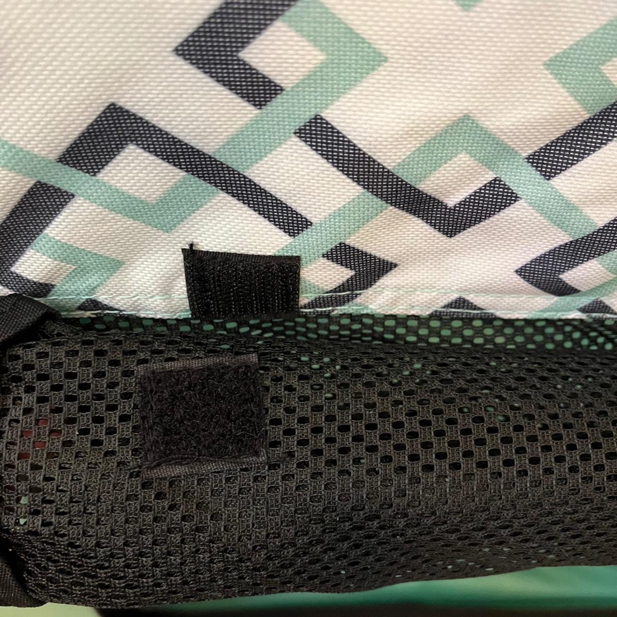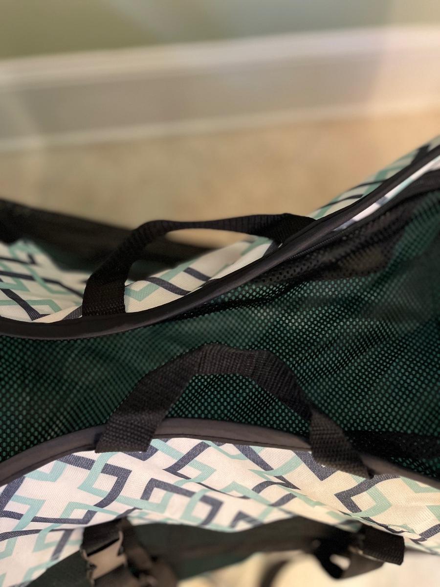 This is a portable, foldable lightweight pet crate, with two handles. Two of the sides, as well as the top, have zippered openings. The zippers are functioning smoothly. The side flaps have Velcro that keep them rolled up and out of the way when unzipped and one end has an envelope storage pocket. There is a removable liner with a soft lining on one side and vinyl on the other. The crate can be buckled into the car thru the back tether strap.