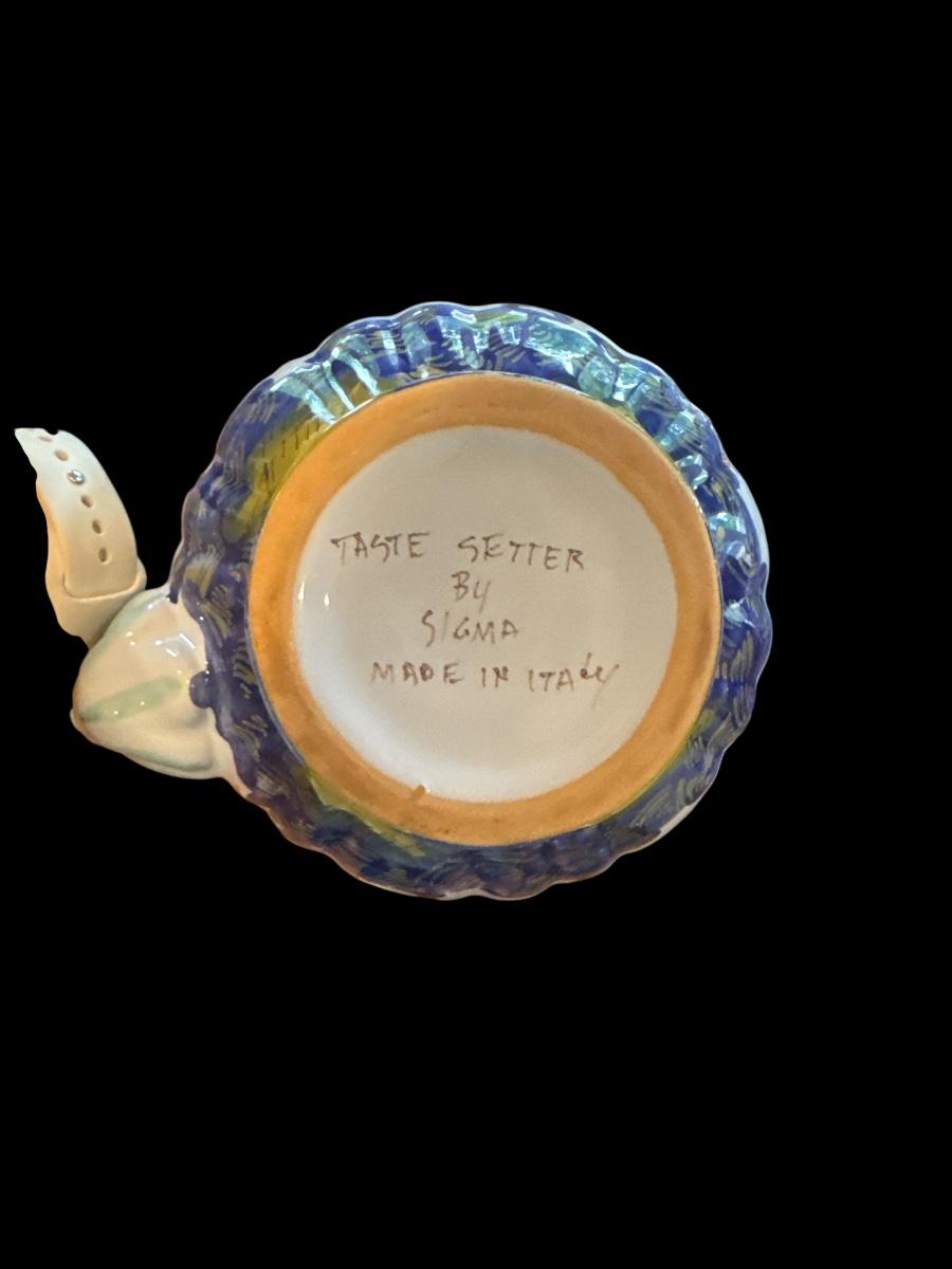Hand-painted Italian ceramic marked “Taste Setter by Sigma.” Features scalloped edges and vibrant majolica-style glaze. Vintage decorative serveware.