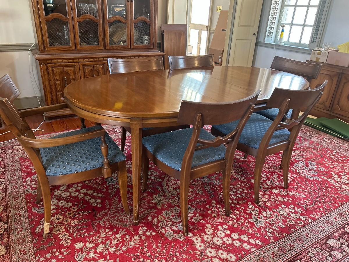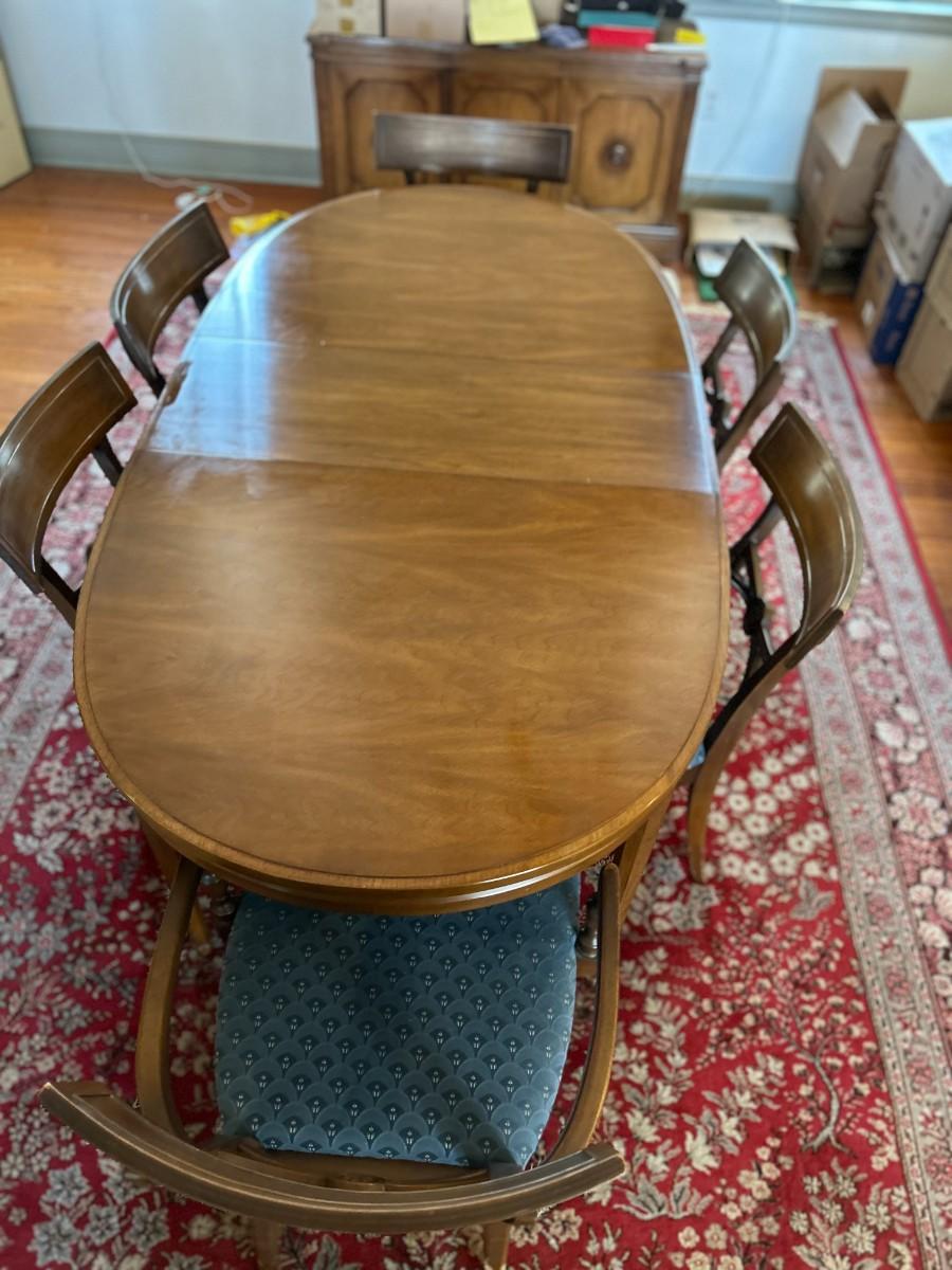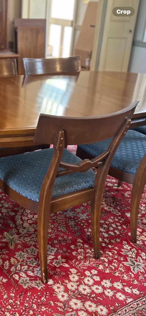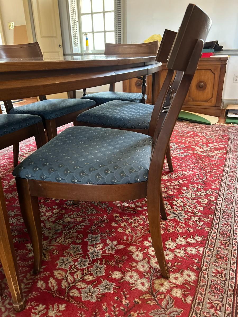 This beautiful MCM Dining set by American Furniture Company of Martinsville, VA has plenty of space for family and friends (or laundry). Table is 60lx38wx29.5h without any leaves, add one to get 74 inches long and a whopping 88 inches with both leaves. Chairs are covered in a classic but muted blue and gold fan fabric which were found to be a delectable treat for the dog. No matter which size, there is a protective mat to keep the table looking as gorgeous as it did on day one. BTW...if you choose to fix the chair legs, there are two ways about it, my way and the professional's way.